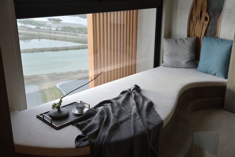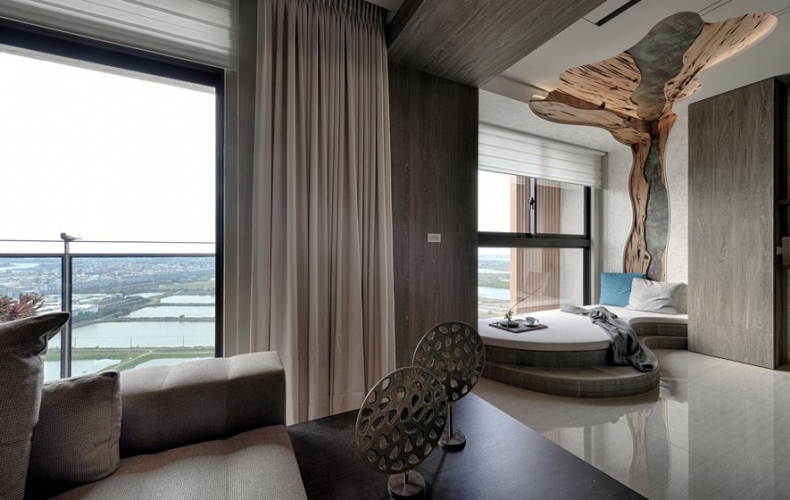 客廳一隅的樹形臥榻,拾階座臥,眺觀海景,帶出最貼近水天一色的自然情懷。設計師以空間為雕塑品,微塑出自然型義的樣貌,並以融入裝置於居所,讓樹與海間自然原生產生對話,成為家中重要的精神端景。