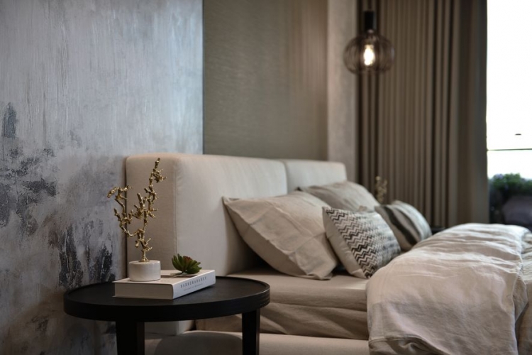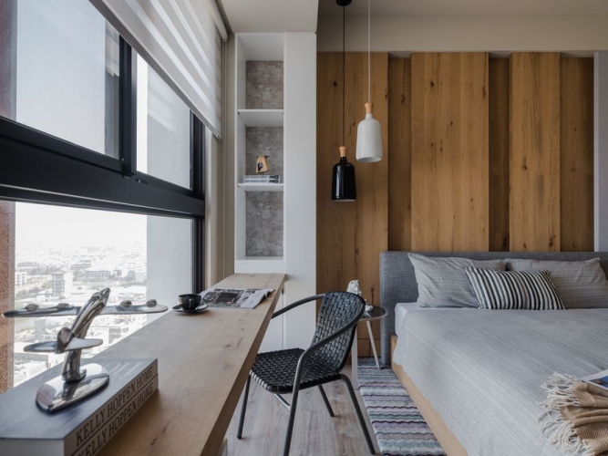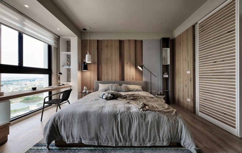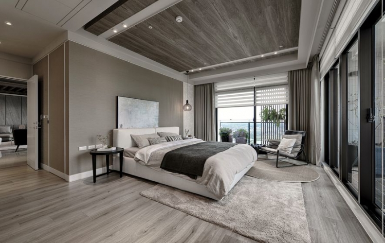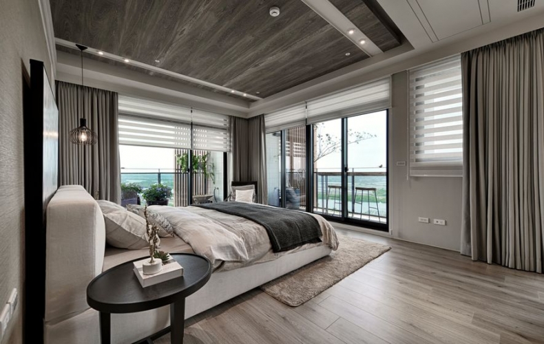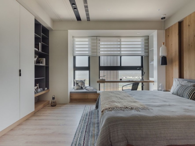 沉穩的木質調,彷若海砂與岩的硬質地,為空間劃出主幹。廳間地毯紋理有如海浪波動線條,動態如海潮起伏,輔為空間的軟質地。多樣的木質色層次運用於櫃體或地壁面,加深了自然感知。空間之於住家間的語彙,充滿了人因與貼近生活樣貌的對話。海暮色之作,設計師期望以貼近生活性,傳達出人與自然、空間與自然,兩者間的情感連結與交流。因此大量以自然素材與植栽,應合室外玻璃帷幕通透出的自然觀景,讓室內外相融成趣,回應初衷。