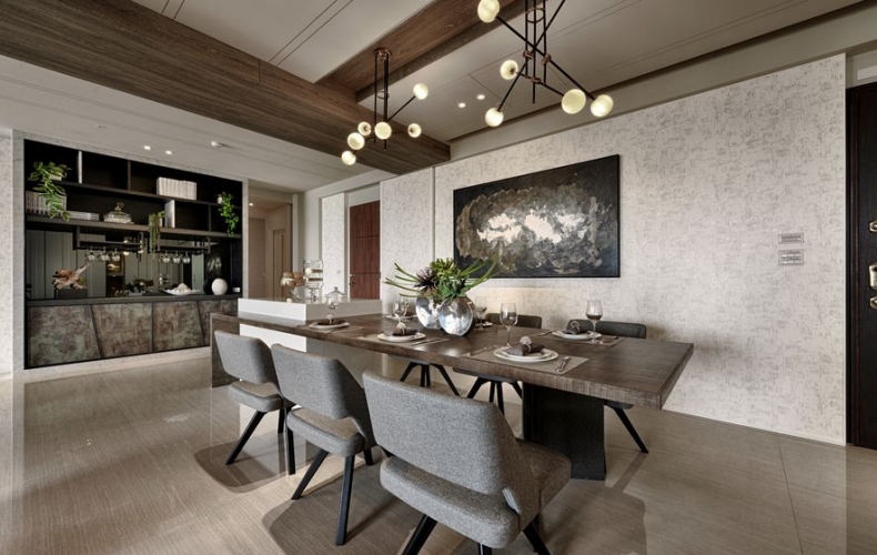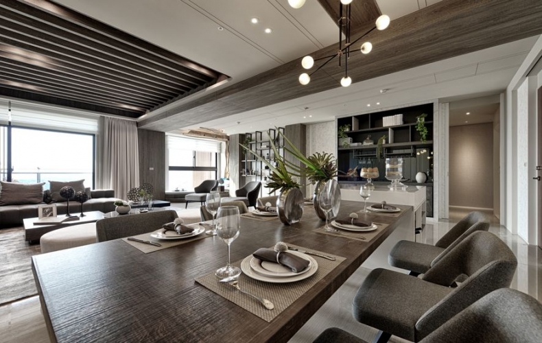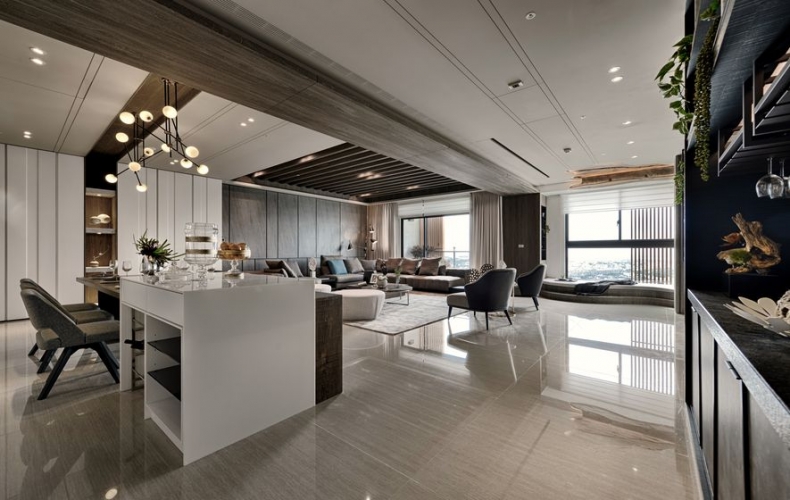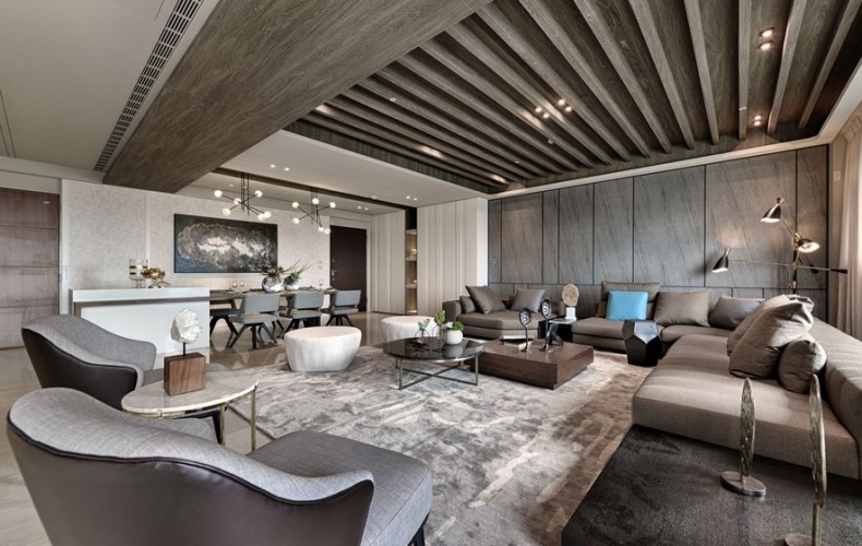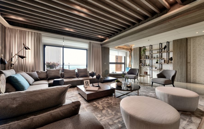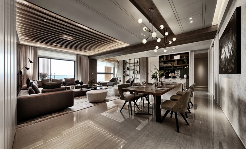 輔進廳,沉穩的調,以雙廳中的鐵刀色木樑,畫出大片的延伸。L型的低彩深咖啡大沙發,呼應著與背牆同系的木色,交織一片寧靜安詳。空間盡以海景之色作鋪陳,幕色之彩為輔,將海的深沉與寧靜,彰顯於裝置中。