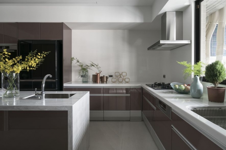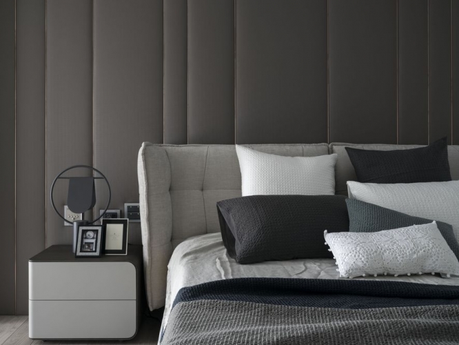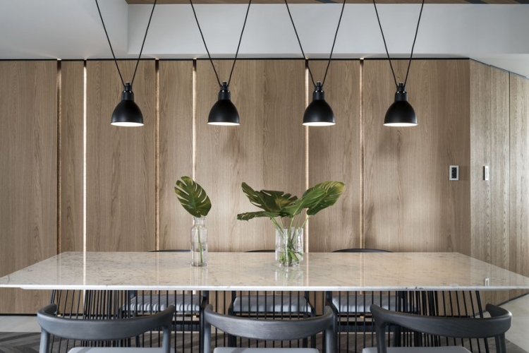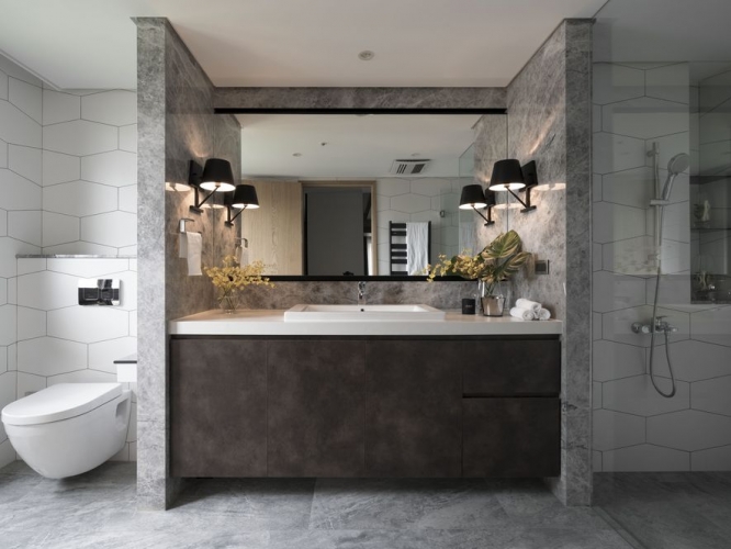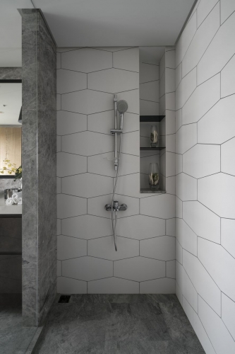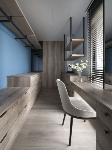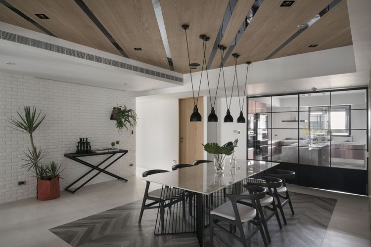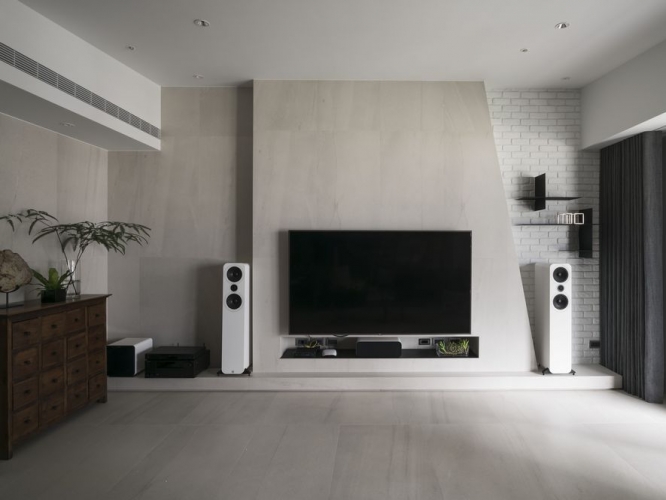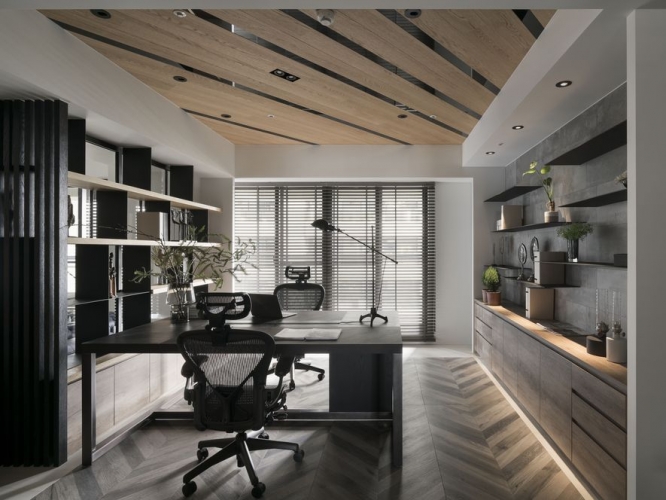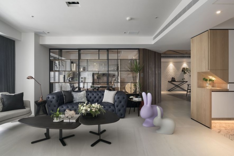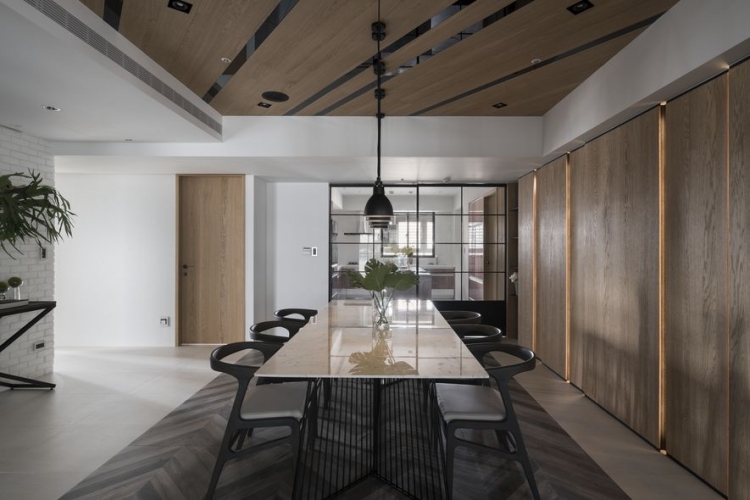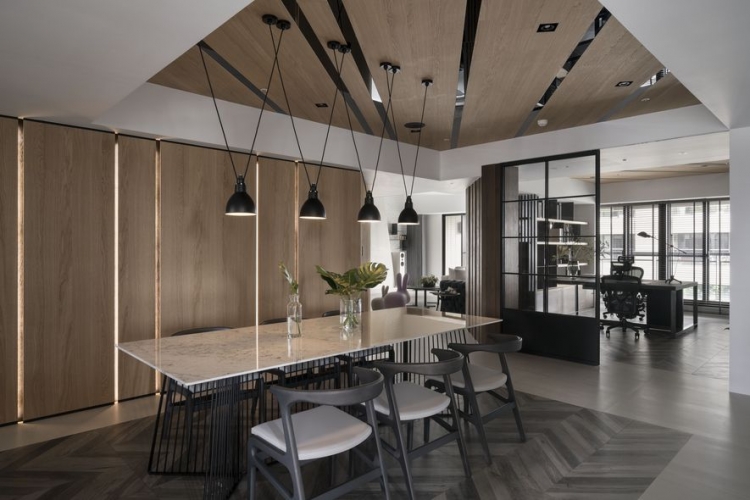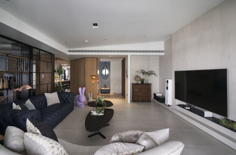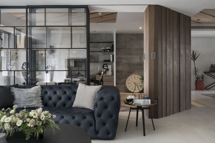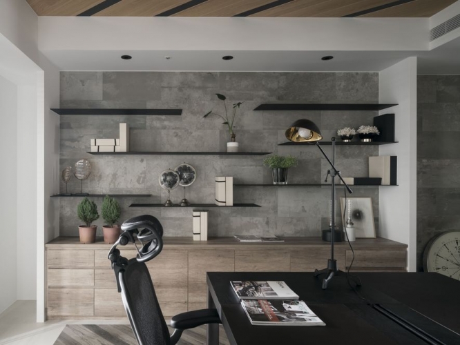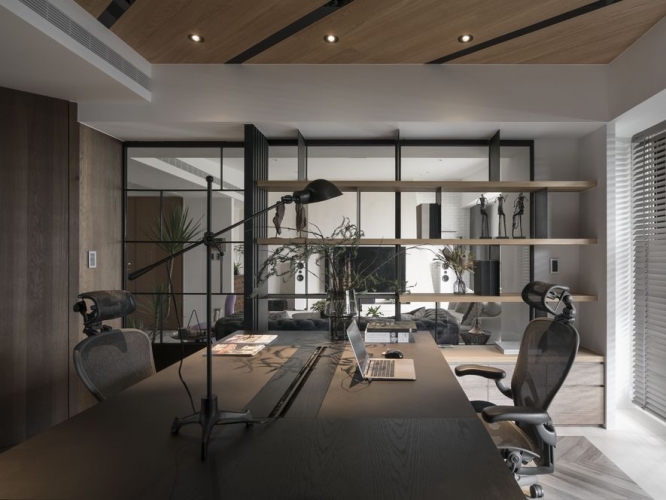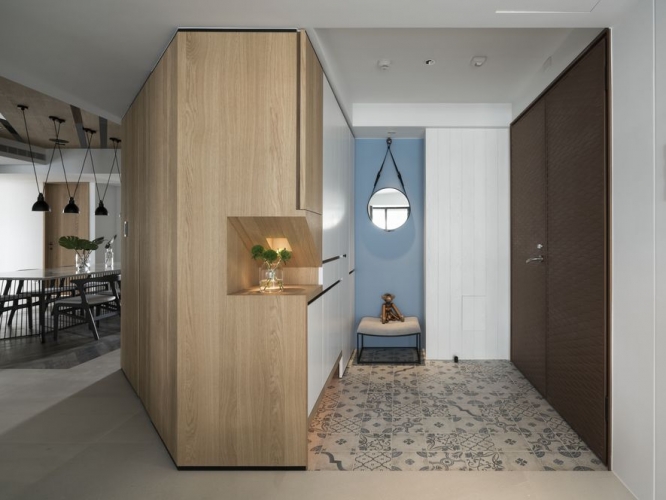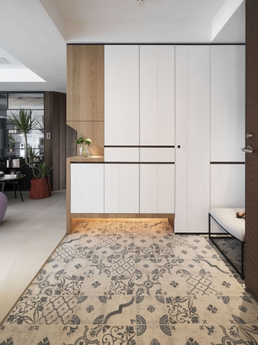 花磚的微笑,深淺色木皮的層次轉換,善用木皮、鐵件,與復古風的沙發搭配,整個無懈可擊,透過我們的手,轉譯了急診醫師要的家,無壓、愜心的居住空間。玄關之後是寬敞明亮的客廳,電視牆以素雅色,無華麗綴飾,斜向的天花板讓人有更寬闊的視覺感受,讓家人感到舒適寬廣。書房的玻璃門牆,帶出文青風,讓復古變的時尚又俐落,寧靜的書房在規劃下,完美與客餐廳結合,形成獨立又通透的大空間。運用燈光,讓微小光線在各角落綻放柔和氛圍,映出設計的巧妙,這就是微光的由來。