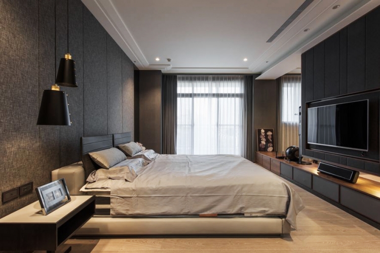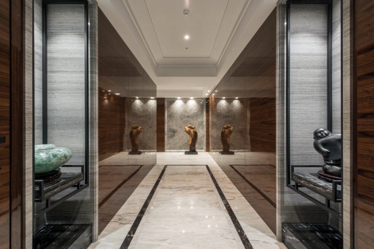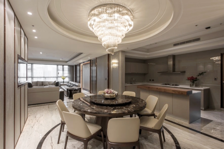此案為兩戶打通的空間格局,在整體空間架構,運用簡潔的線條將天花板拉長空間,界定場域範疇,以客廳、餐廳作為 凝聚感情的中心,將家庭擁有的情感、溫馨及和諧抽象化,在玄關處營造迎賓的氣勢,透過藝術精雕,展現主人藝術氣息,以流通的動線,嶄露擁抱的姿態。設計上,以擁抱後的感動及情緒波動轉化為天花板的流線,運用垂直、水平元素勾勒玄關隔屏及櫃體,並以柚木色作基調和自然的石材肌理,構築空間的層次及延展性。