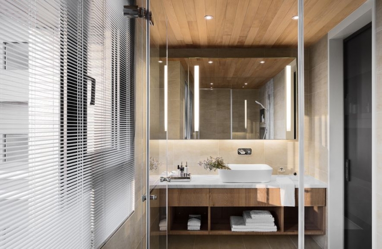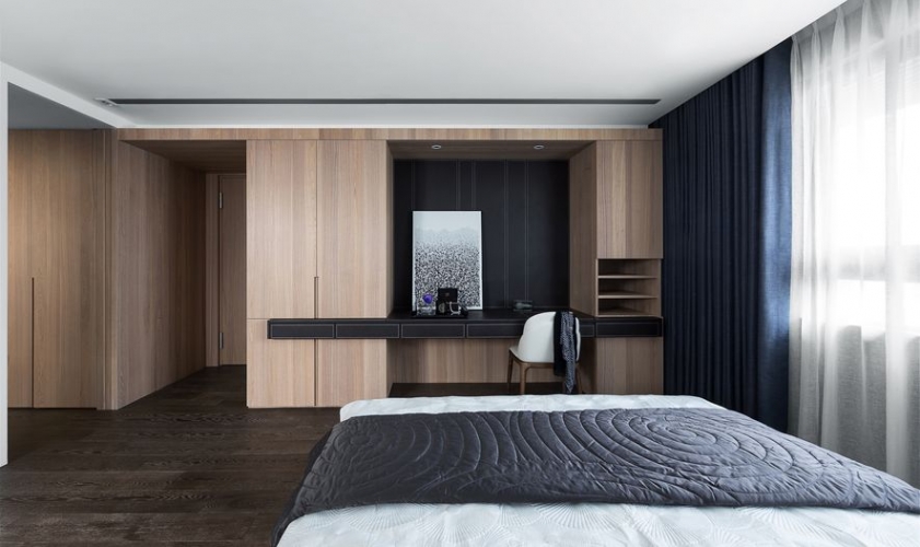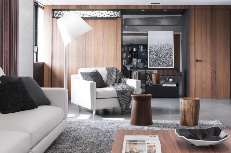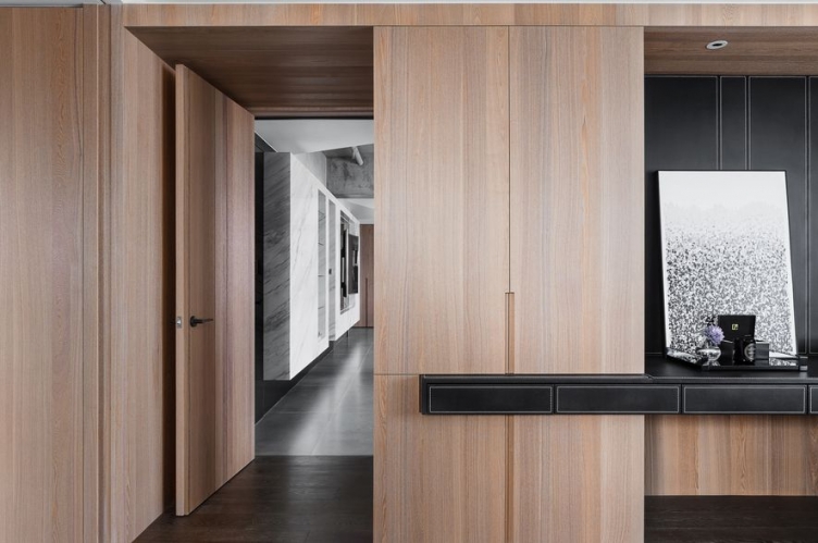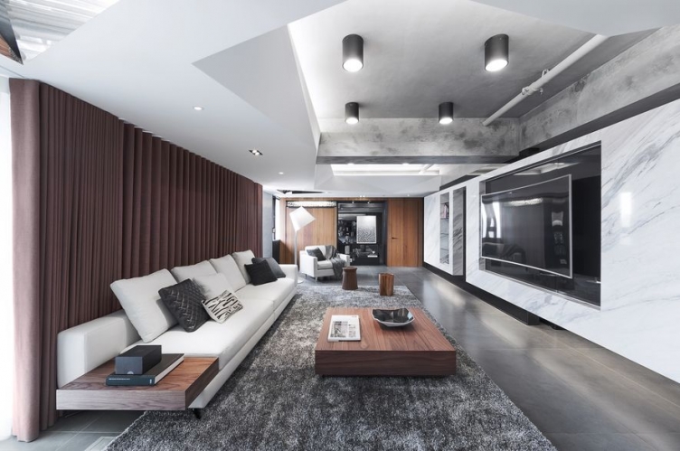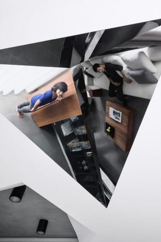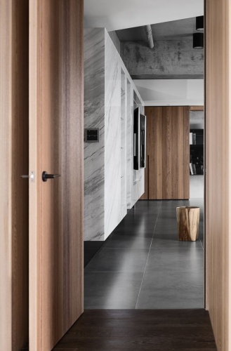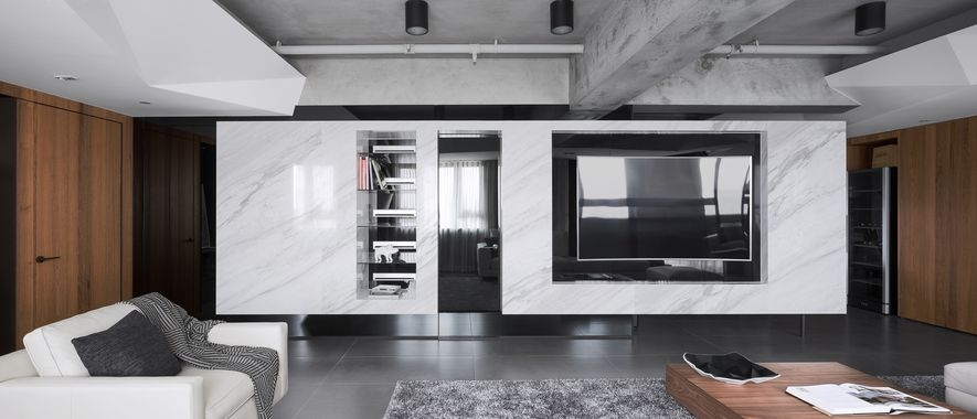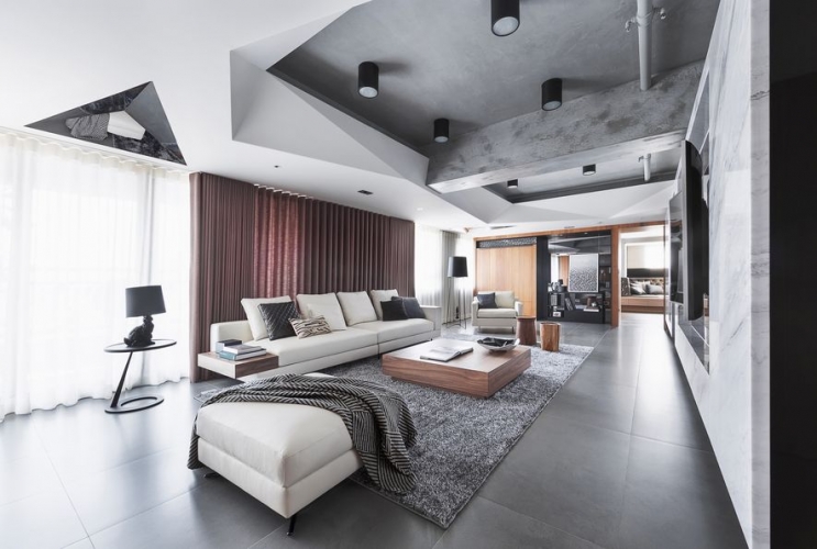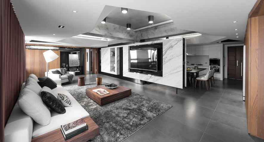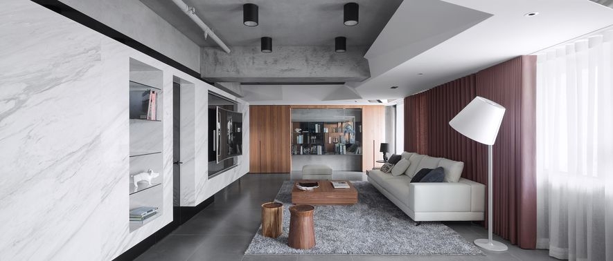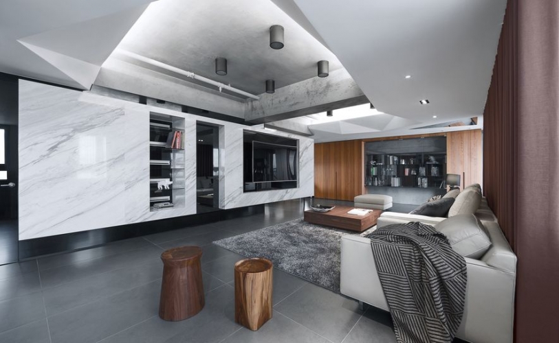 折板與萬花筒的概念,正是為了我們期待這生活的容器,能充滿想像力與趣味性,生活並非單一的固定模式,把空間的想像力,視覺的趣味,傢俱陳設的自由度留給家人,那種感動是低調真實並持續不斷的在生活中上演。並利用材質的對比,呈現獨特質感及衝突美感,在採用顛覆性思維的天花折板線條空間中依舊保有住家溫潤的氛圍