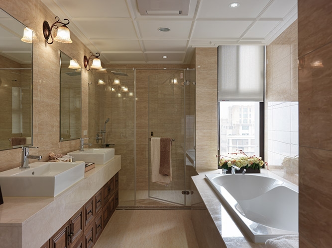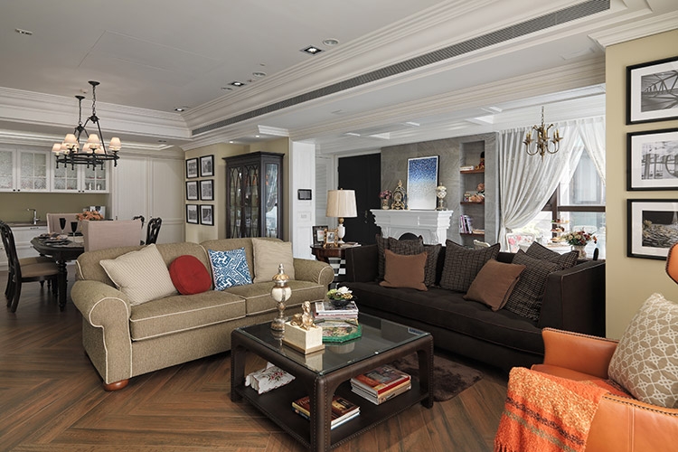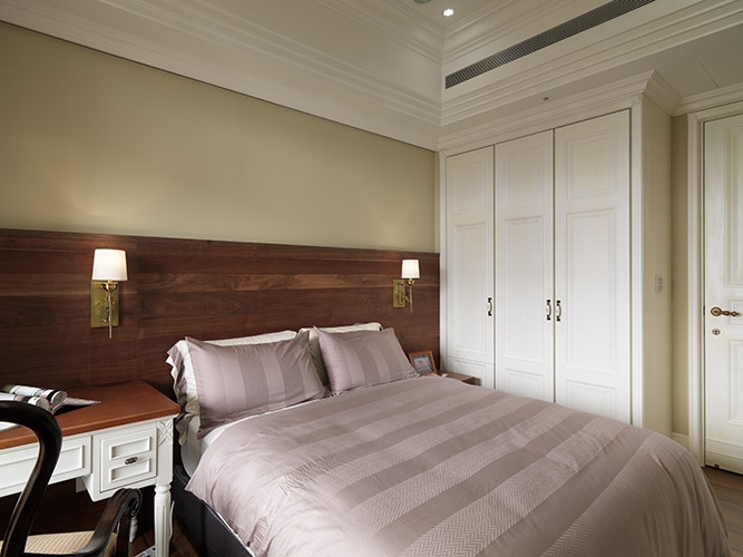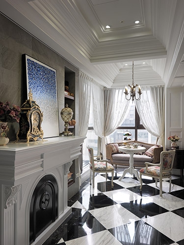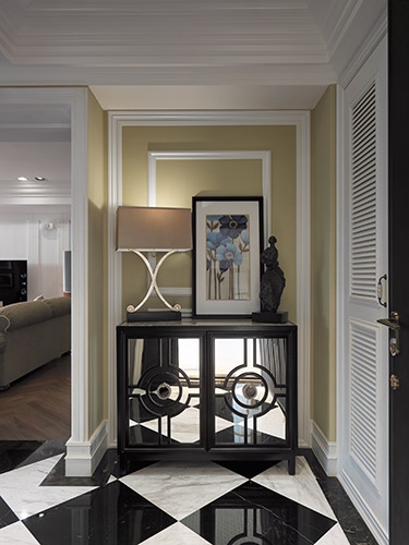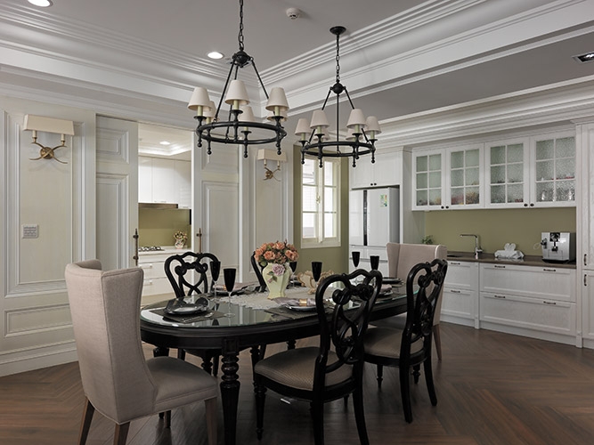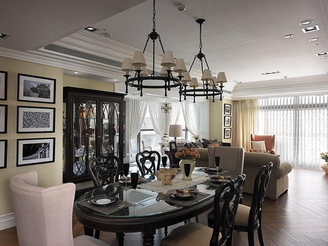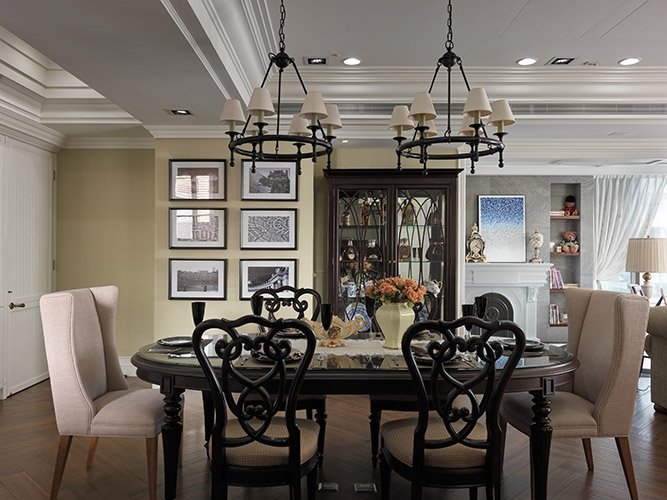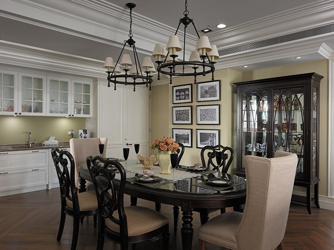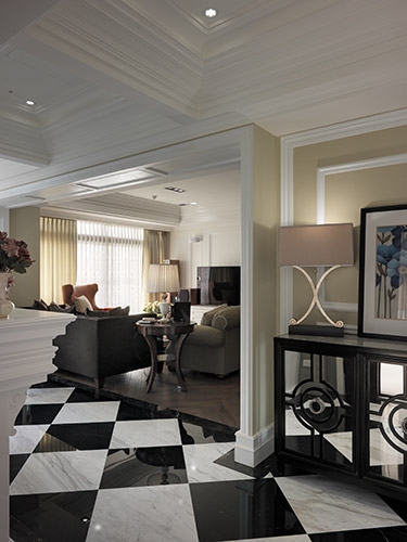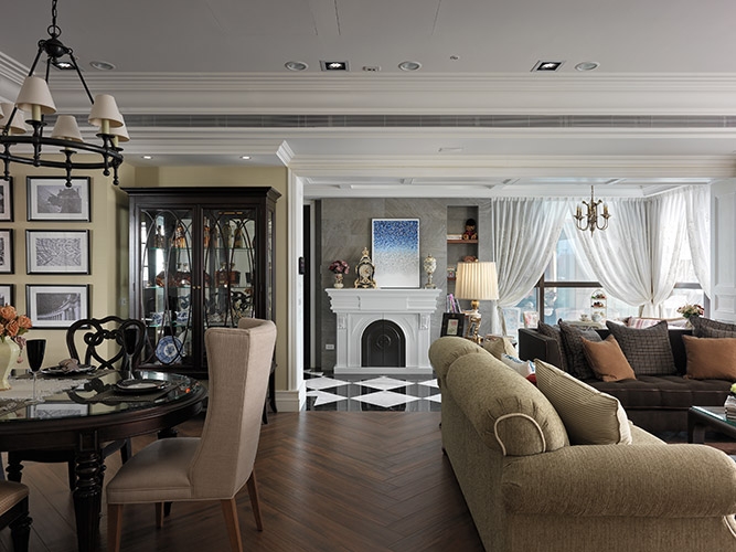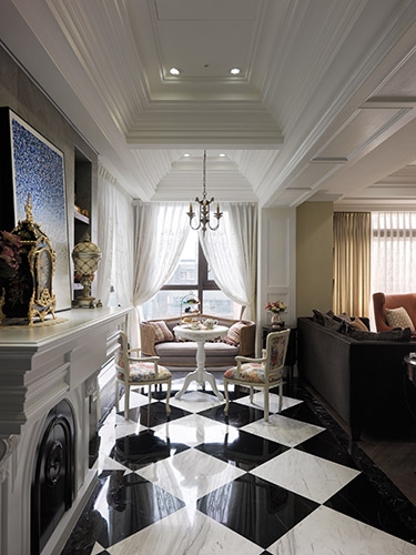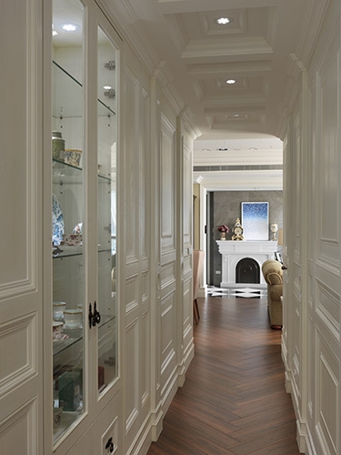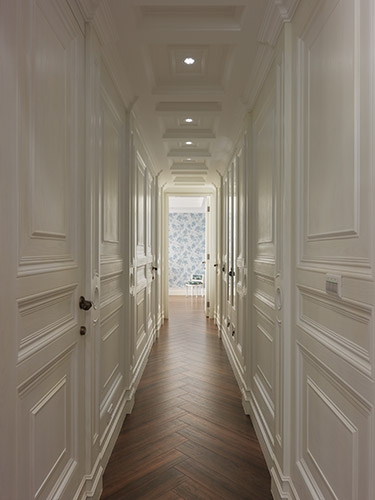 古典風格營造成功與否,在於細節尺度的精細拿捏,尤其是對稱比例的細緻講究,多達十幾層的線板天花挑高大器尺度,同時分界開放空間的場域獨立性,湯鎮權設計師並克服施作難度,以木紋磚拼貼人字地坪線條,另外還需在門不對門的風水限制下,營造對稱細緻的廊道線條,以精工水準呈現過人功力。