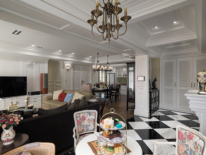描繪精美圖騰的骨瓷杯裡氤氳出底蘊深厚的伯爵茶香,三層下午茶盤架上的scone也散發著誘人香氣,浪漫唯美的英式下午茶已然準備就緒,這不是五星級飯店裡的貴婦下午茶餐廳,而是湯鎮權空間設計事務所,為本案女主人量身規劃的下午茶區。湯鎮權設計師堅信,「設計能創造全新的生活經驗」,再一次的合作機會,拆除建商原安排的和室改以下午茶區規劃,接續玄關地坪黑白交錯的菱格線條,引動落地窗光,打造唯美浪漫的入門風景。