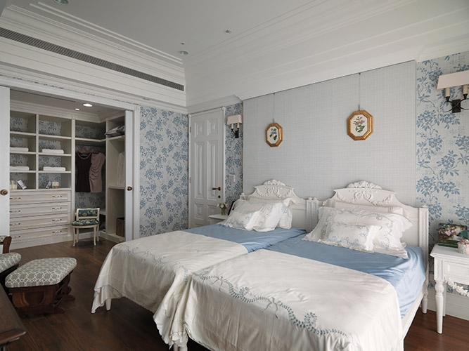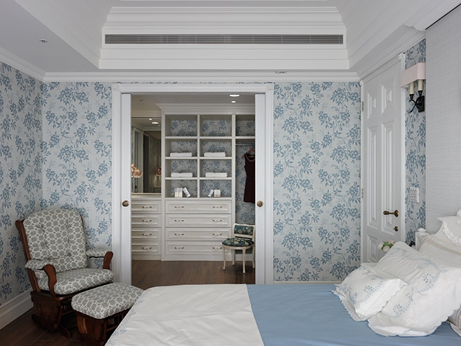 框築了細緻唯美的框架,在傢飾配件上則透過不成套的家具選搭,鋪陳內斂且有味道的生活感,另在主臥房中選用水藍色圖騰壁紙增添空間暖度,並延伸進更衣室衣櫃底牆形塑整體感,而紋理特殊與風格到位的門片與門把選搭,更是設計師與屋主的完美合作。
