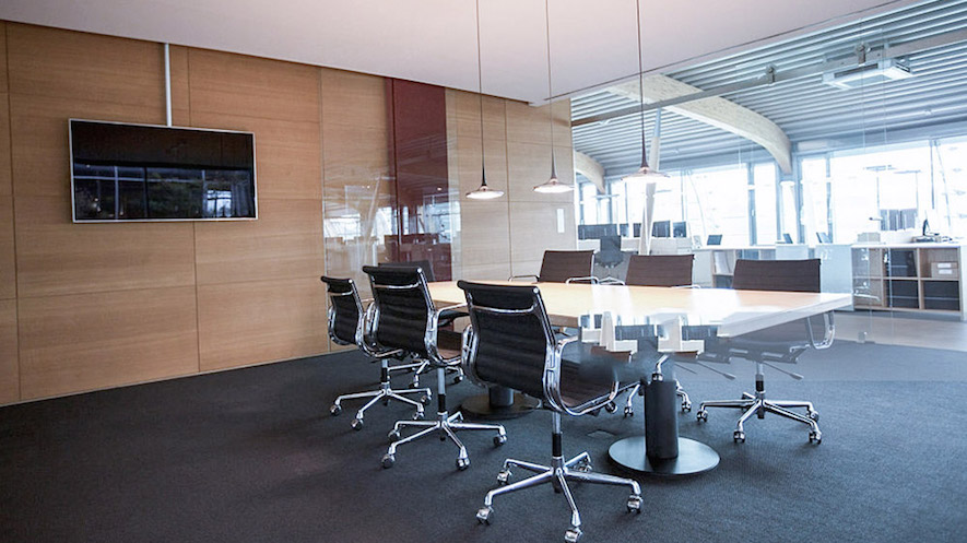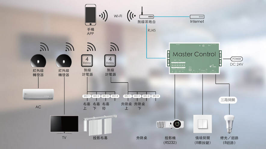會議室也經常成為接待貴賓的中心。O+設備客制化的情境功能控制不同會議燈光需求. 可以做到一鍵按下,同步調整燈光及空調,更可以打開電視,自動播放指定的公司簡介影片。