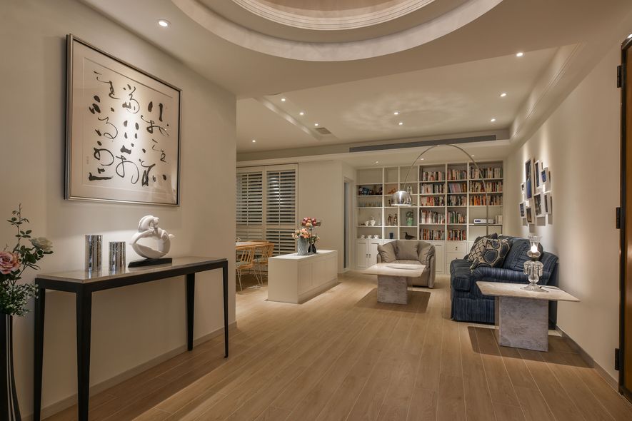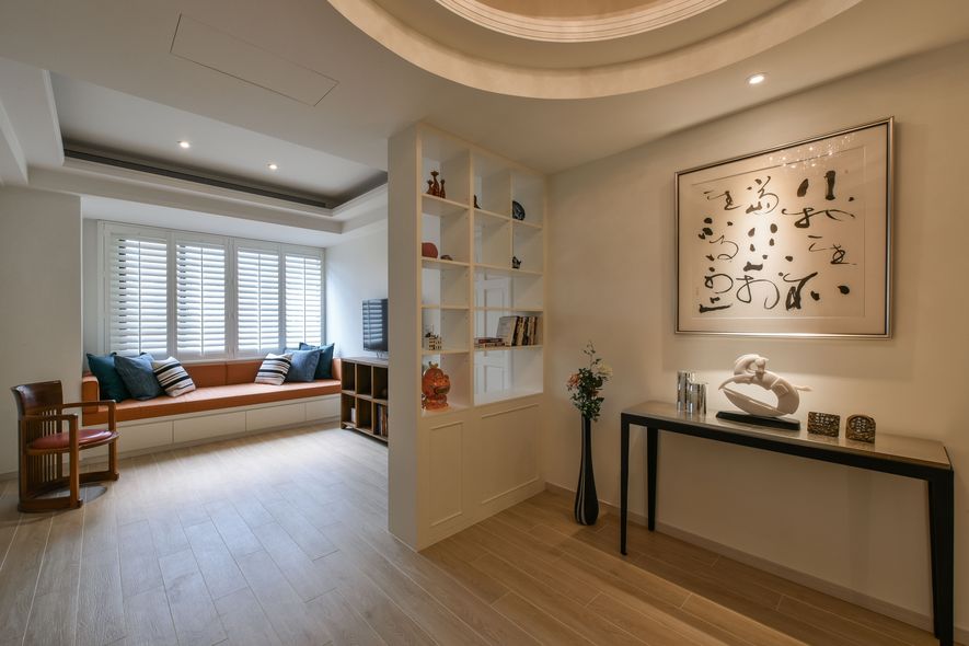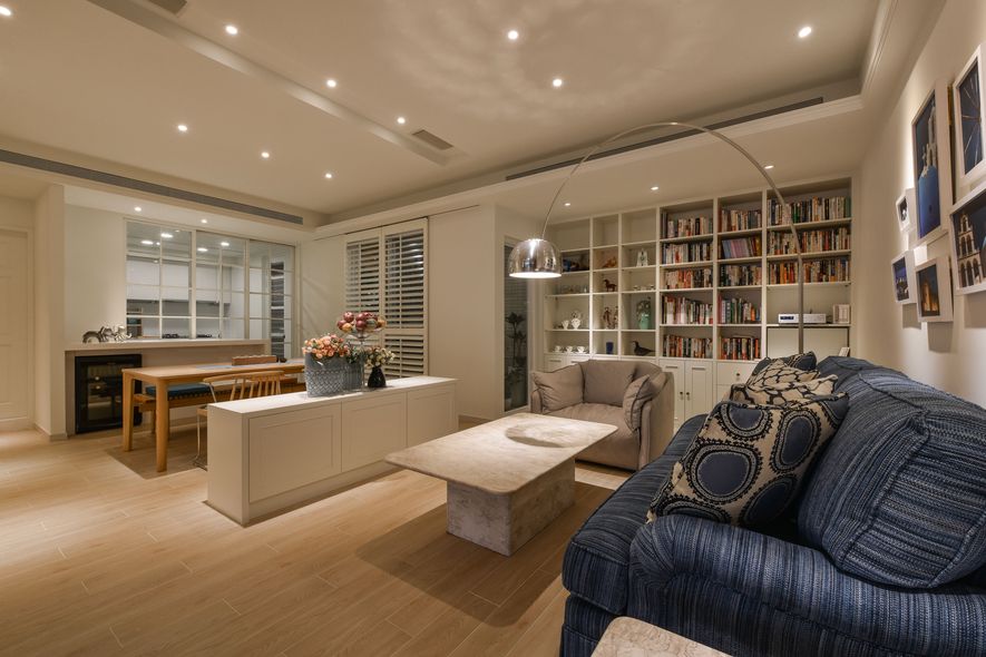 舒心的淺色氣息佈滿場域,焦糖色地板對應乳白牆面的溫軟調性,再以湛藍色沙發作為廳堂的主角,有如在一片白晝中注入天空色的記憶點,呈現空間的詩情畫意。