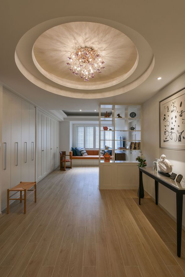 窗楞設計迎接大量光線,使整座場域明亮無比,而垂直的空間格局顛覆視覺體驗,尺度延展下凸現區域的大氣寬敞。捨去繁瑣的家具佈置,天花板如花蕊般綻放的燈飾成為最佳主角,點點燈線灑落於空間裡,佈置一片星網,烘托粉彩世界的清幽。