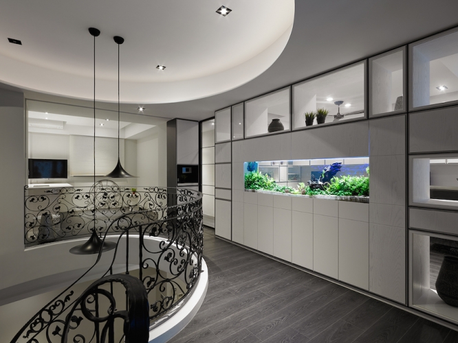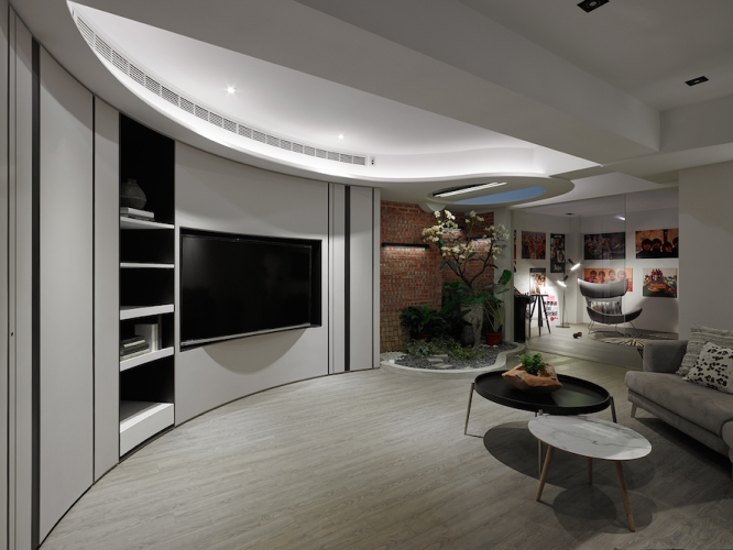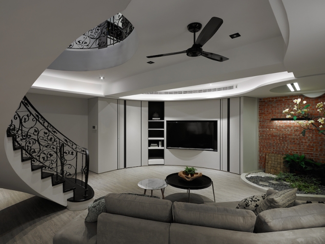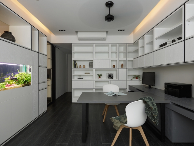 此案屋主是一對即將退休的夫妻,喜歡安靜恬適生活,對於開放式社交空間的需求不高,在空間規劃上希望融入各自的興趣愛好,讓彼此能自在的沈浸於雅興中,共同分享生活的樂趣。設計總監Doris 與設計師Ting深入了解屋主的需求後,以書房作為空間主軸向外延伸,並結合生活機能與美感設計,將綠色植栽設為空間的「點」與「線」,連結之間的距離,劃分出感性與理性相互交織的複合式居宅,每個角落都能看見夫妻豐富的生活經驗。