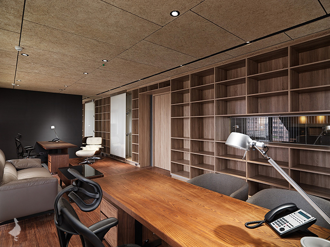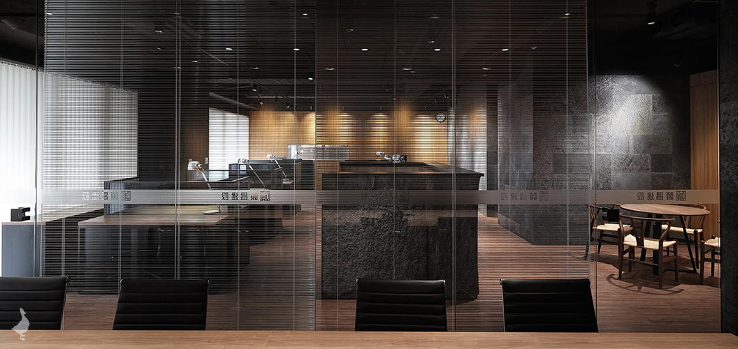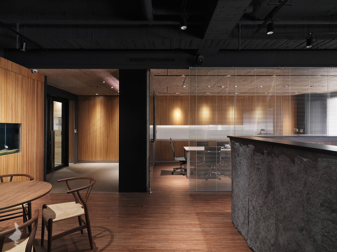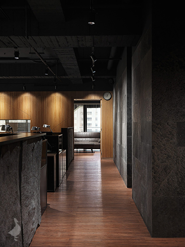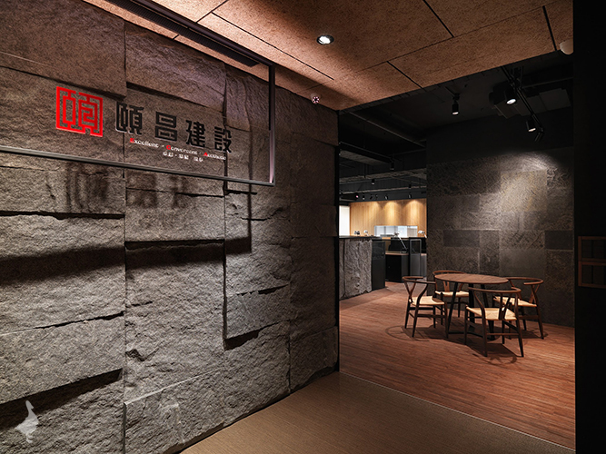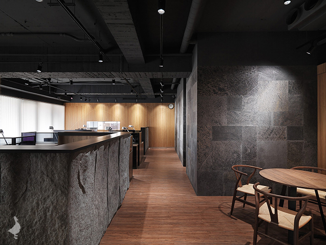 透過石皮及礦岩板獨有的凹凸紋路堆疊出面的層次,將設計的層面由XY軸延伸至Z軸發展,再結合木質格柵提升整體辦公空間的生活溫度,以垂直規律的線性排列出溫雅而奔馳的曲線,藉以削弱櫃體及門片分割線,延伸整體牆面的視覺感。