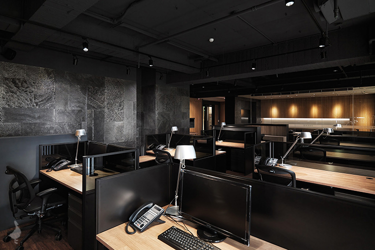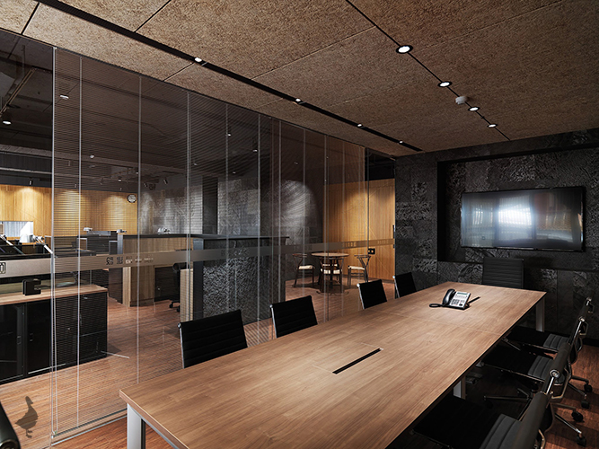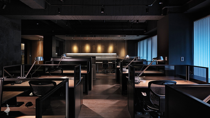 整體格局依著建物的大面落地窗,將使用最為頻繁的辦公及會議空間沿著採光配置,機能性的收納及茶水空間則沿著走道切割於隱藏的牆面中,利用動線劃分不同的作業領域達到空間的完美利用。