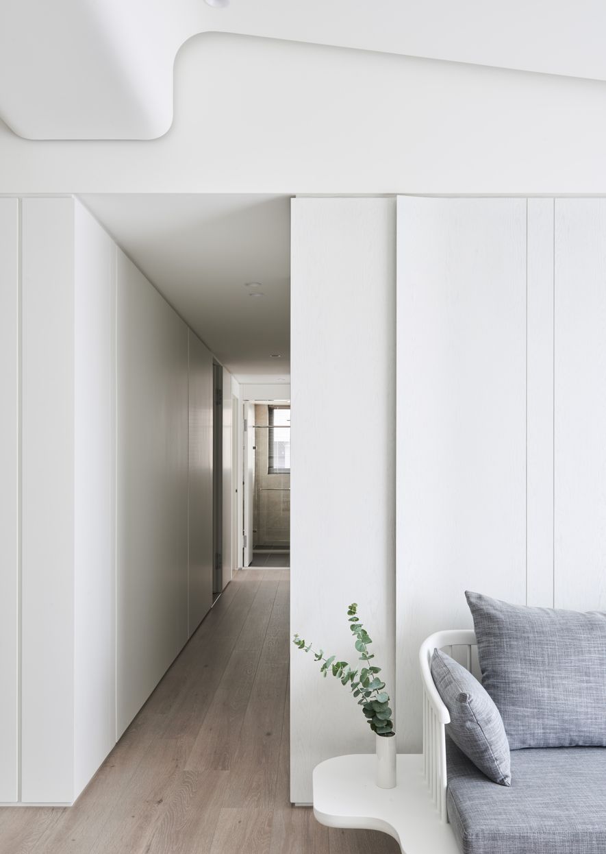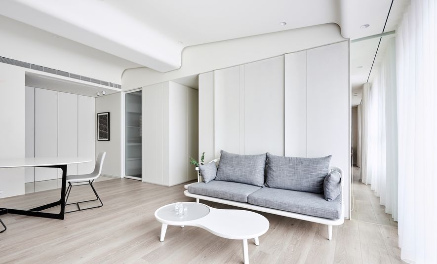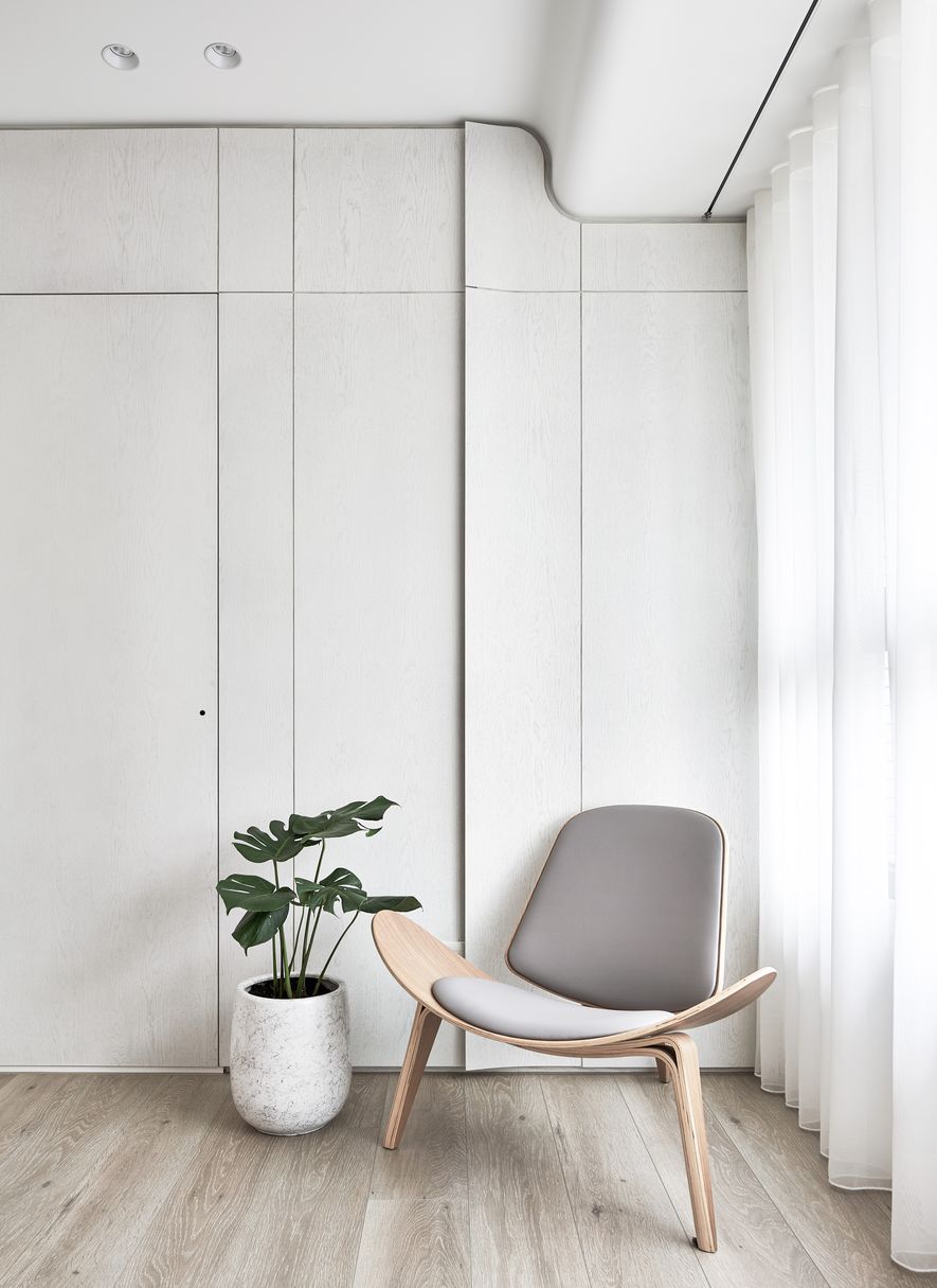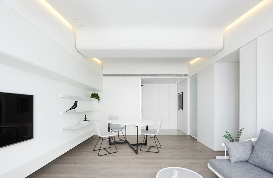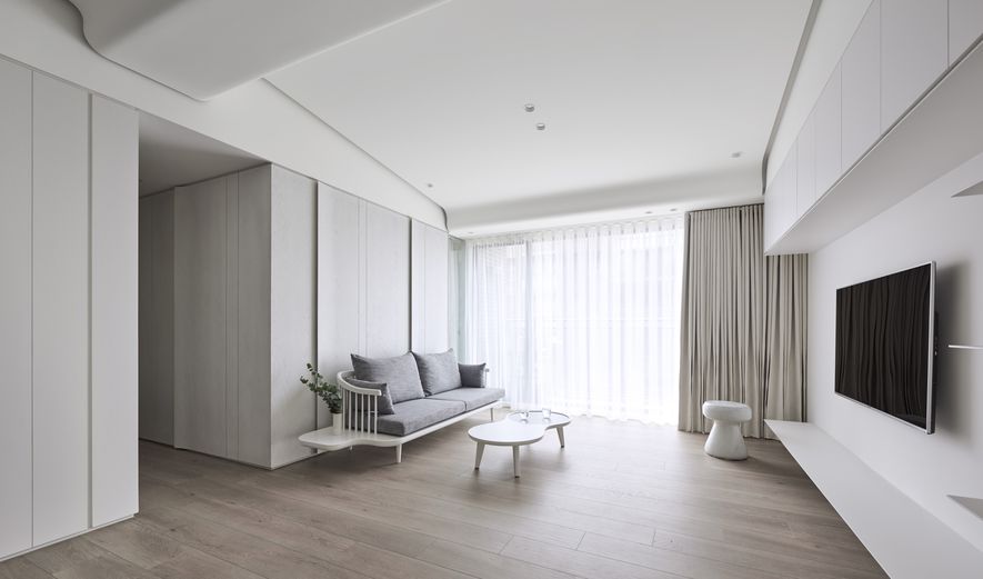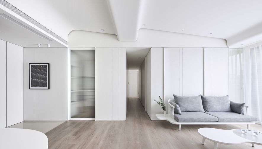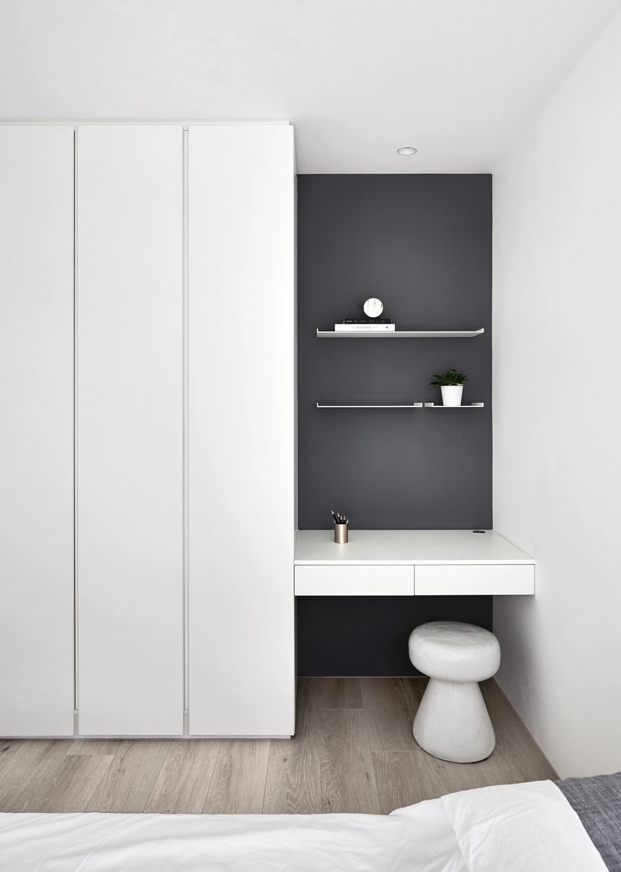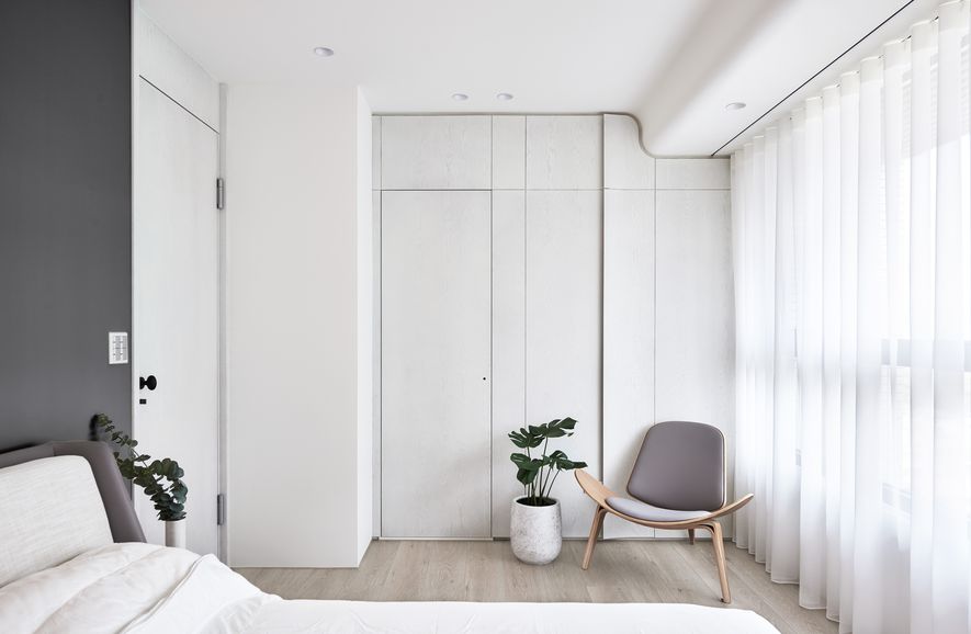 以木皮、噴漆、鐵件、系統櫃等不同的建材,應用在同一色彩-白色上。從主空間至私領域,不同深淺的白,放大了空間的視覺感,也象徵著年輕夫妻未來將攜手共度的明亮人生。