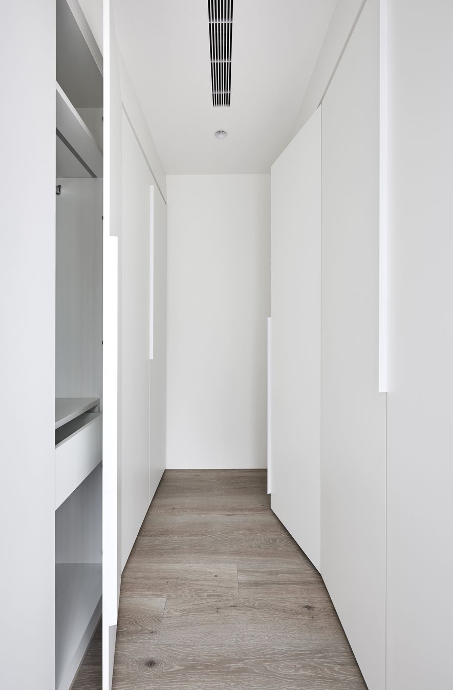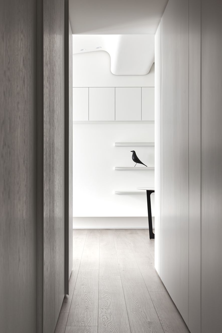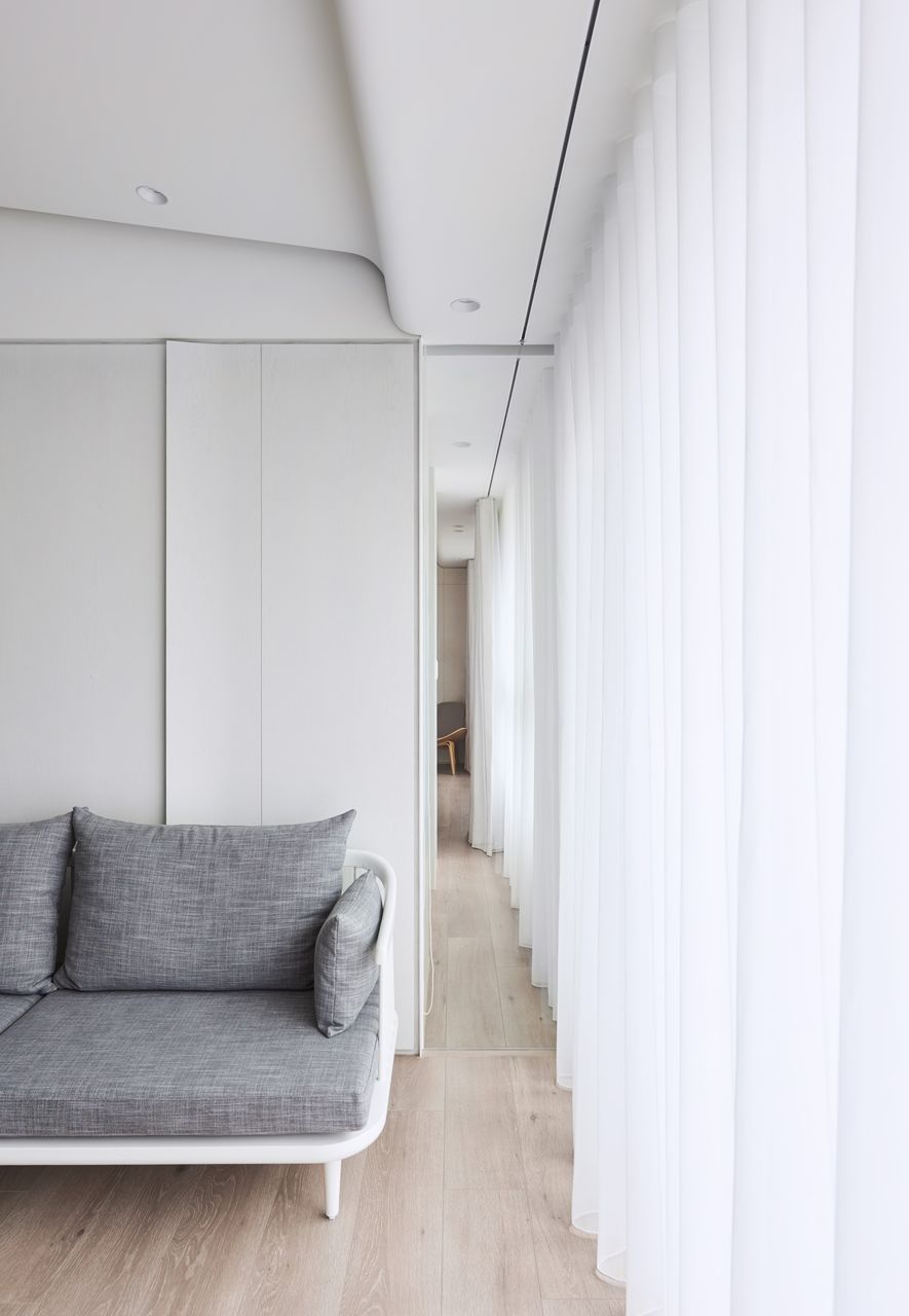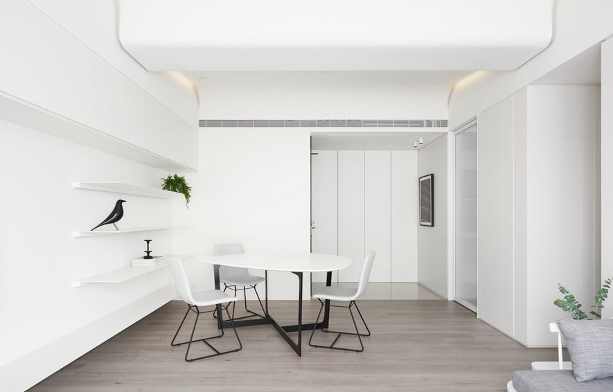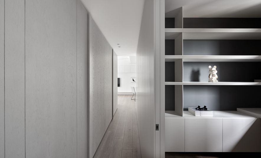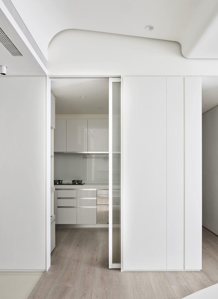 以木皮、噴漆、鐵件、系統櫃等不同的建材,應用在同一色彩-白色上。從主空間至私領域,不同深淺的白,放大了空間的視覺感,也象徵著年輕夫妻未來將攜手共度的明亮人生。