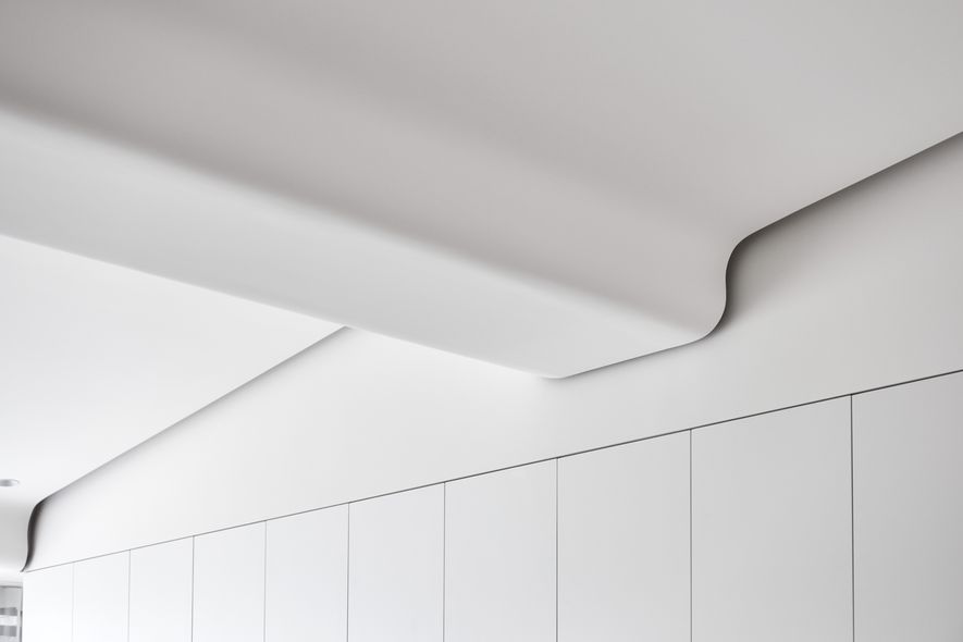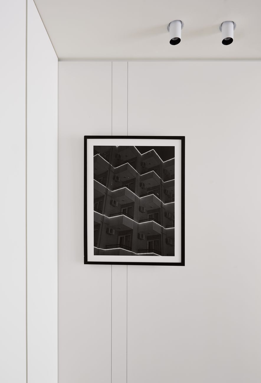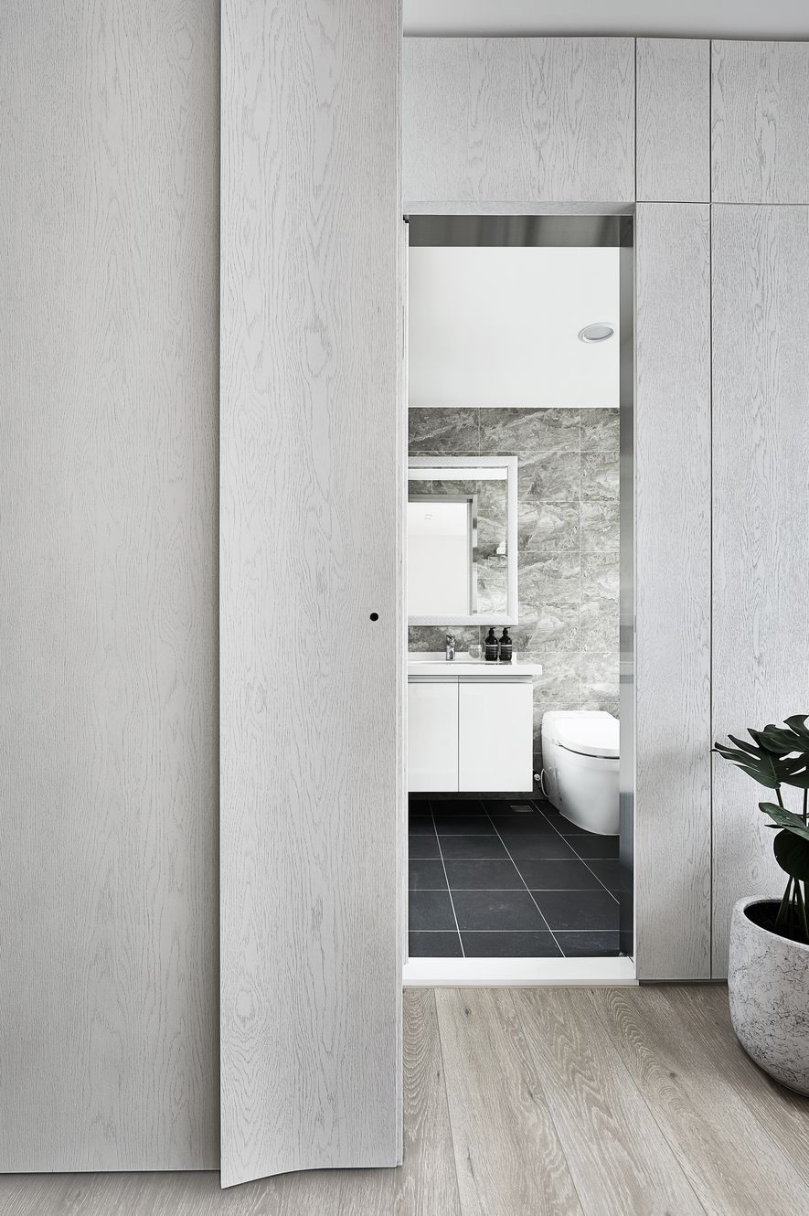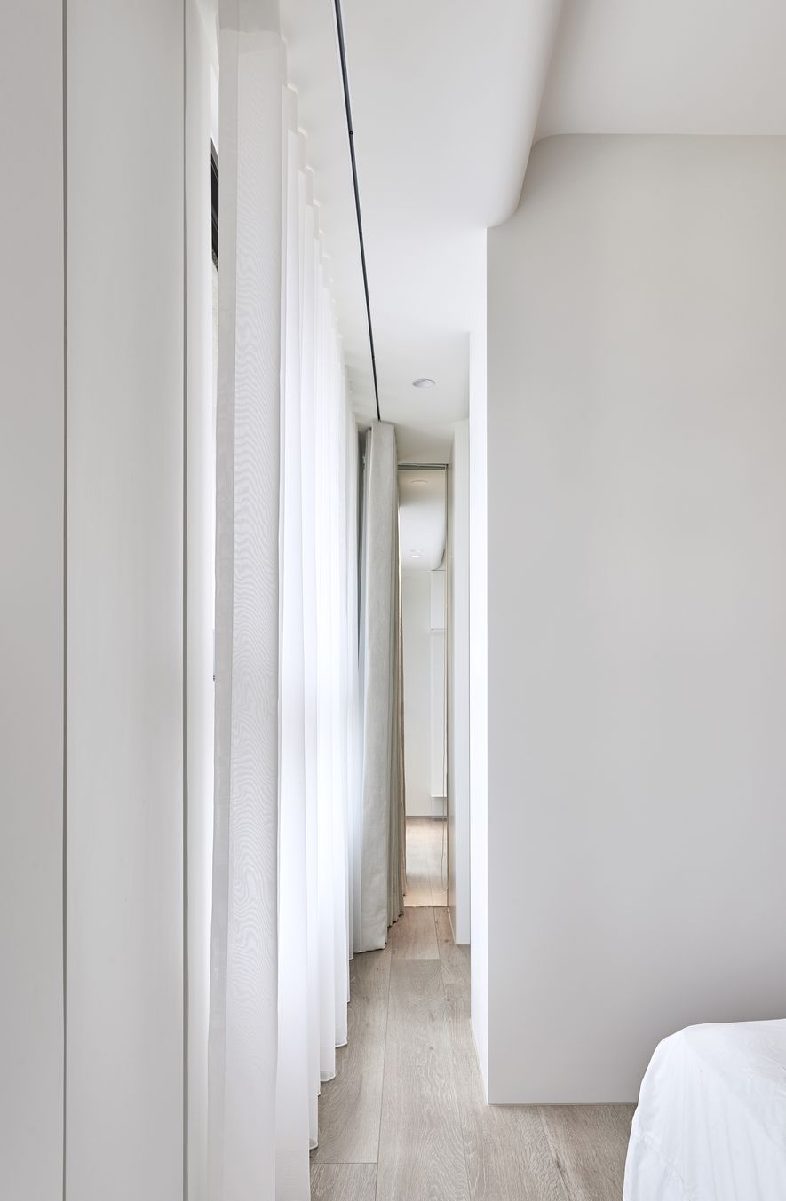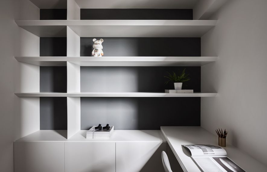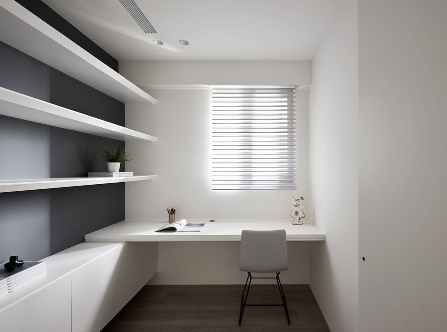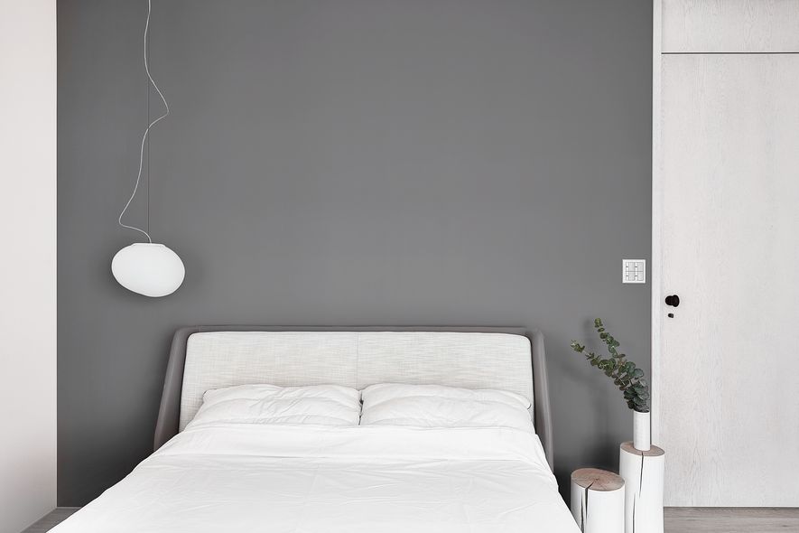 以木皮、噴漆、鐵件、系統櫃等不同的建材,應用在同一色彩-白色上。從主空間至私領域,不同深淺的白,放大了空間的視覺感,也象徵著年輕夫妻未來將攜手共度的明亮人生。