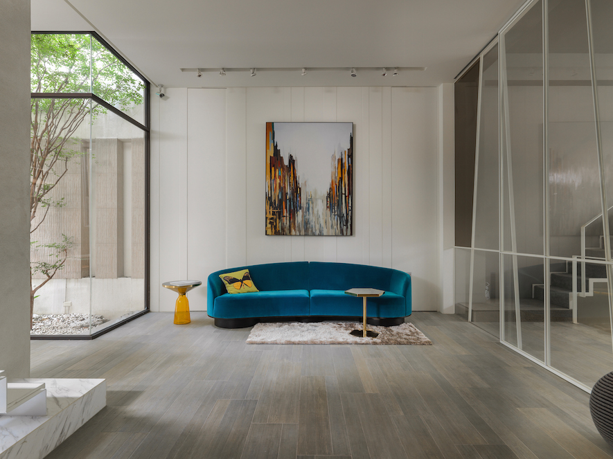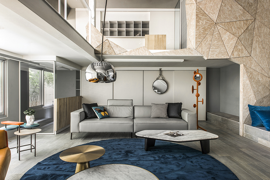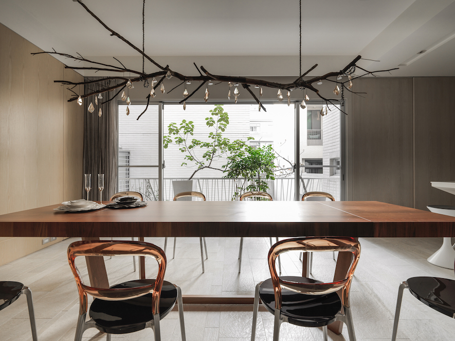 板岩磚、鋼刷水染木皮、義大利壁紙、手工訂製吊燈、薄陶