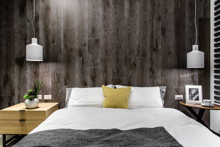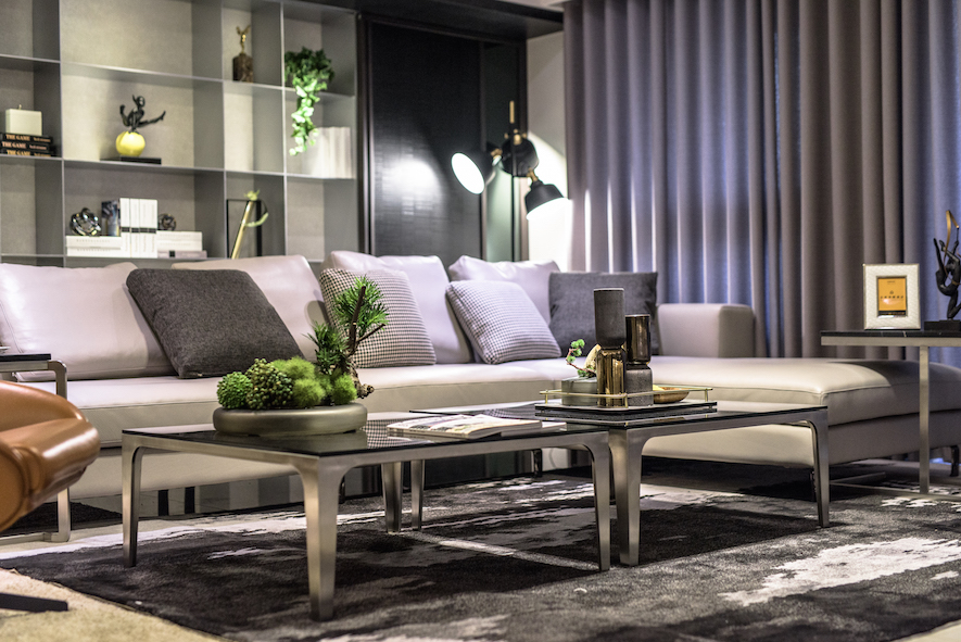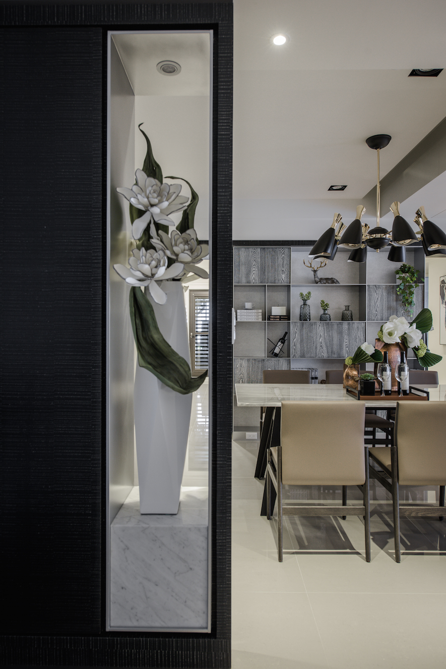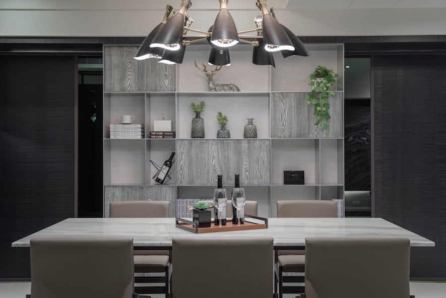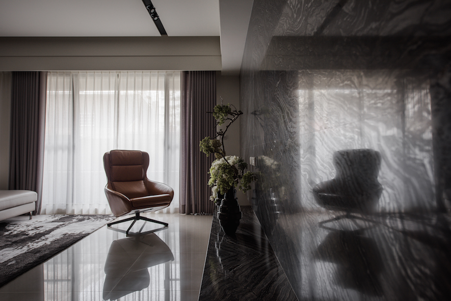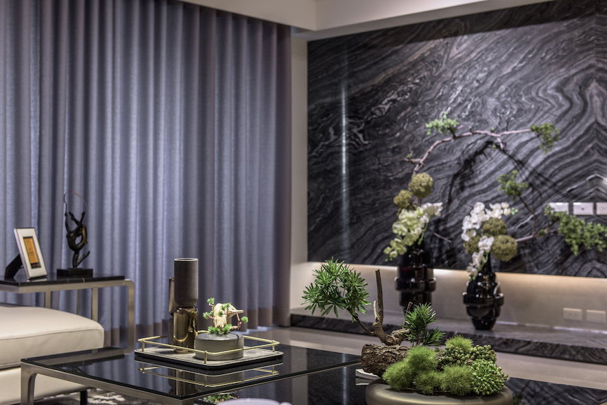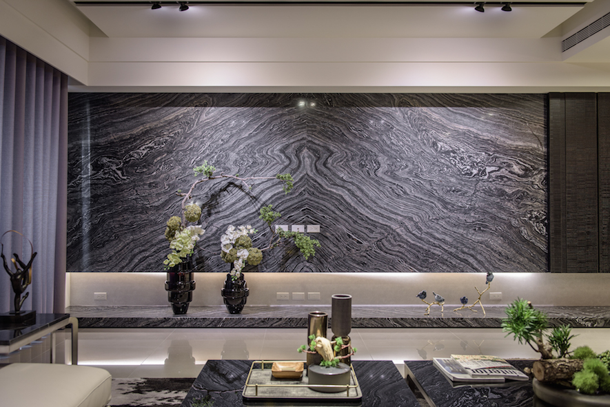 一室的沉靜,映照在千層銀黑的古木紋大理石中,光透出廳堂的大氣豪邸之蘊。