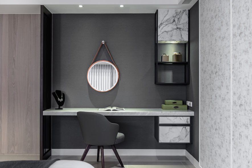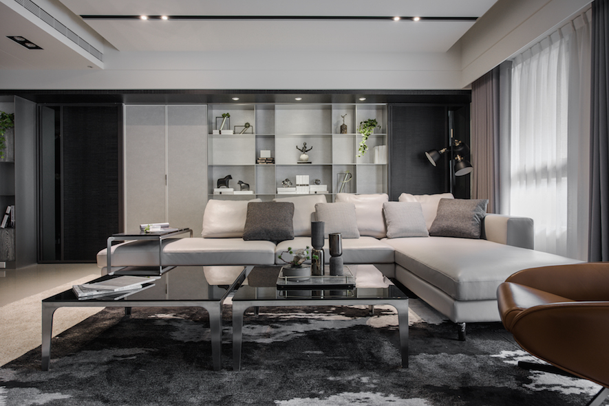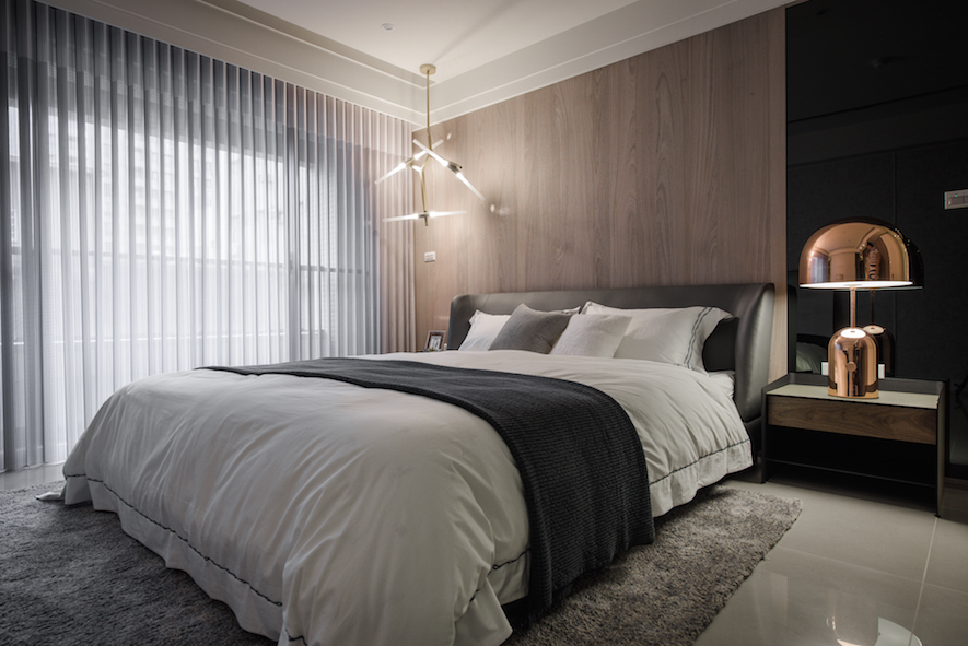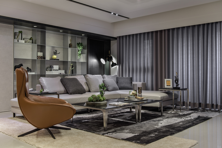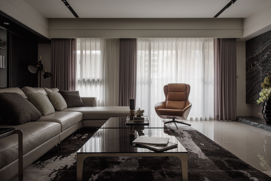 窗外大景,透過簾幕的暈,光透進整室的對比色階裡。大氣的古木紋大理石主牆,輝映地毯的水墨刷色,直覺一室的深淺對比,更增添了視覺的藝術性。家的調性藉由設計配置,以質材的鋪陳表現出光與空間的沉靜溫度,除了活化了空間的吸引力,更增添空間的接納性,迎接每個歸巢者的向心力度。