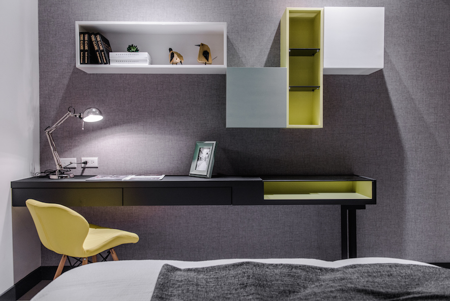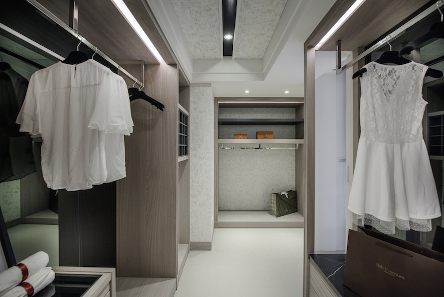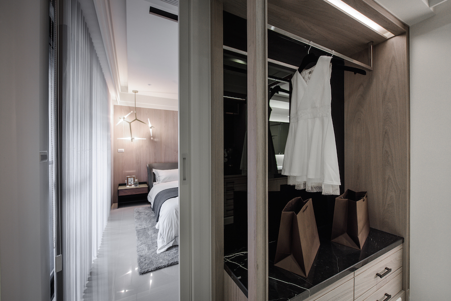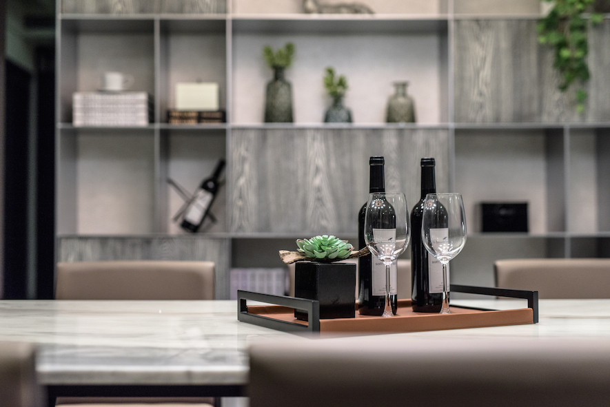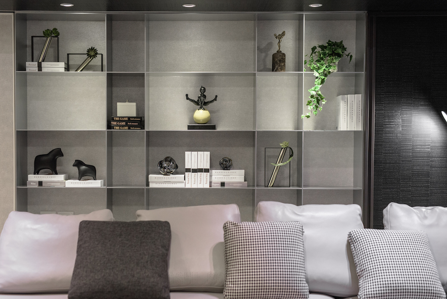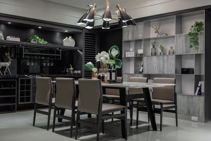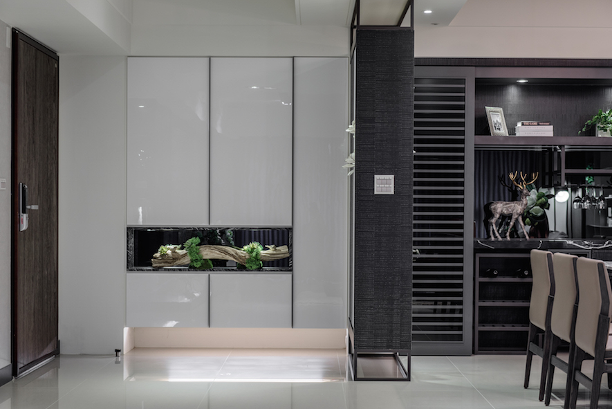 簡約現代的俐落中透露著細緻陳設,開放性無間隔場域從客廳延伸到餐廳。雙廳皆規劃大面積的壁櫃,整齊清晰的隔層讓收納擺設一目了然。餐廳櫃體多了酒櫃儲藏功能,酒瓶與水晶杯在視覺一致的收納下呈現另一番品味生活的樣貌。