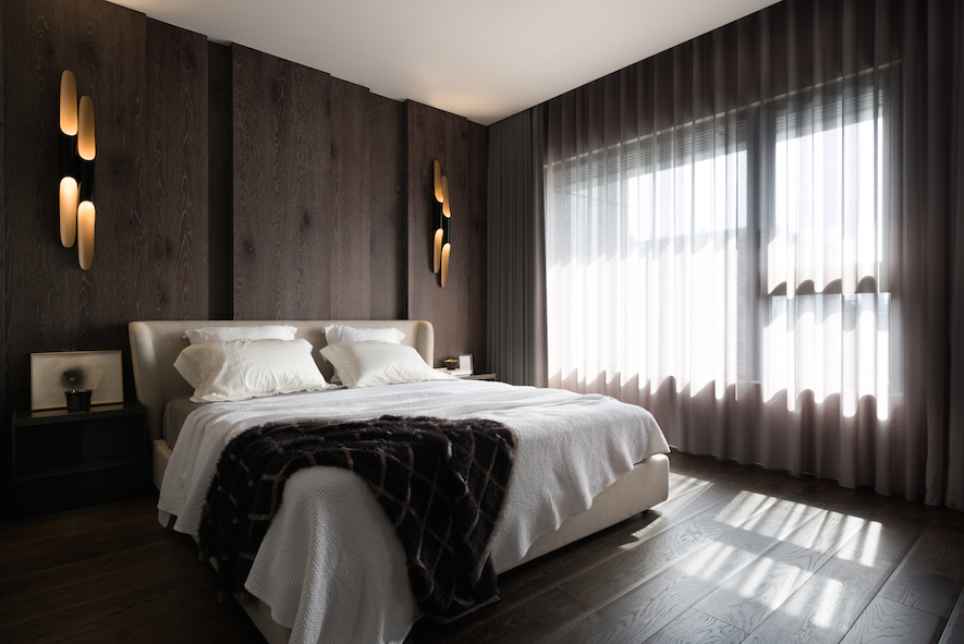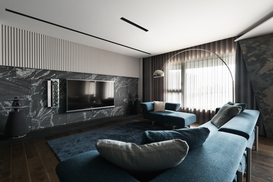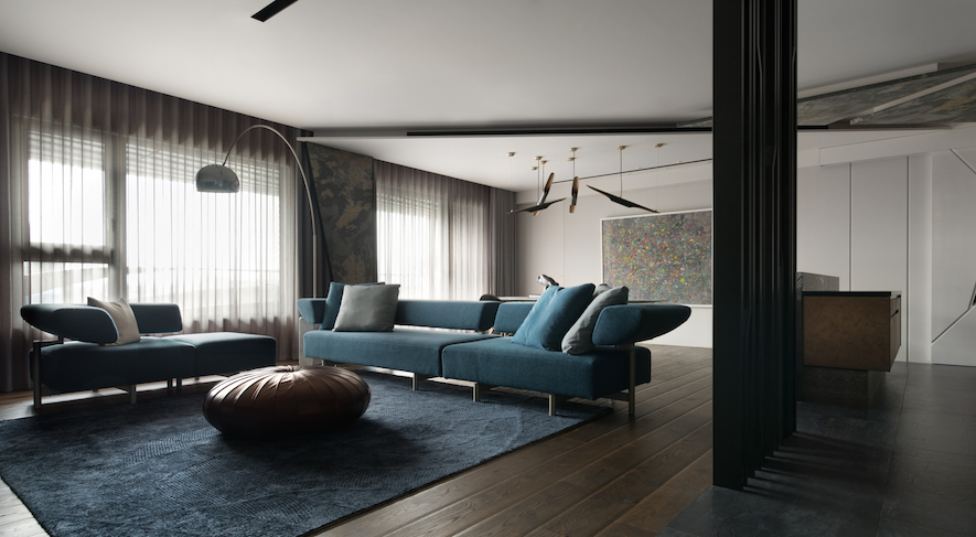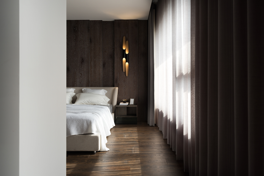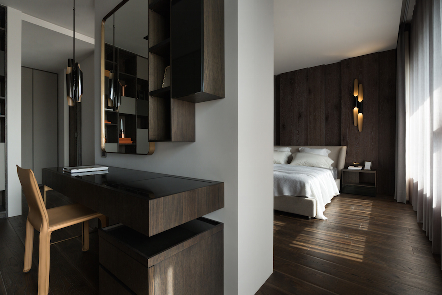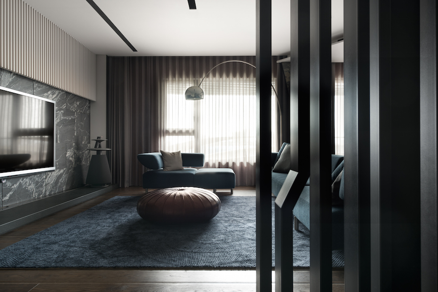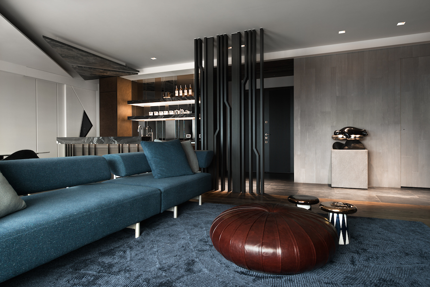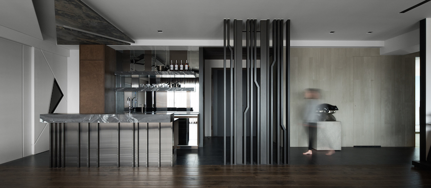 垂直縱向的線條律動做為空間基底,襯托出30度向的切面語彙,為本案形塑的主體意象、傳達獨創設計概念的兩大要素。演繹出空間層次,並由此催生富於主題性、絕對客製化的美學巧思。在入口玄關與客廳之間,打造一座向上意象及具穿透感的金屬造型屏風,一方面也是隱喻事業、家運穩定向上發展的衷心祝福。