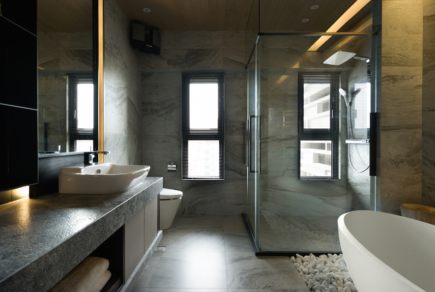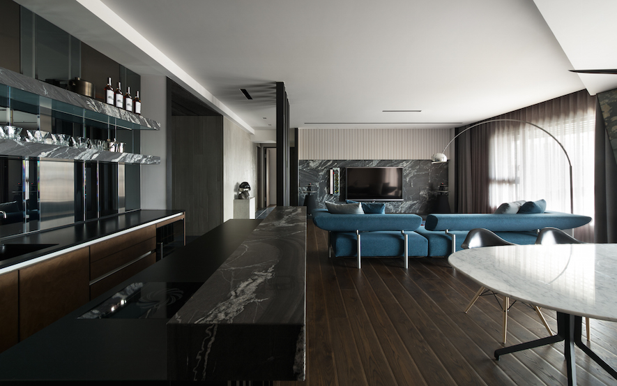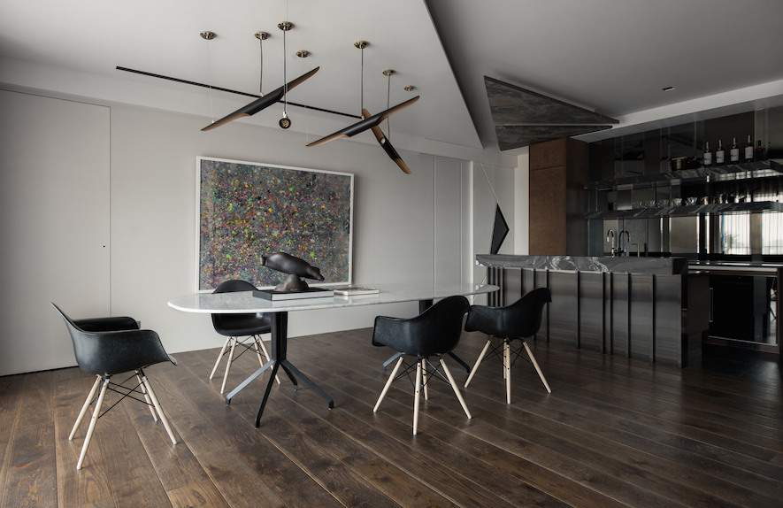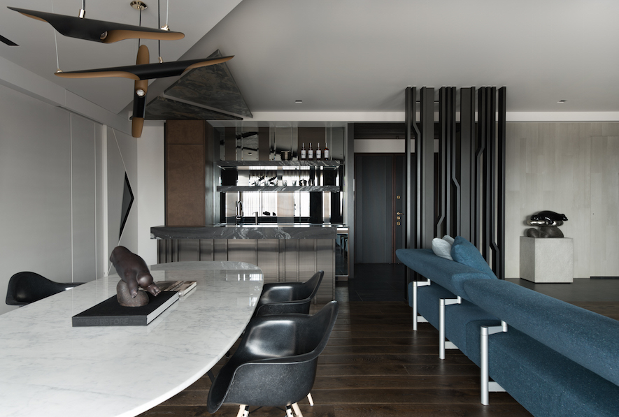 隨著腳步進入公領域,開放規劃的客廳、餐廳、輕食吧檯區三者,形成一處景深共享、機能互補的生活聚落,而自吧檯區上方向著落地大窗方向,設計者以面積大小不一的三角板塊,打造自天花板向牆面轉折延伸,一氣呵成的翼狀造型,其間穿插著木作、薄石板、鐵件等材質的階段變化,在背景光的襯托下,釋放宛如蓄勢起飛的能量,而共處開放領域的不同單元間,也能彼此交疊、延伸、再分界。
