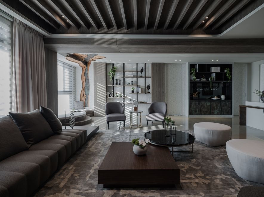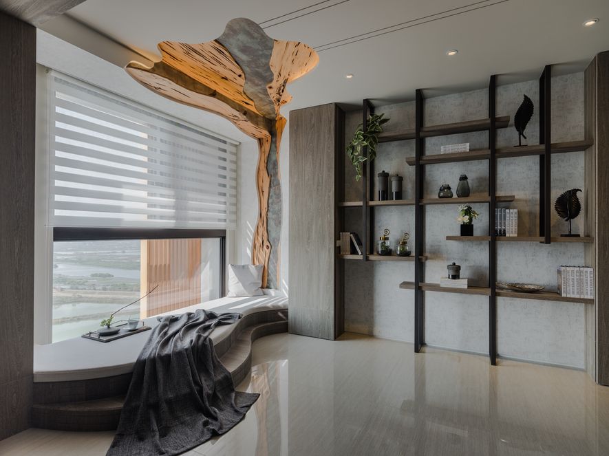 客廳一隅的樹形臥榻,拾階座臥,眺觀海景,帶出最貼近水天一色的自然情懷。設計師以空間為雕塑品,微塑出自然型義的樣貌,並以融入裝置於居所,讓樹與海間自然原生產生對話,成為家中重要的精神端景。
