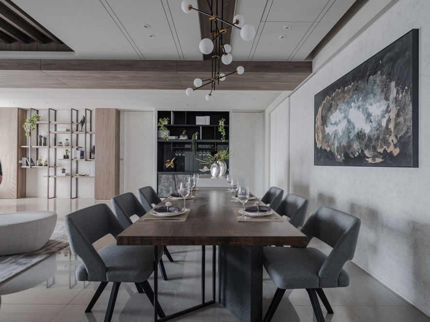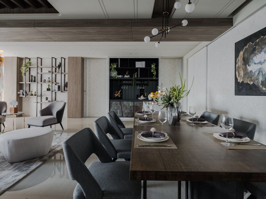 沉穩的木質調,彷若海砂與岩的硬質地,為空間劃出主幹。廳間地毯紋理有如海浪波動線條,動態如海潮起伏,輔為空間的軟質地。多樣的木質色層次運用於櫃體或地壁面,加深了自然感知。空間之於住家間的語彙,充滿了人因與貼近生活樣貌的對話。海暮色之作,設計師期望以貼近生活性,傳達出人與自然、空間與自然,兩者間的情感連結與交流。因此大量以自然素材與植栽,應合室外玻璃帷幕通透出的自然觀景,讓室內外相融成趣,回應初衷。
