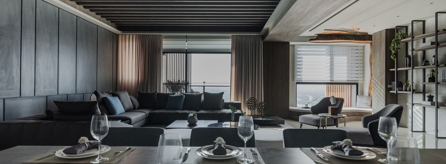 輔進廳,沉穩的調,以雙廳中的鐵刀色木樑,畫出大片的延伸。L型的低彩深咖啡大沙發,呼應著與背牆同系的木色,交織一片寧靜安詳。空間盡以海景之色作鋪陳,幕色之彩為輔,將海的深沉與寧靜,彰顯於裝置中。
