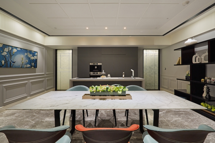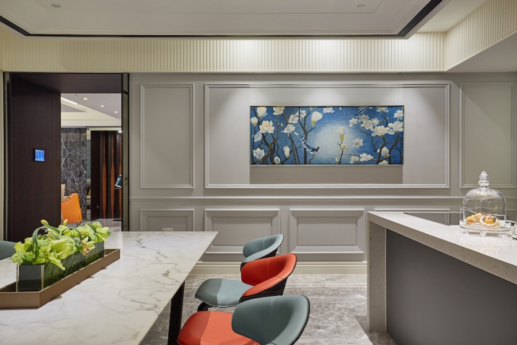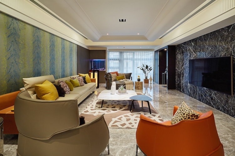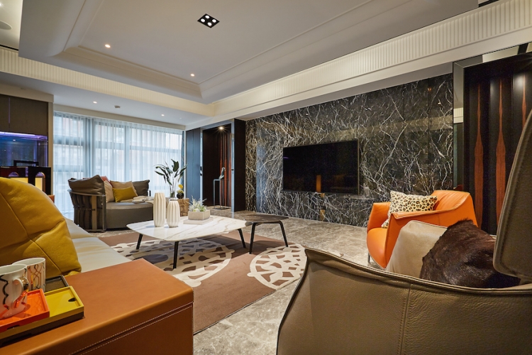藍鵲是台灣國鳥,牠們是最具有家庭觀念的鳥類,會成群行動感情忠貞,用此來展現家庭和合,主題訂定以後,設計團隊選用自然材質與百年品牌互相搭配, 彰顯出空間的獨特及多元性,藍鵲為設計主軸,沙發背牆上翠綠相間絲綢象徵棲息樹林意念,家具選用百年品牌 Poltrona Frau,洗練的線條與獨樹風格的車縫線,具體展現了義大利傳統皮革工藝的高超,溫潤的橘色調和安格斯大理石牆的生冷,略帶弧型的天花板,有個性卻不過分張揚的線條輪廓,同樣彰顯優雅的義式美學。