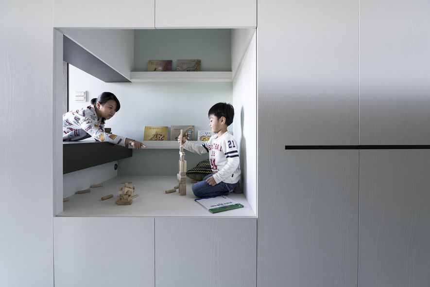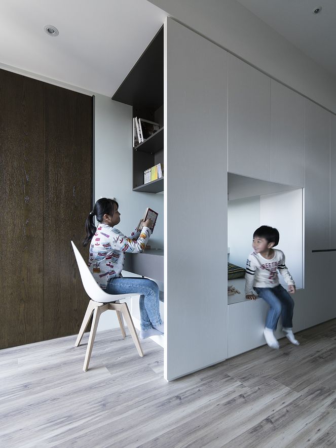 「舍」除了是家的意思,也是古字的「捨」即捨得、給予意思。「隱舍」隱喻父母內心期望給予孩子快樂的地方,對家人的一種付出!就像屋中屋的感覺,延伸出另一個家,讓孩子在家也能享受休閒時光,依然能保有自己專屬的空間。為孩子而遷徙、為愛而轉換,造就溫暖的五口之家。