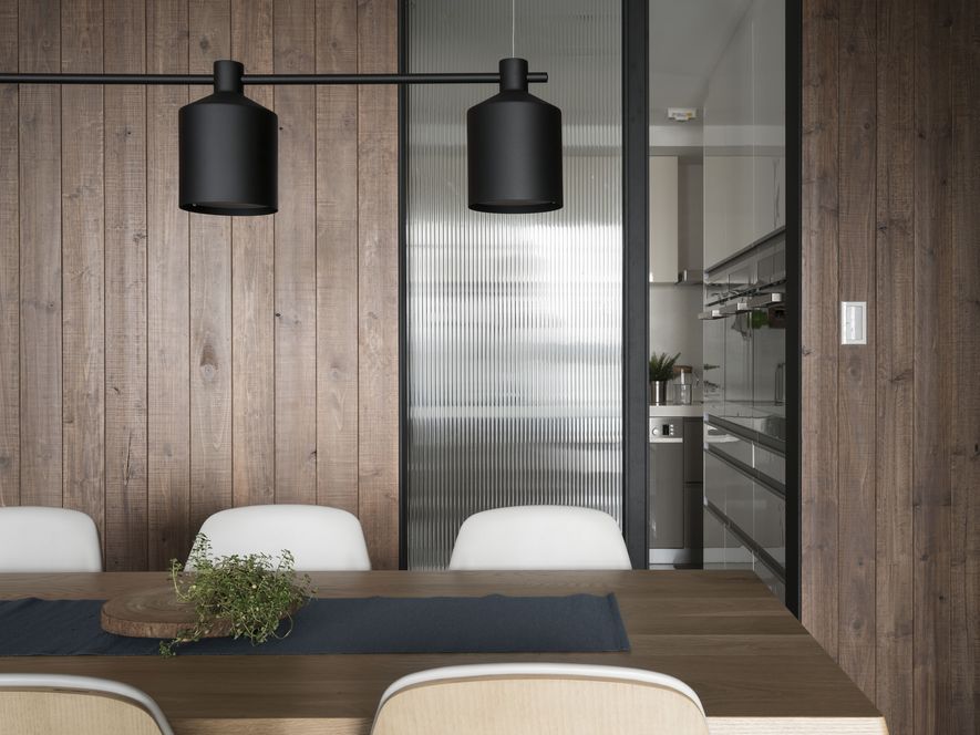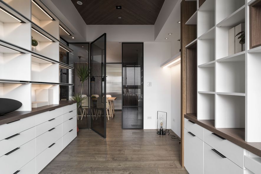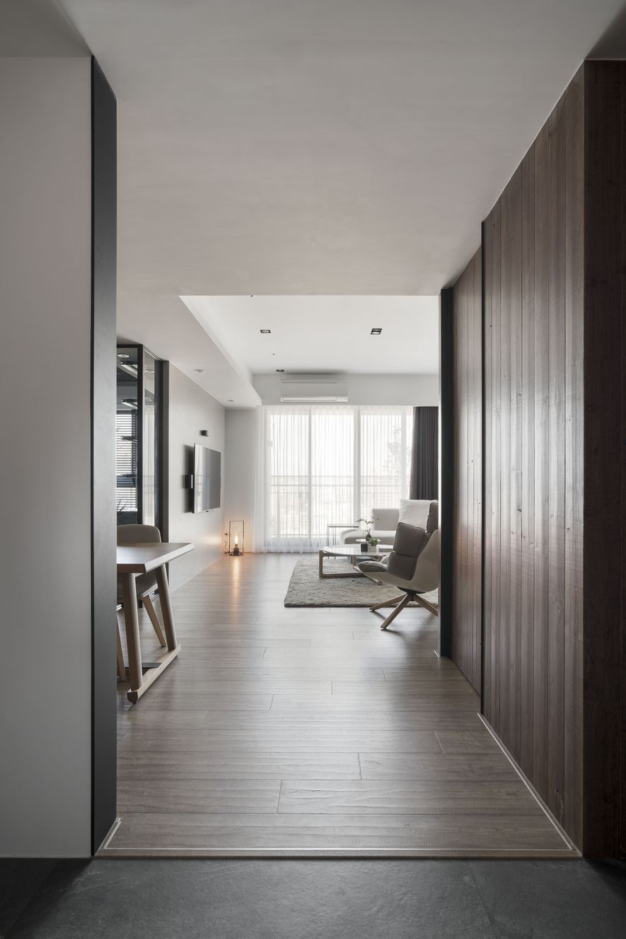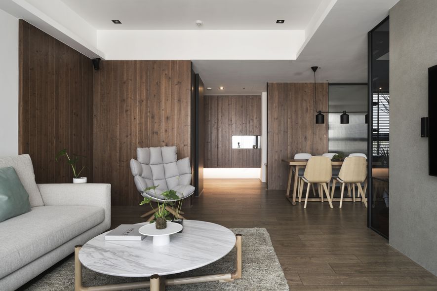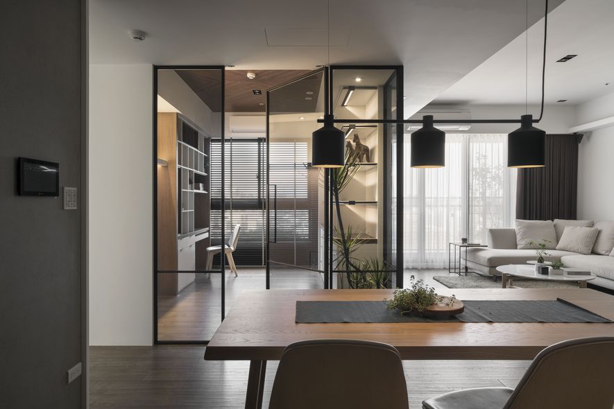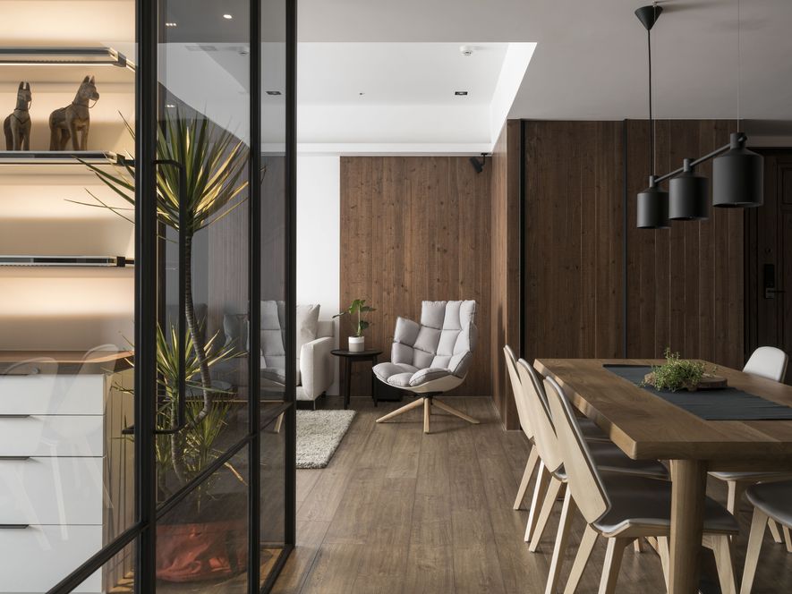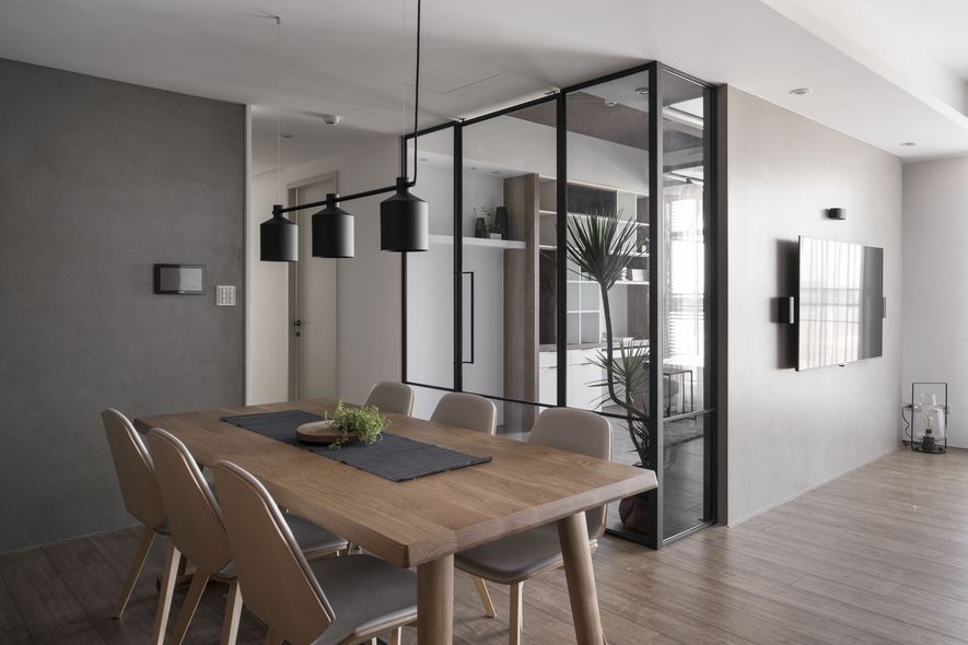 小坪數也能有大空間,設計師善用透明玻璃通透的特質,讓視覺無限延伸,使空間寬闊。另也運用角度與窗格,讓陽光灑進每個角落,大量的實木板與木皮貼片,創造一種和諧、延伸的視覺效果,讓家裡從地面到牆面都充斥木質的溫潤感!電視主牆以清水模漆做最乾淨簡單的呈現,清爽不失雅緻,呼應後方運用玻璃與鐵件構成的書房;光線照映收納櫃上的擺設品。自然素材的廣泛運用,顯得處處有綠意、生意盎然。