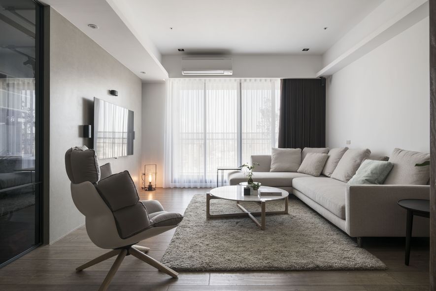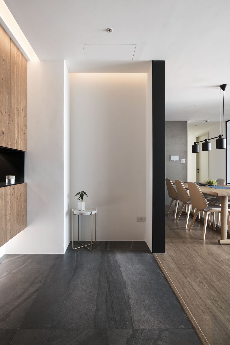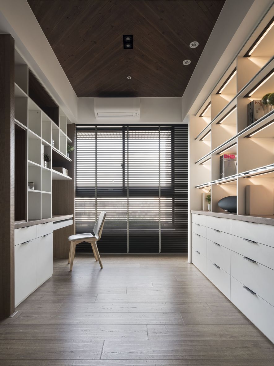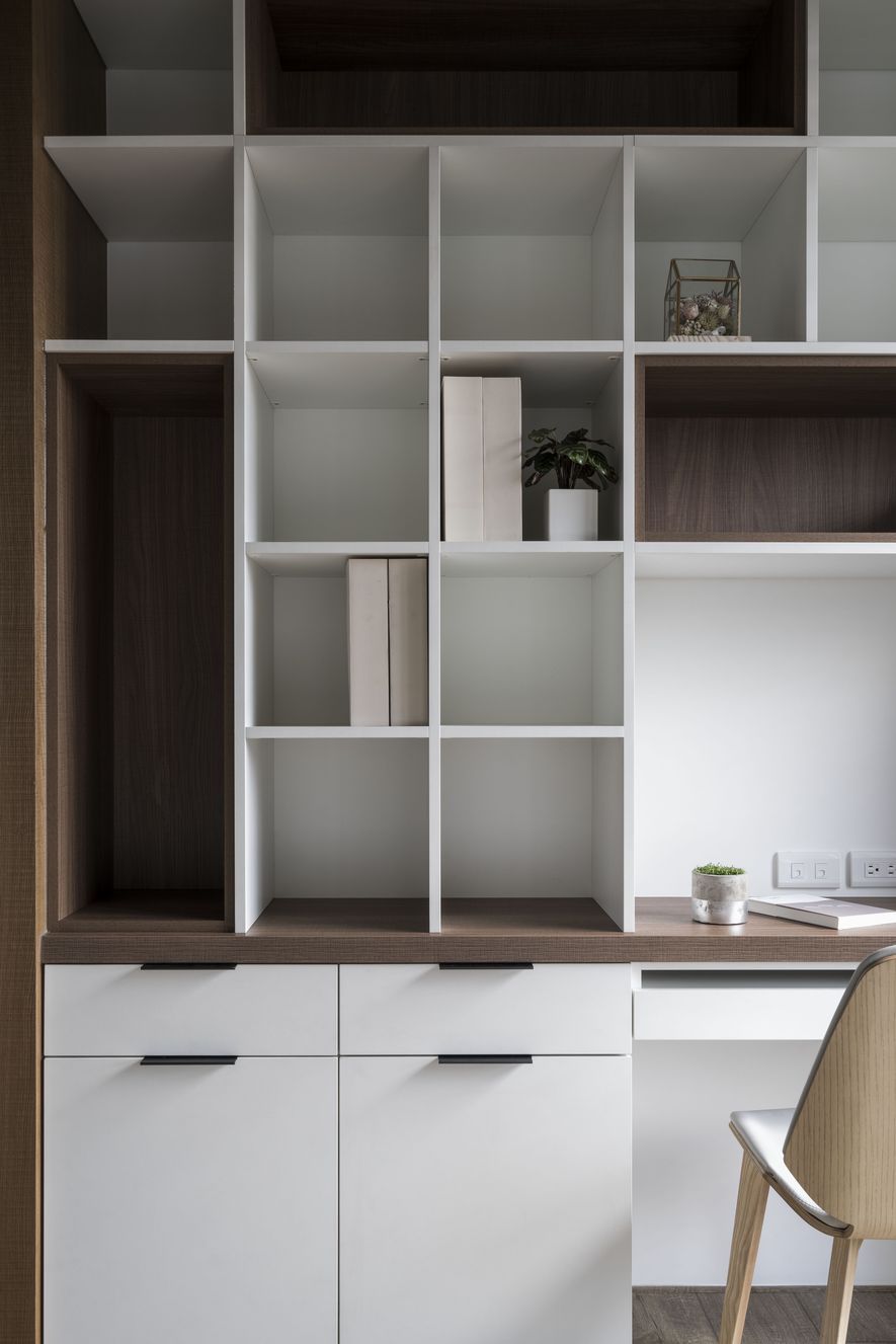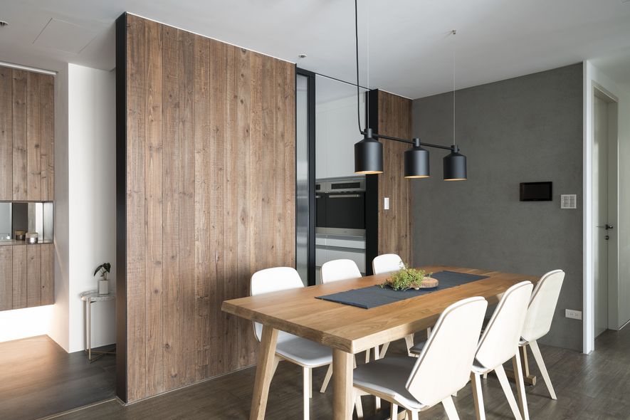 小坪數也能有大空間,設計師善用透明玻璃通透的特質,讓視覺無限延伸,使空間寬闊。另也運用角度與窗格,讓陽光灑進每個角落,大量的實木板與木皮貼片,創造一種和諧、延伸的視覺效果,讓家裡從地面到牆面都充斥木質的溫潤感!電視主牆以清水模漆做最乾淨簡單的呈現,清爽不失雅緻,呼應後方運用玻璃與鐵件構成的書房;光線照映收納櫃上的擺設品。自然素材的廣泛運用,顯得處處有綠意、生意盎然。