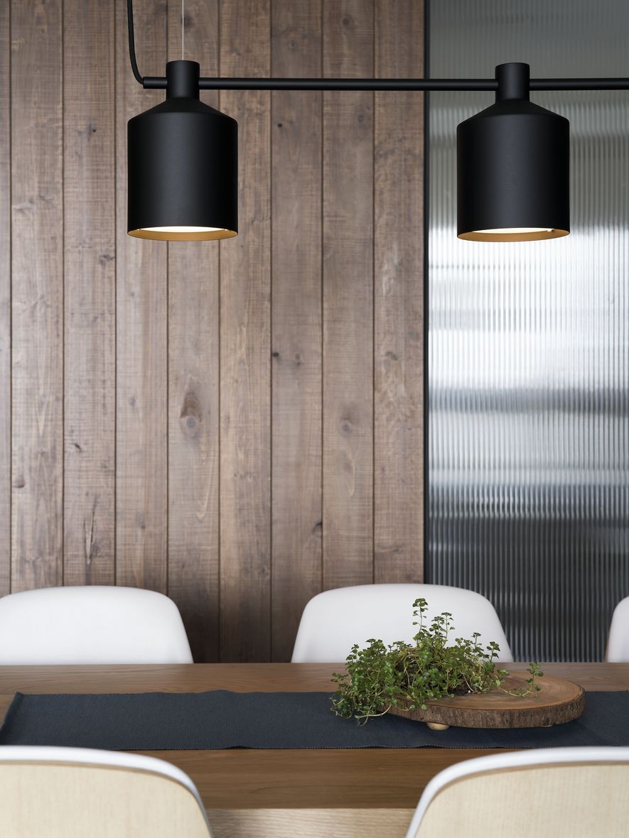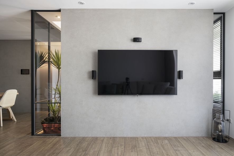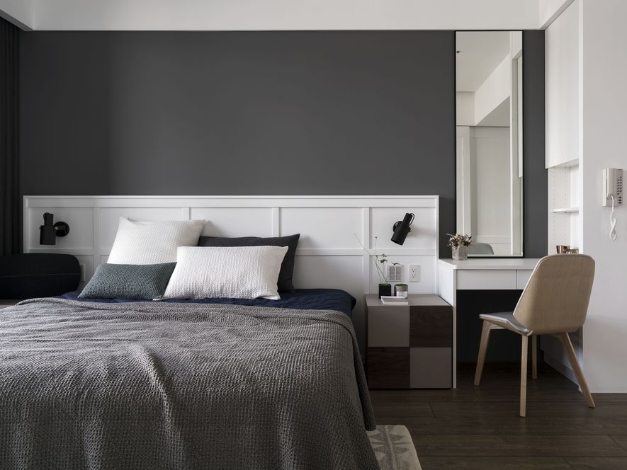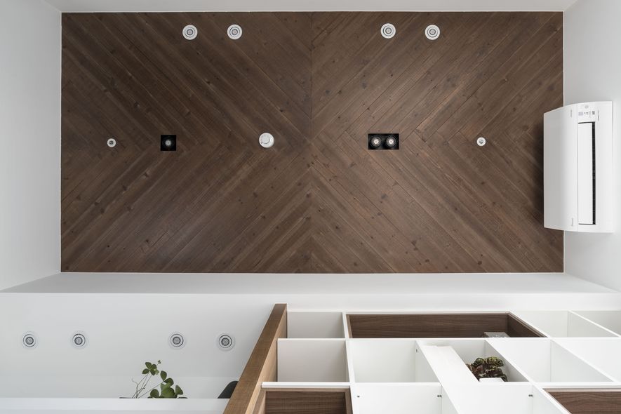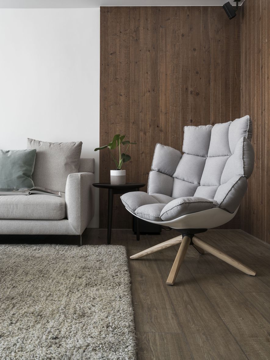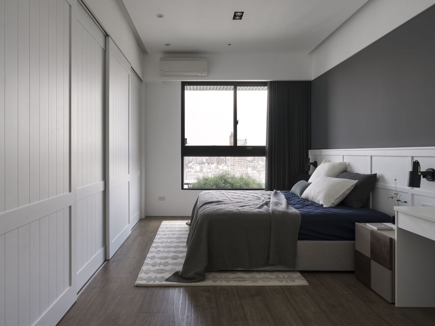 小坪數也能有大空間,設計師善用透明玻璃通透的特質,讓視覺無限延伸,使空間寬闊。另也運用角度與窗格,讓陽光灑進每個角落,大量的實木板與木皮貼片,創造一種和諧、延伸的視覺效果,讓家裡從地面到牆面都充斥木質的溫潤感!電視主牆以清水模漆做最乾淨簡單的呈現,清爽不失雅緻,呼應後方運用玻璃與鐵件構成的書房;光線照映收納櫃上的擺設品。自然素材的廣泛運用,顯得處處有綠意、生意盎然。