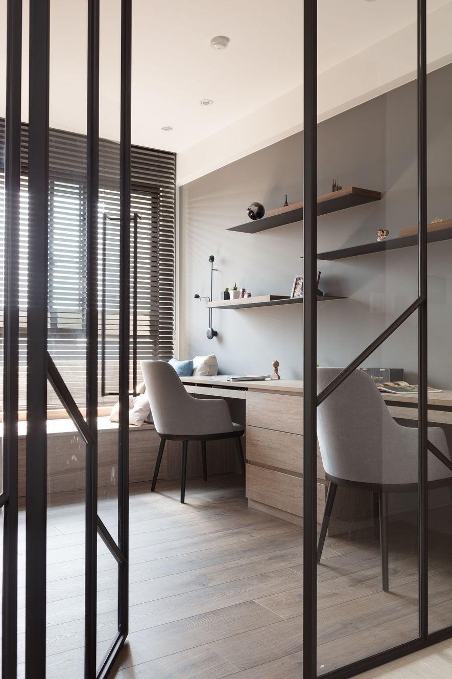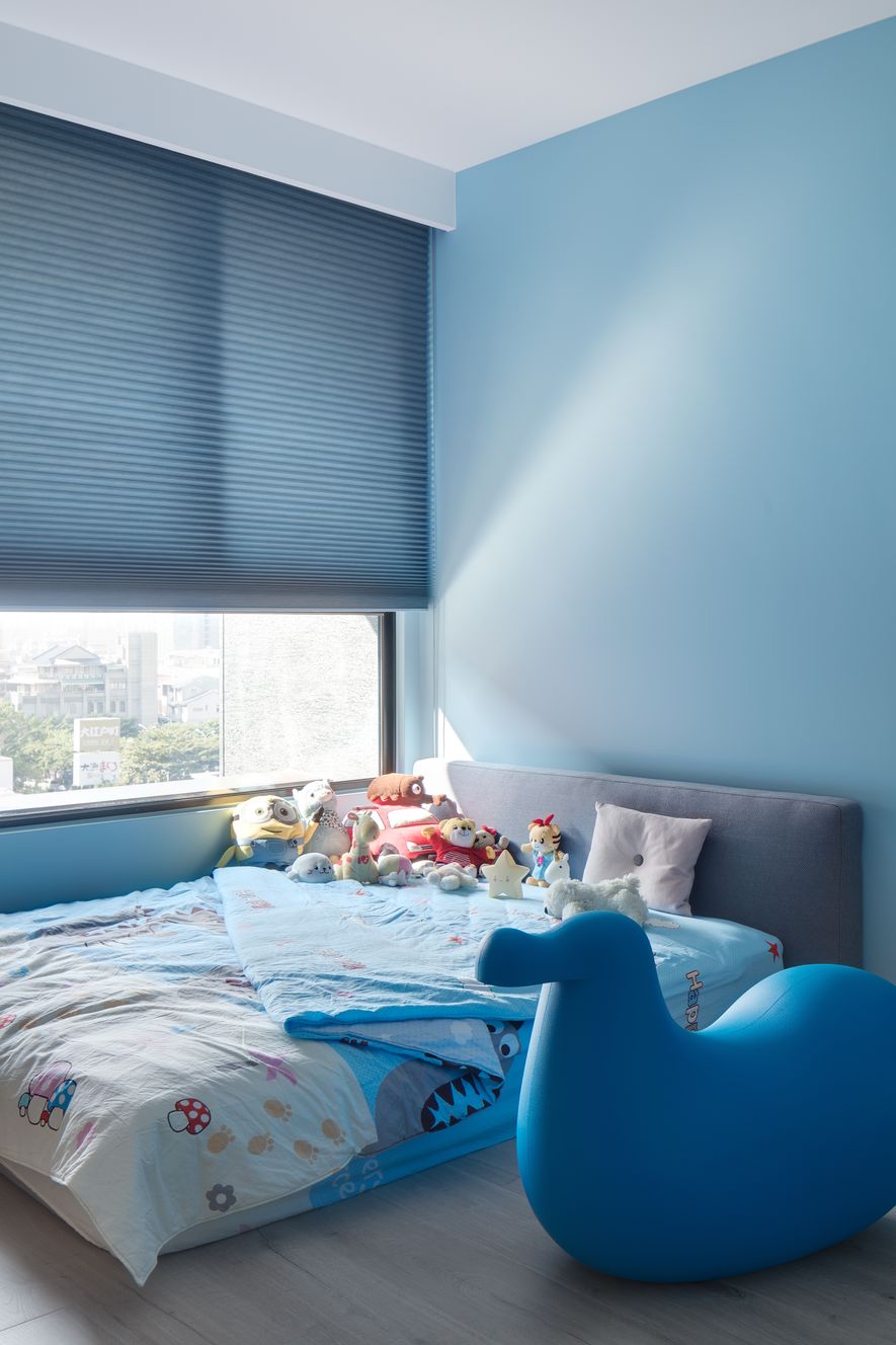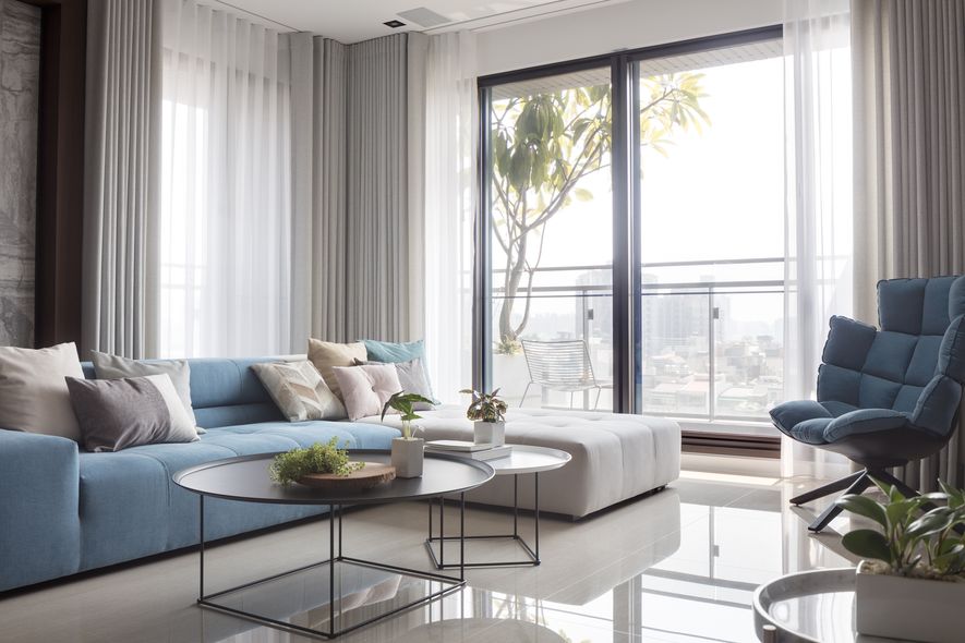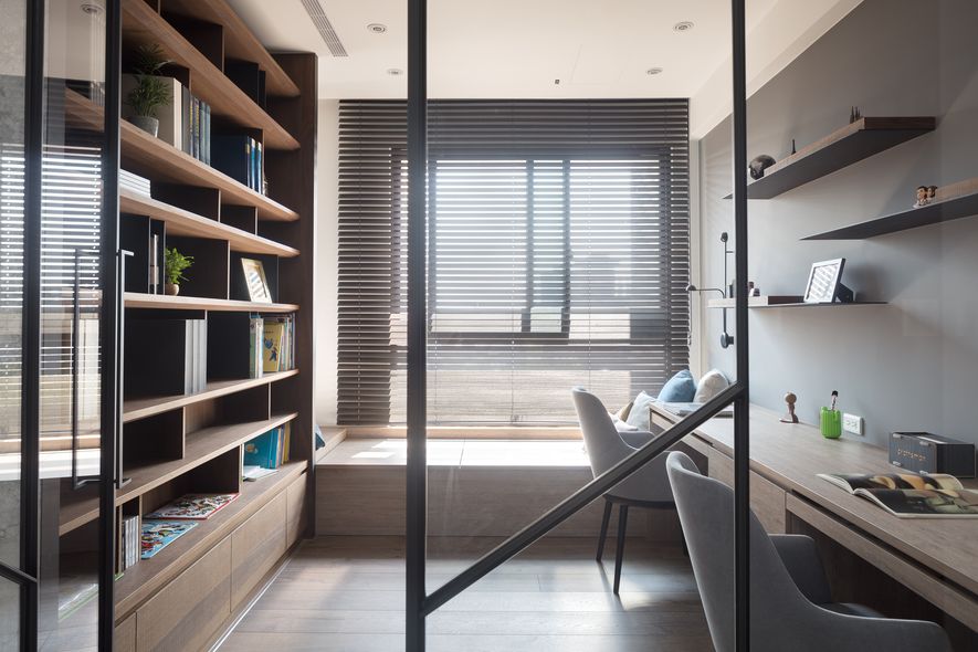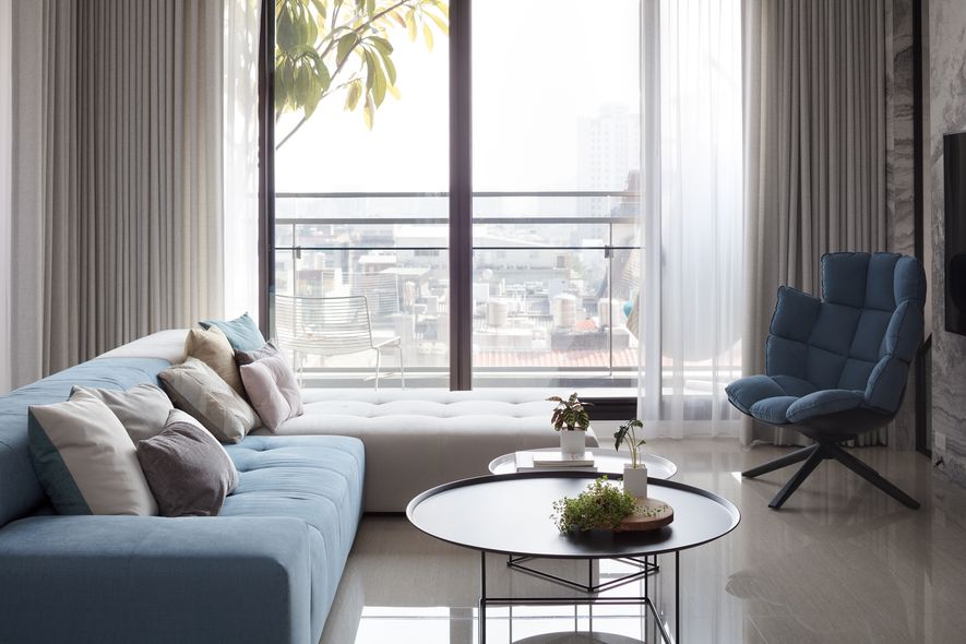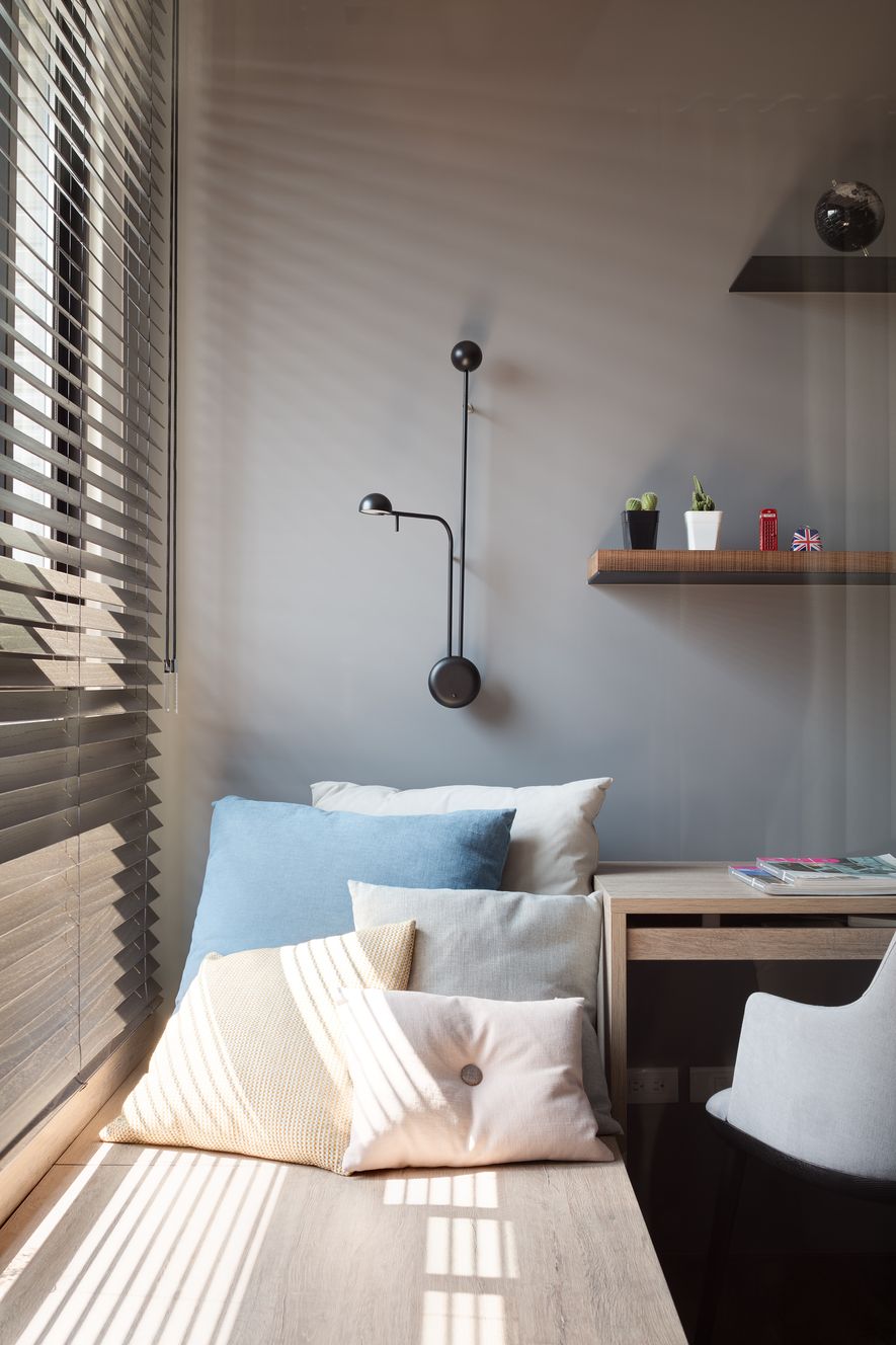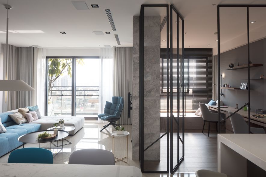 屋主是位處於高壓環境的醫生,盼能擁有讓家人遮風擋雨、舒適愜意的空間;設計師以北歐風為出發點,全室採用素雅色調,佐以潔淨的白色,塑造寬廣、舒適的居家;不經意的藍色系椅件成為一大亮點,活化了整個空間,讓各個空間相互呼應,達到一致、和諧的效果。家人可愜意的坐在沙發上,享受自然曬進的陽光,也可來到後方用透明玻璃與鐵件為門、清水模為牆的書房,質樸的空間享受書本帶來的浩瀚想像世界;窗下的臥榻區更可讓其他成員加入,或坐或臥的在書房內活動。