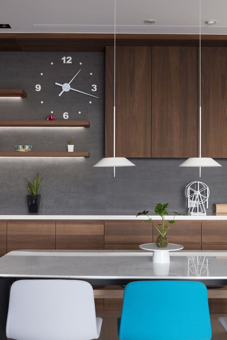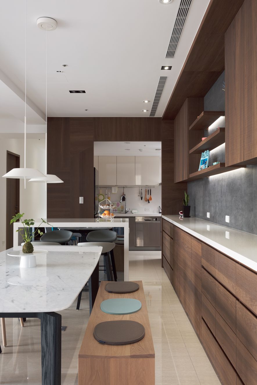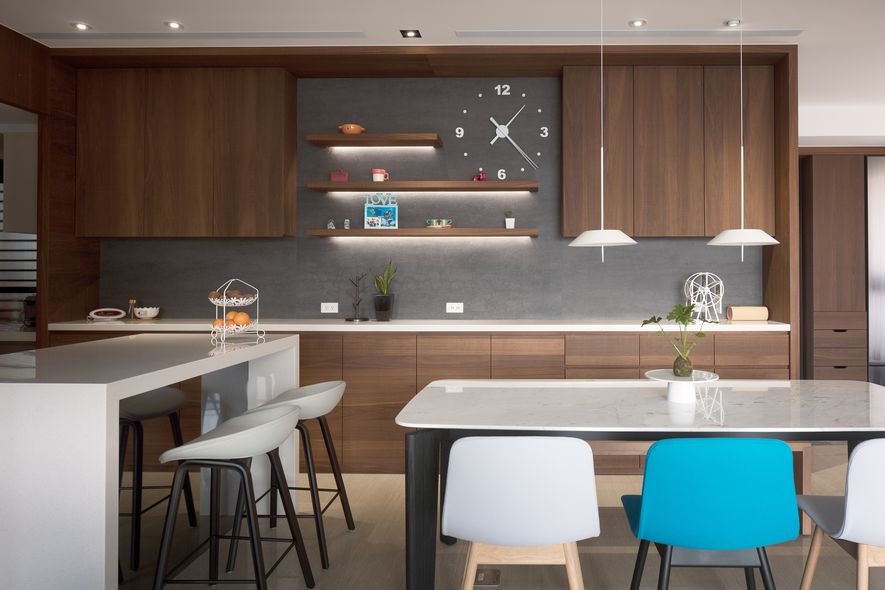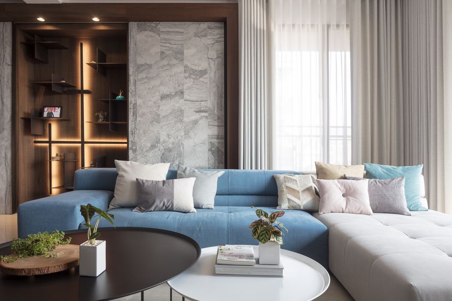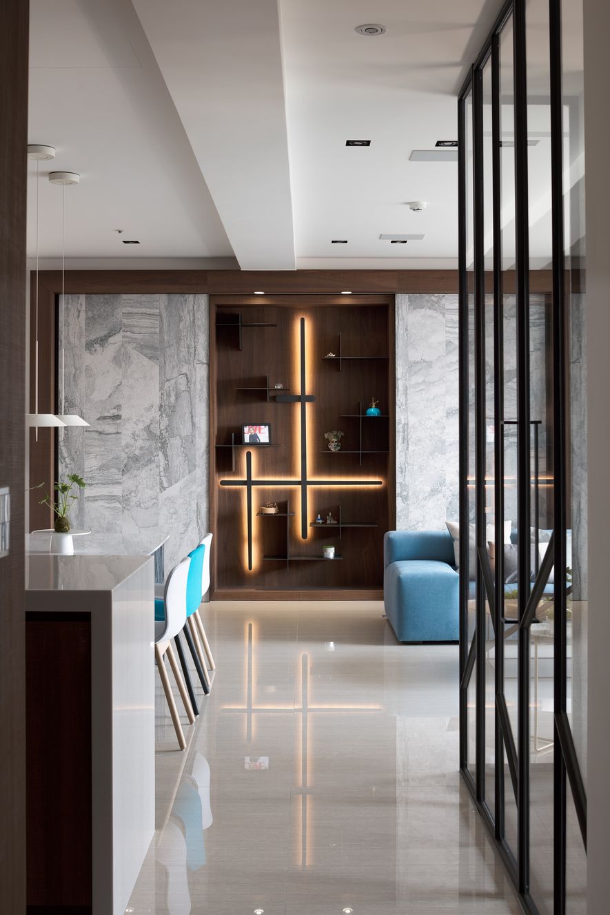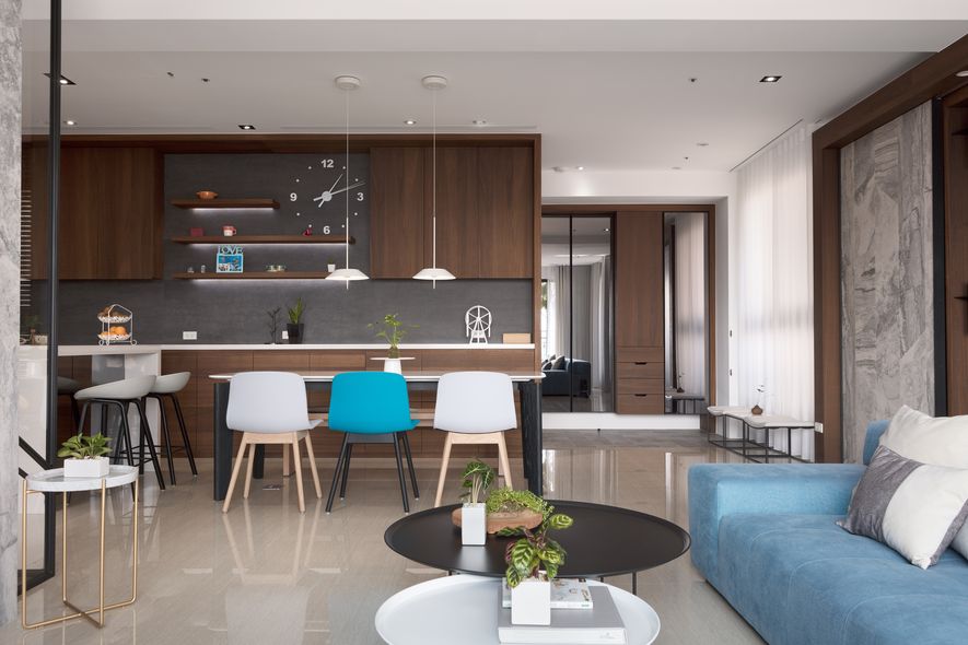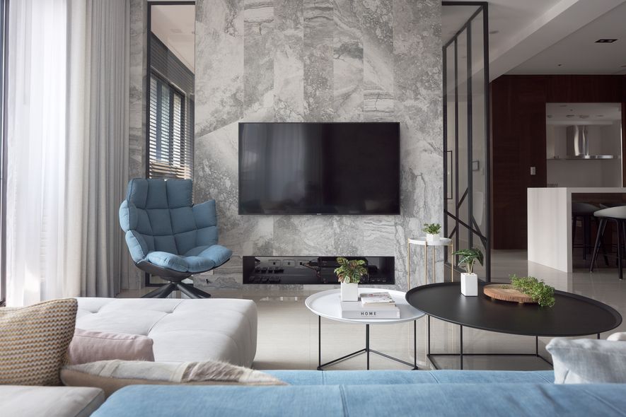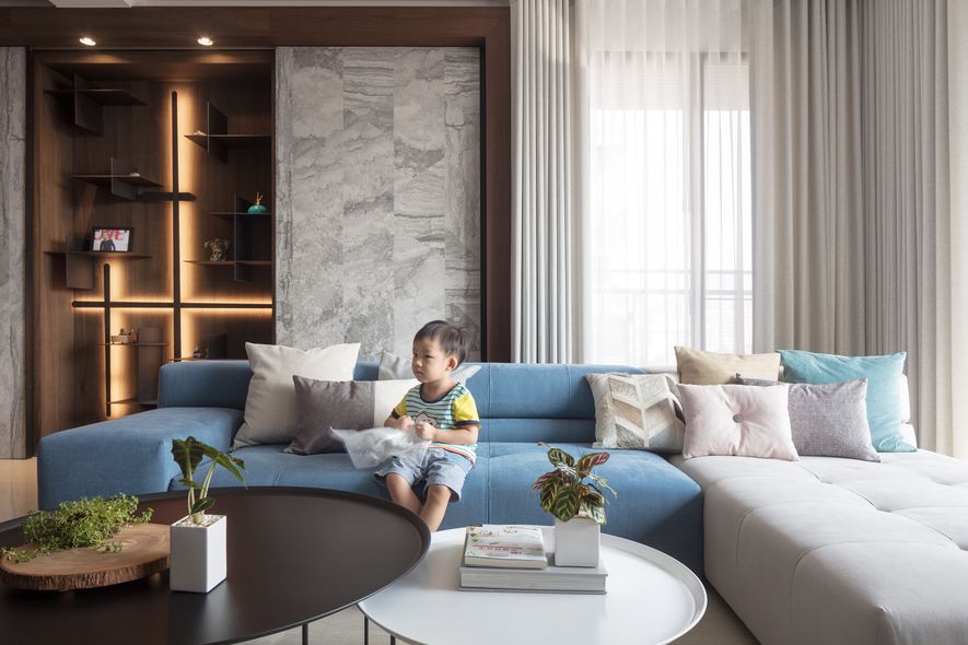 屋主是位處於高壓環境的醫生,盼能擁有讓家人遮風擋雨、舒適愜意的空間;設計師以北歐風為出發點,全室採用素雅色調,佐以潔淨的白色,塑造寬廣、舒適的居家;不經意的藍色系椅件成為一大亮點,活化了整個空間,讓各個空間相互呼應,達到一致、和諧的效果。家人可愜意的坐在沙發上,享受自然曬進的陽光,也可來到後方用透明玻璃與鐵件為門、清水模為牆的書房,質樸的空間享受書本帶來的浩瀚想像世界;窗下的臥榻區更可讓其他成員加入,或坐或臥的在書房內活動。