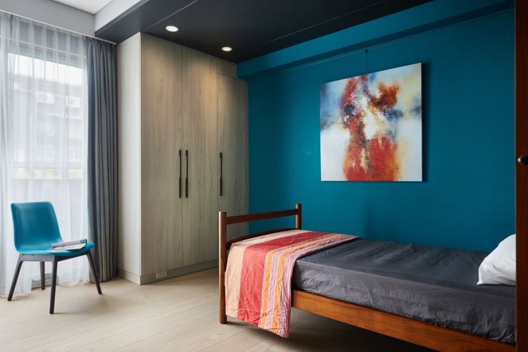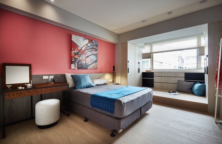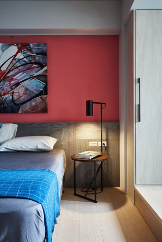 私區將主臥室以大膽桃紅色帶出女主人婉約,以開放式更衣區結合臥榻,提供喜好閱讀的屋主,擁有複合式空間。除了機能外,更多了慵懶的閱讀空間。客房在大面積色塊以吊燈、鮮豔畫作點綴其個性,延續原有家具刻劃出東方文學最終章。