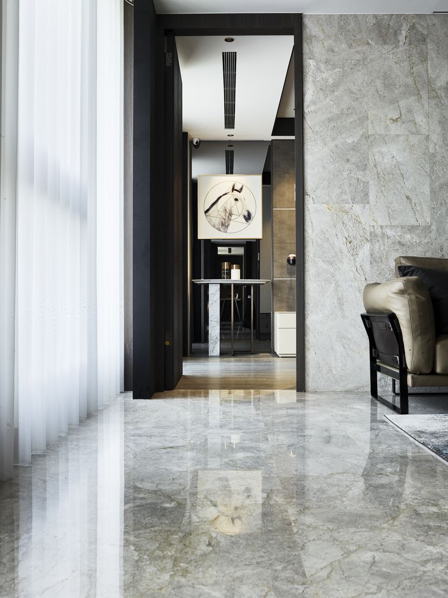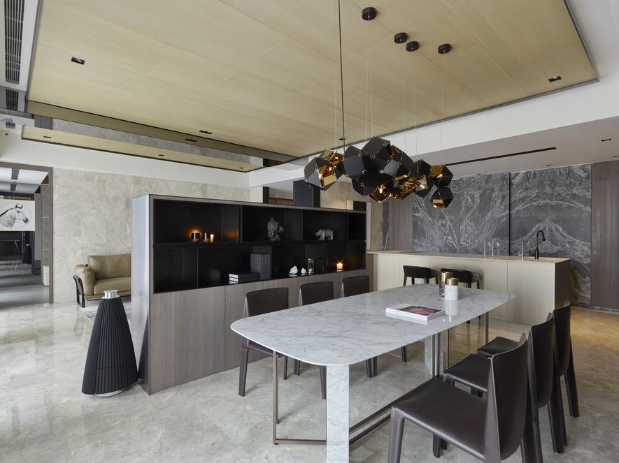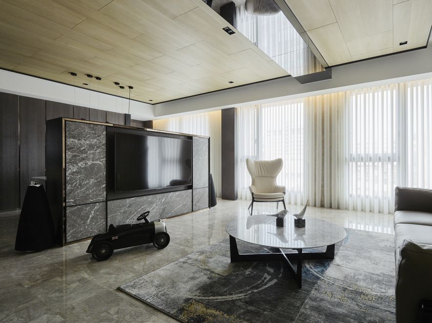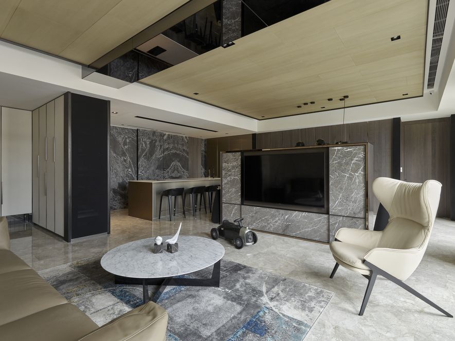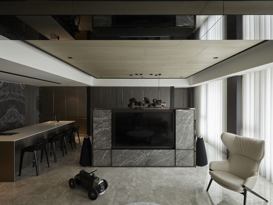設計師將優雅與簡約完美的結合,將現代空間元素以更純粹的方式表現。以開放性貫穿空間,使整體明亮寬敞而富有層次,光線明暗之間,鐵件與木紋線條和大面石材紋路的質感之美,更加顯現。開放的客餐廳讓視覺更為開闊,電視矮牆同時保有了視野也區隔出交誼客廳與用餐空間,灰色系大理石材搭配暖色系的家具與木質成為個性鮮明的情境對話。臥室中深淺濃淡的色彩,現代簡約的空間元素,營造了沉穩的氛圍,天花板的弧形分割柔和了剛硬線條,立體了空間層次。在輕淡柔和的日光中,舒適的家具讓空間使人放鬆,企圖讓業主在其中堆疊生活情感,創造家中每一處的珍貴回憶,是設計師在此案當中欲傳達的設計理念。