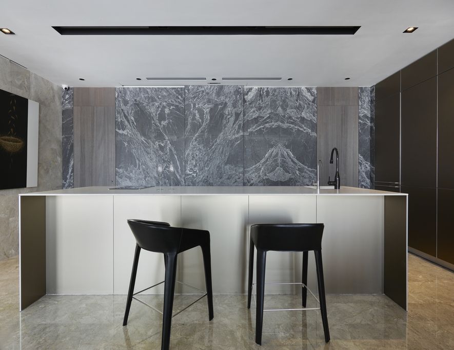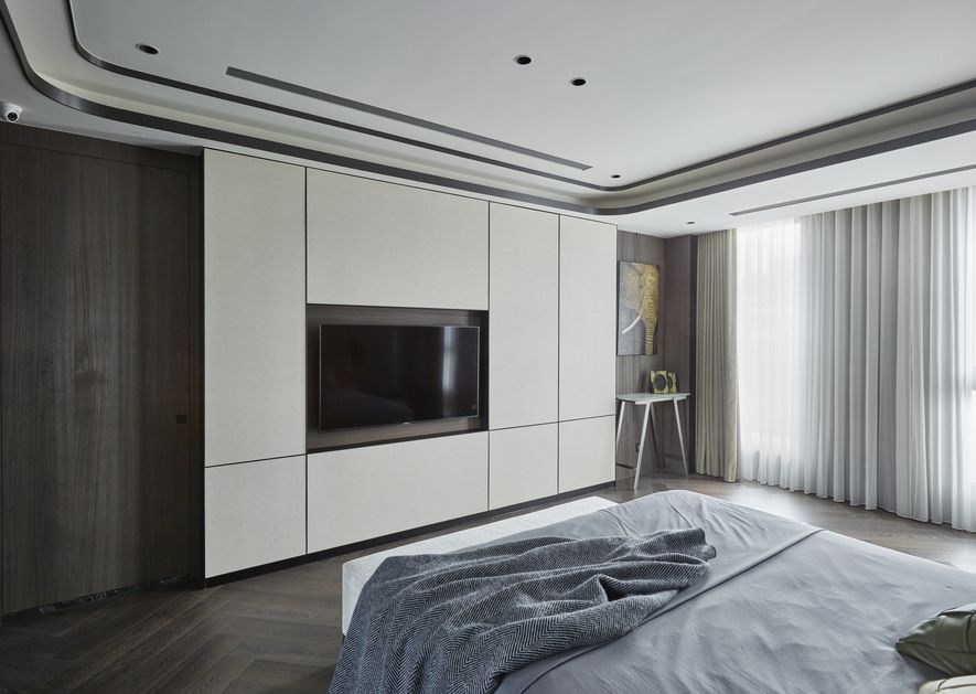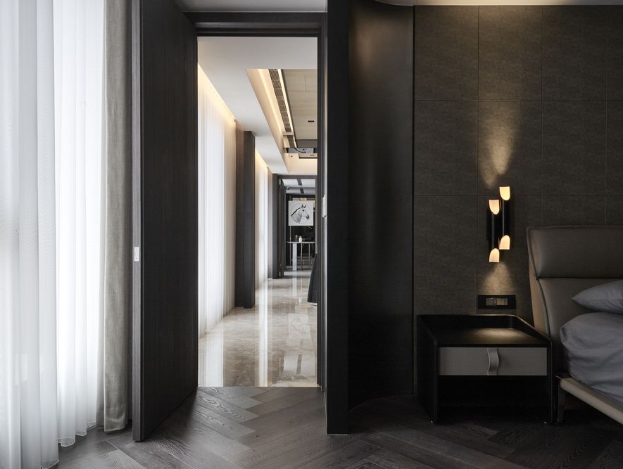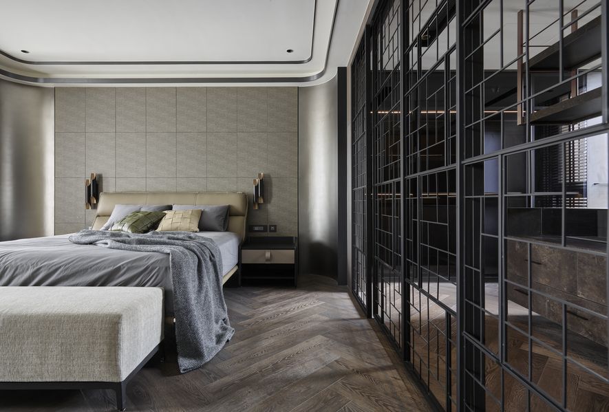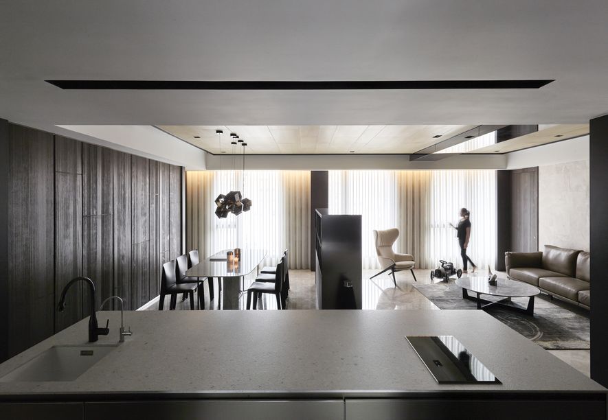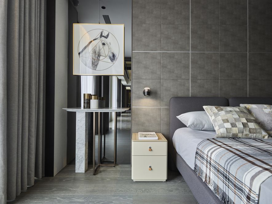 設計師將優雅與簡約完美的結合,將現代空間元素以更純粹的方式表現。以開放性貫穿空間,使整體明亮寬敞而富有層次,光線明暗之間,鐵件與木紋線條和大面石材紋路的質感之美,更加顯現。開放的客餐廳讓視覺更為開闊,電視矮牆同時保有了視野也區隔出交誼客廳與用餐空間,灰色系大理石材搭配暖色系的家具與木質成為個性鮮明的情境對話。臥室中深淺濃淡的色彩,現代簡約的空間元素,營造了沉穩的氛圍,天花板的弧形分割柔和了剛硬線條,立體了空間層次。在輕淡柔和的日光中,舒適的家具讓空間使人放鬆,企圖讓業主在其中堆疊生活情感,創造家中每一處的珍貴回憶,是設計師在此案當中欲傳達的設計理念。