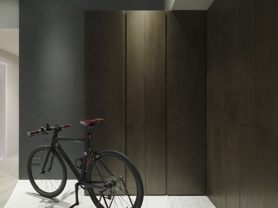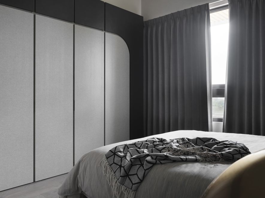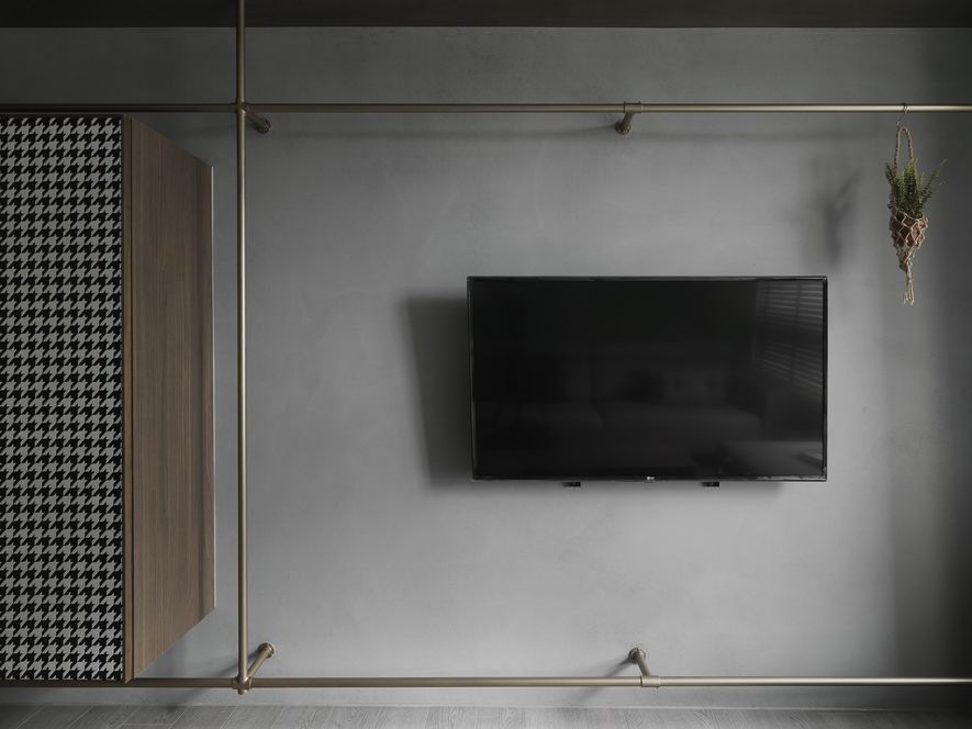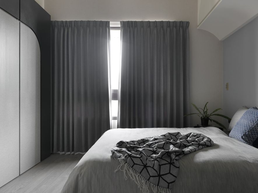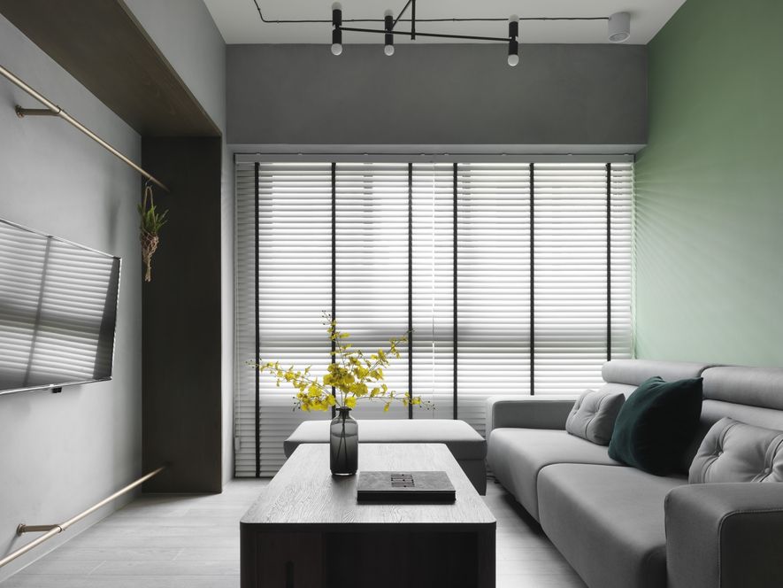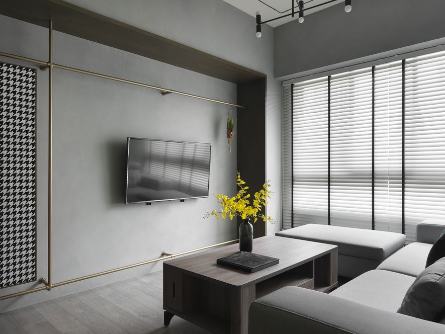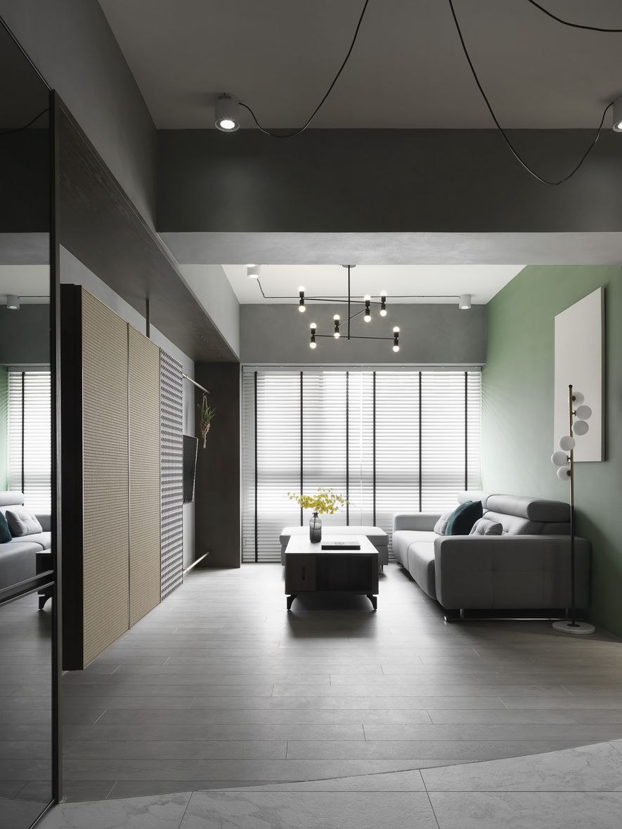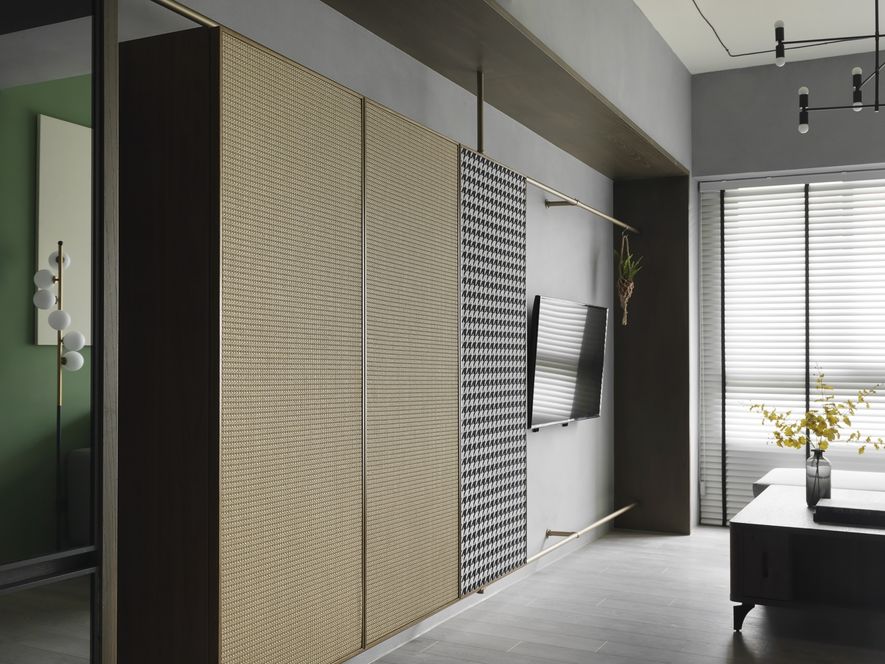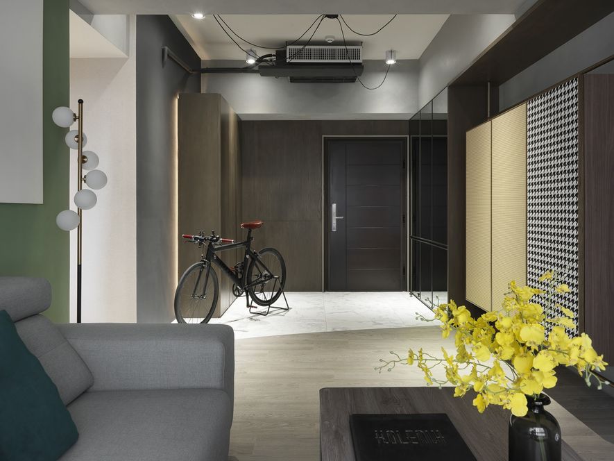 因應業主獨特風格的需求下,我們將空間以冷色系為主,結合木地板,讓空間色系達到平衡,玄關以圓弧取代菱角,讓小空間客廳視覺放大,利用藤片及千鳥格紋收納櫃體讓空間更為別緻。