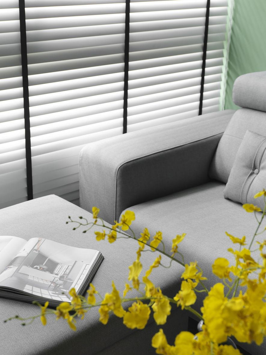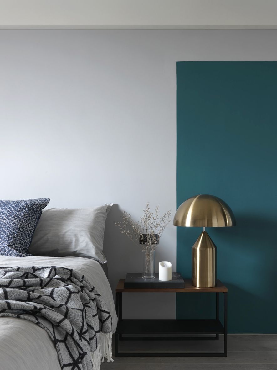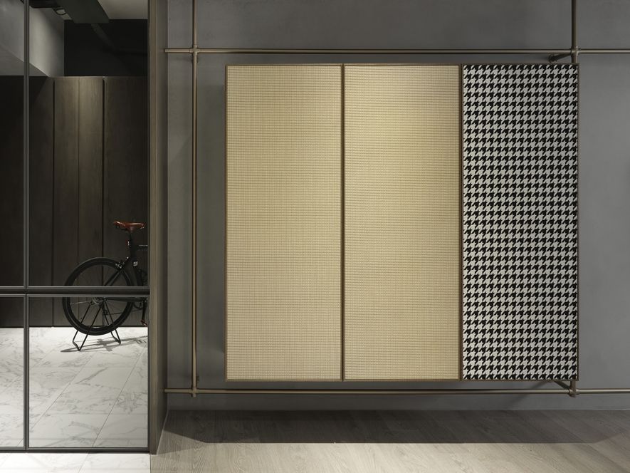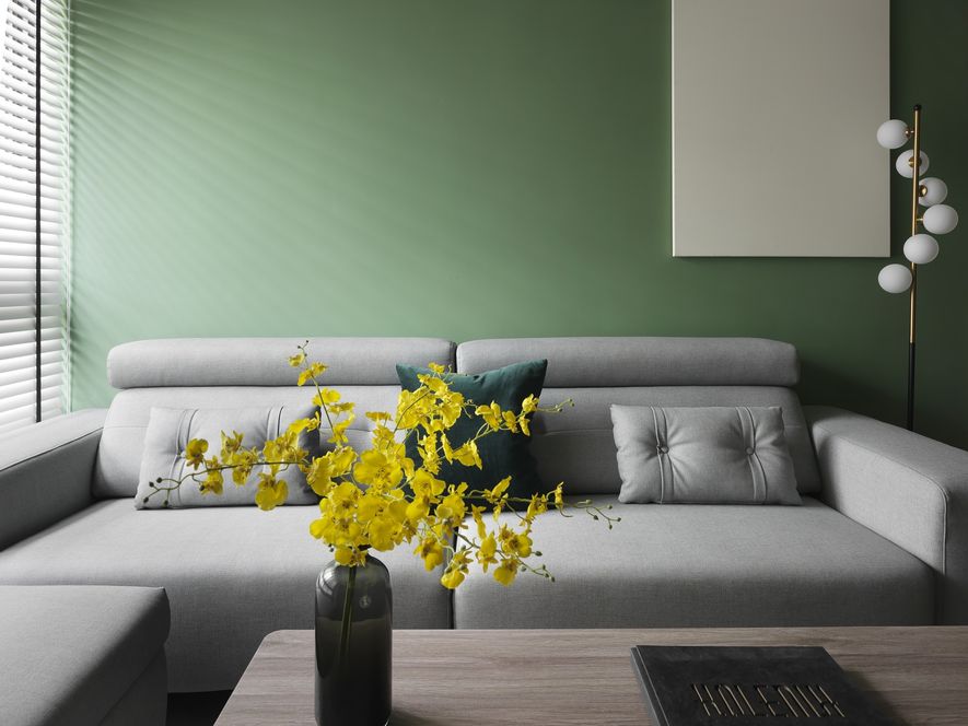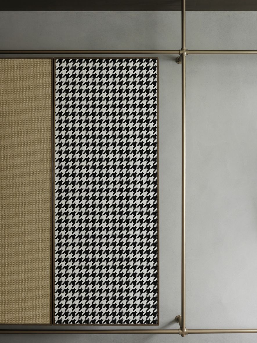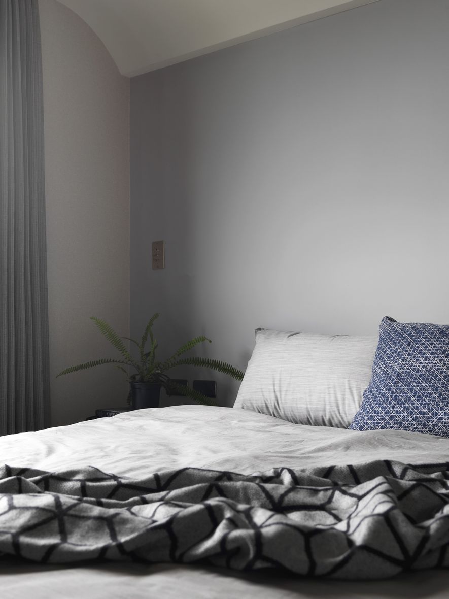 因應業主獨特風格的需求下,我們將空間以冷色系為主,結合木地板,讓空間色系達到平衡,玄關以圓弧取代菱角,讓小空間客廳視覺放大,利用藤片及千鳥格紋收納櫃體讓空間更為別緻。