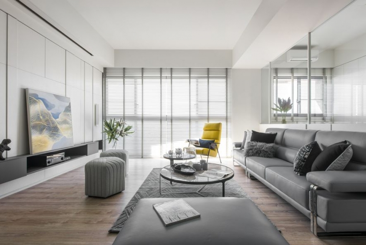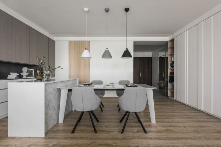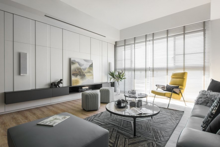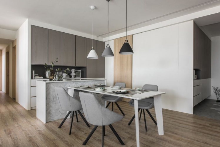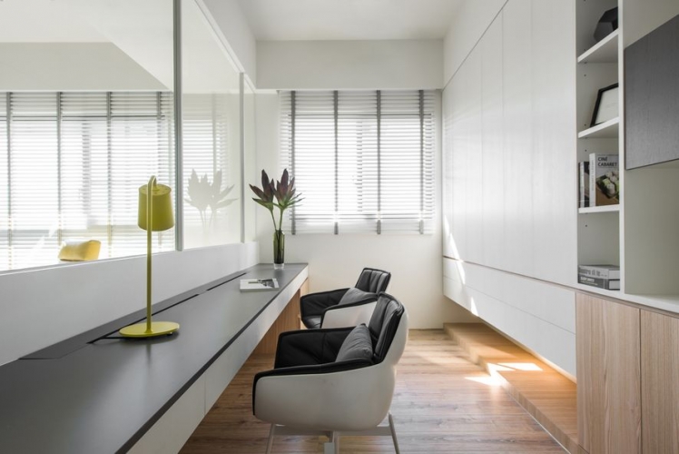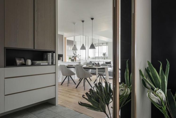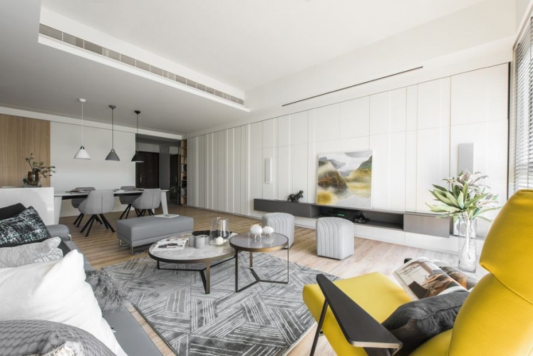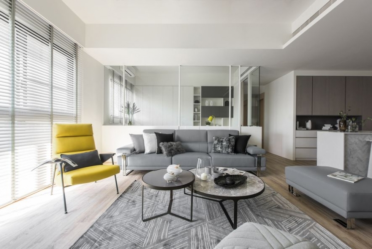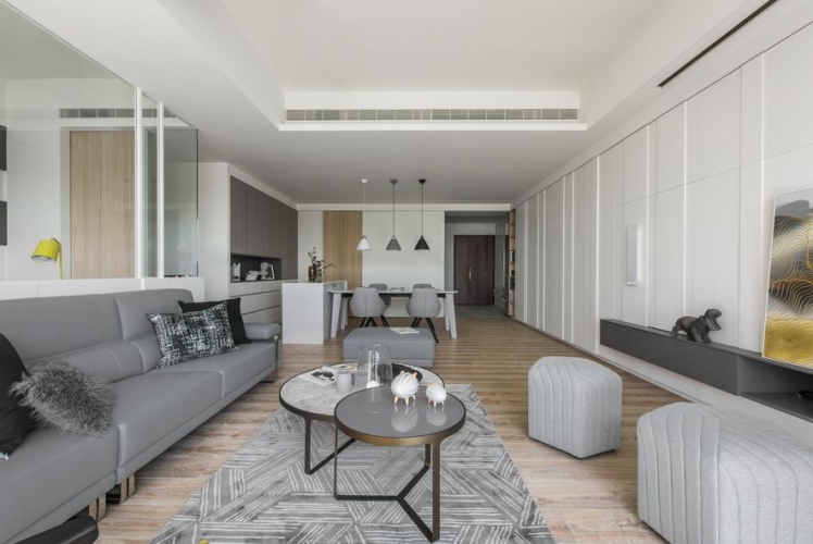 主要公領域空間利用玻璃減少牆壁,使得空間不再封閉,進而增添通透感,整體空間平衡舒適。私領域空間依舊以淺色為基底,配上各有特色的軟裝,所有空間融洽舒適。