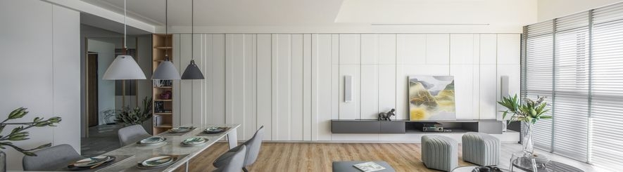 比起華麗耀眼的房子,業主更希望擁有一間可以將陽光牽引而進的通亮房子,於是我們使用白色光潔的壁面,以淺色的木地板為基底,輕淺色調使得空間更為清爽,徐徐暖陽透過大片落地窗進到屋內。
