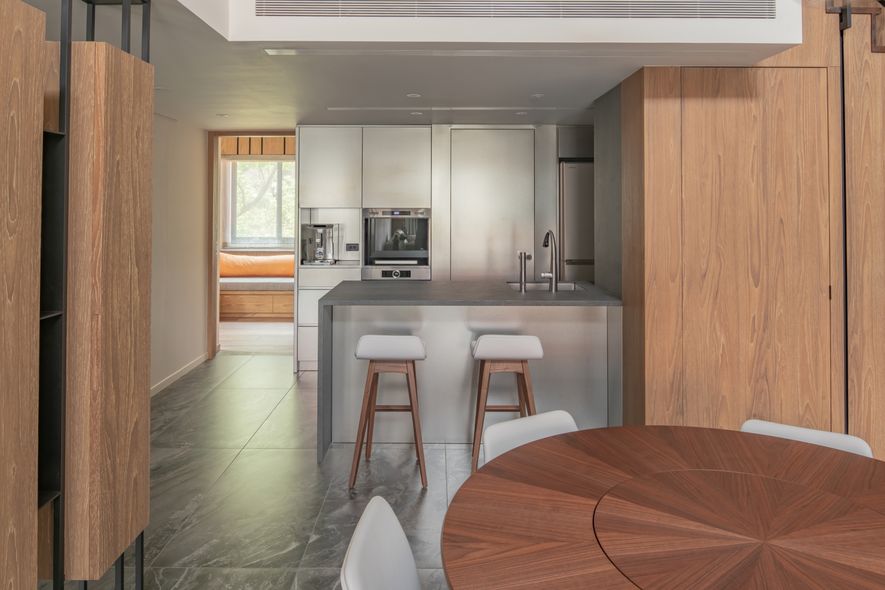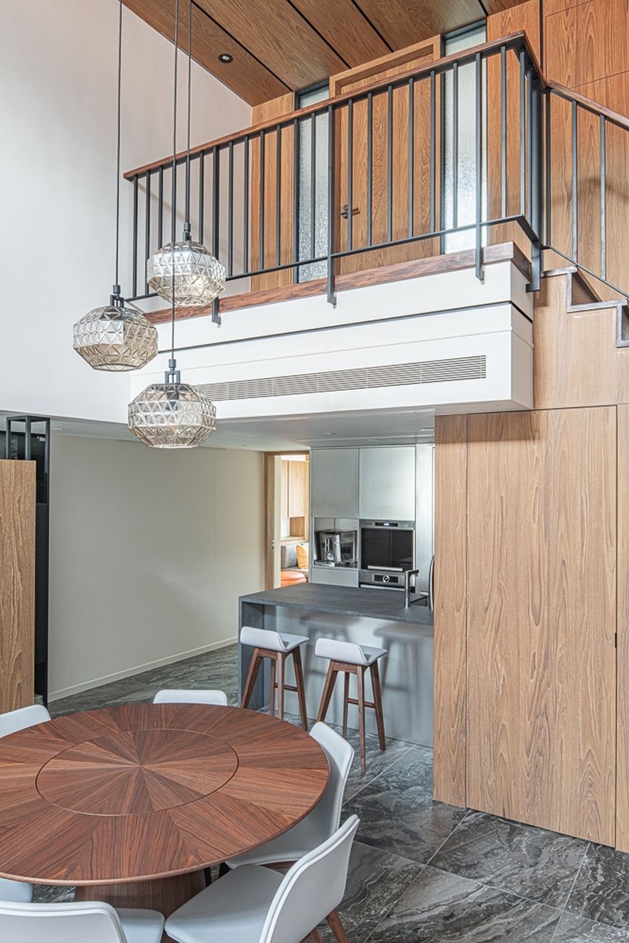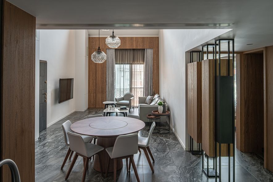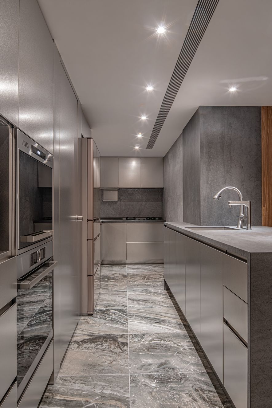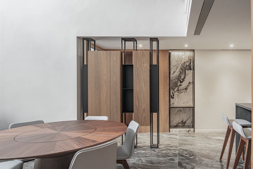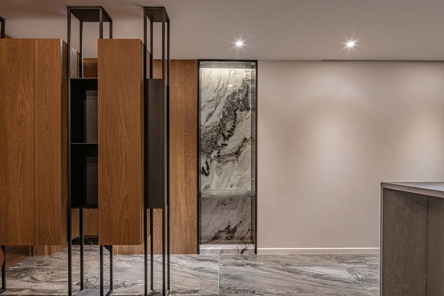鐵件,大理石,噴漆,特殊玻璃,編織壁布,胡桃木實木地板