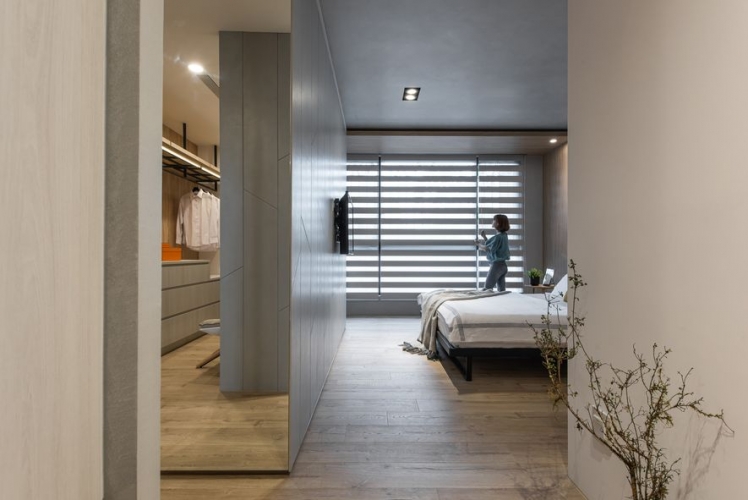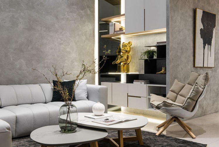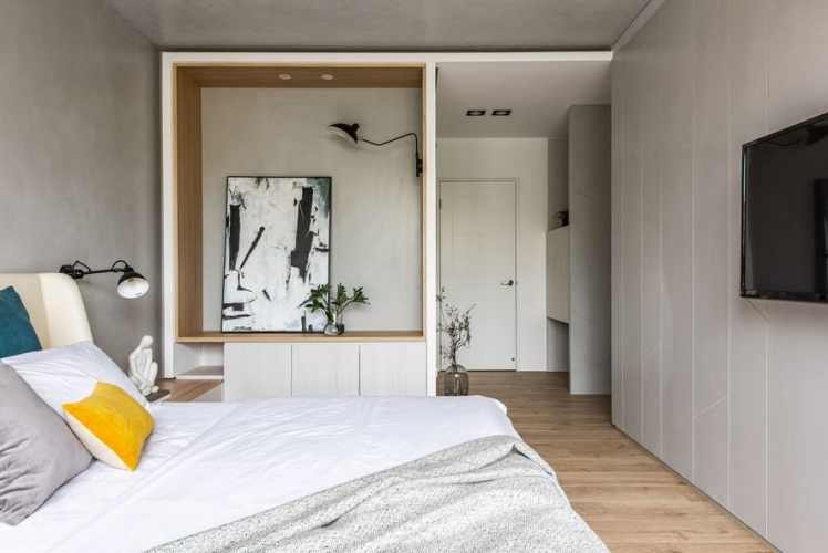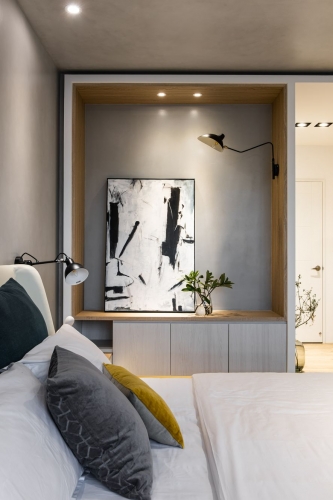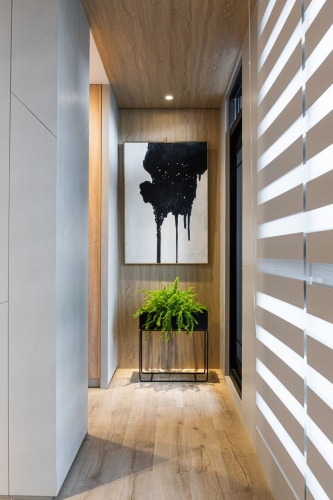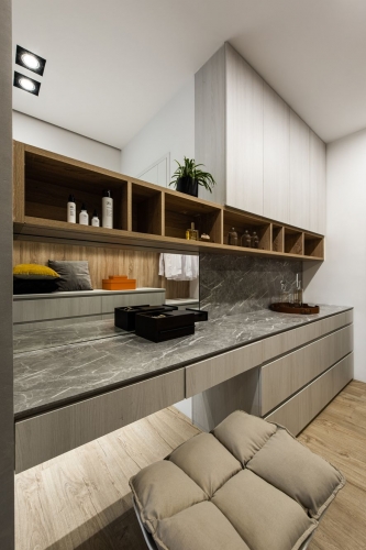 男女主人希望打造一個採光好、通風好、燈光好的陽光住宅,讓一家人能夠舒心的同住在此。因此設計師綜合系統櫃、鐵件、透明壓克力板等材料,輔以柔和的燈光設計,使櫃體跳脫舊有框架,富有立體感及層次感;男主人的收藏品及女主人的獎盃,在燈光的聚焦下,紛紛散發閃亮光芒。