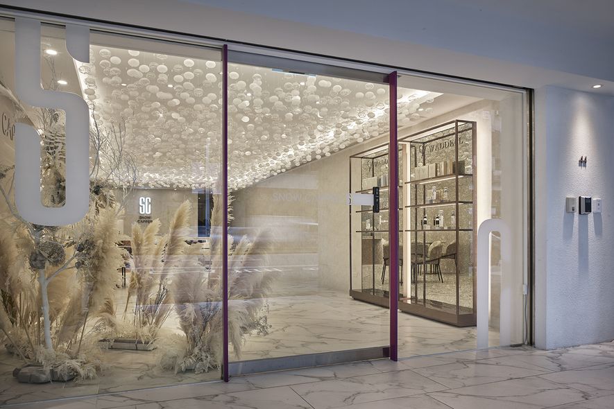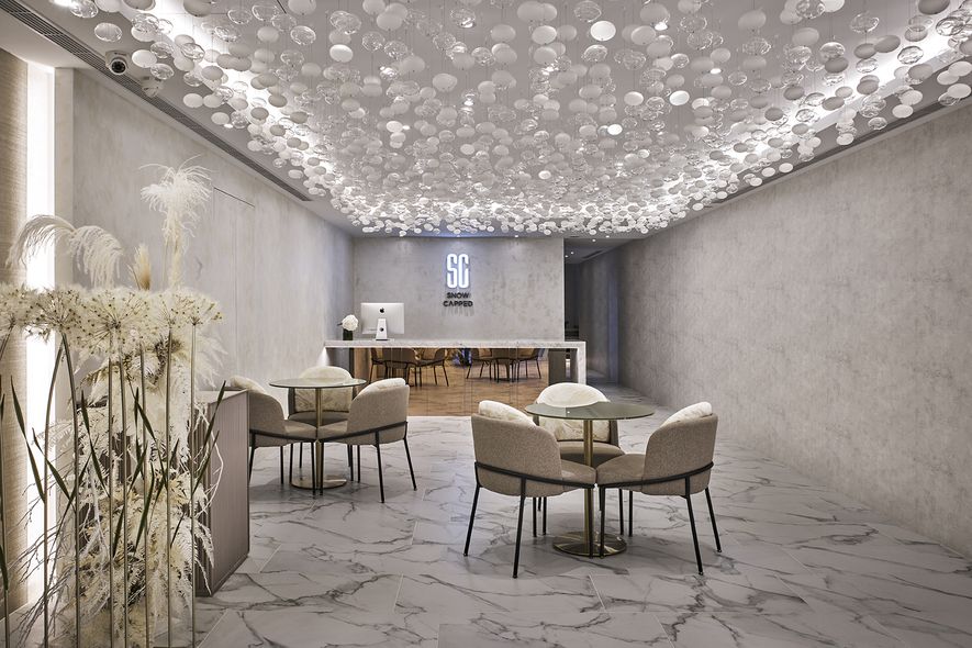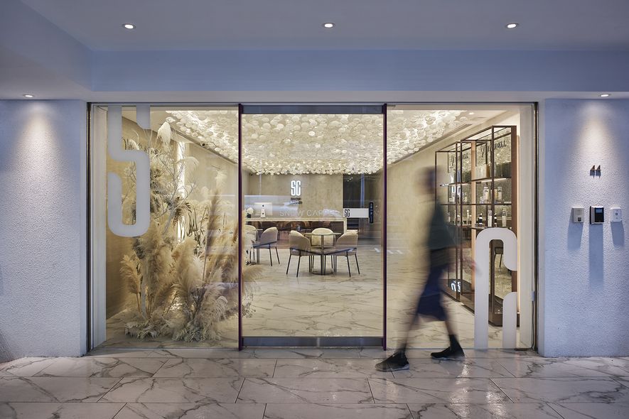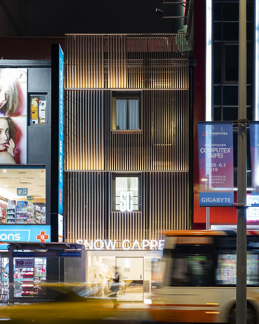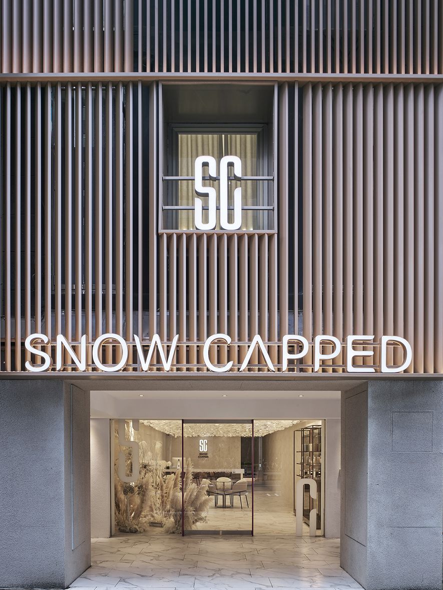 SNOW CAPPED 科技美容旗艦館,座落於台北市西區精華地帶。三層樓老建築, 在經過建築結構及基礎工程加強並重建、及外觀重新拉皮整理後,前後費時約莫一年的時間中,設計團隊用理性思路籌理建築外觀與室內設計,從簡單、俐落的線條秩序對比光影脈絡強化層次間的虛實關係,在翻新規劃的解構概念裡,續引流行時尚,預留美好願景。