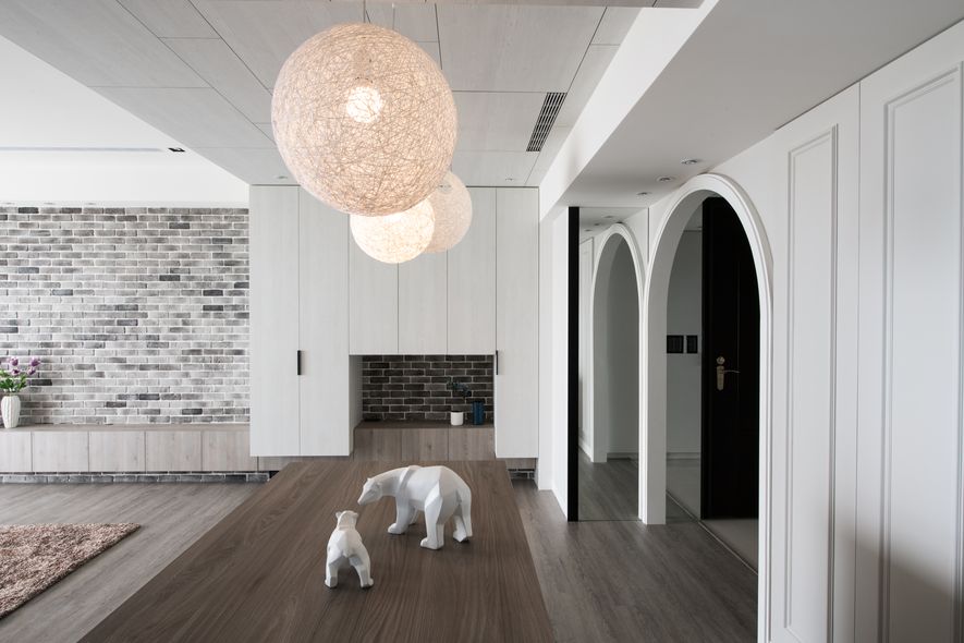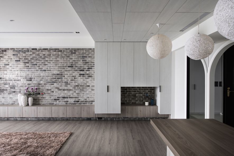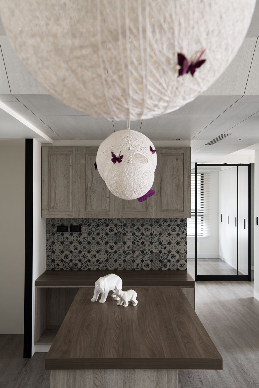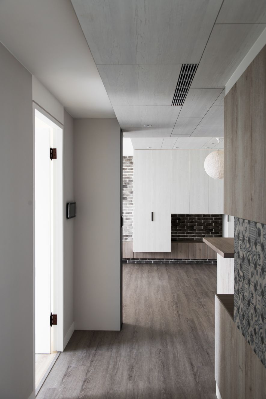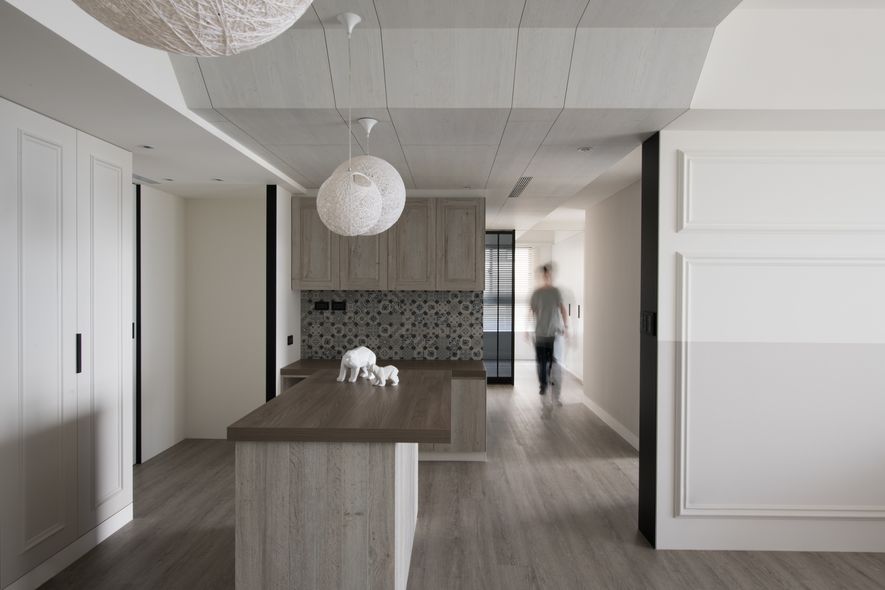 吧檯區高櫃材質的延伸至天花板,甚至延伸至走廊,創造視覺的加大,直向拉長空間