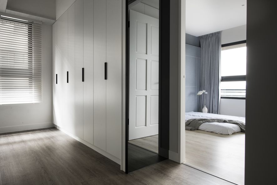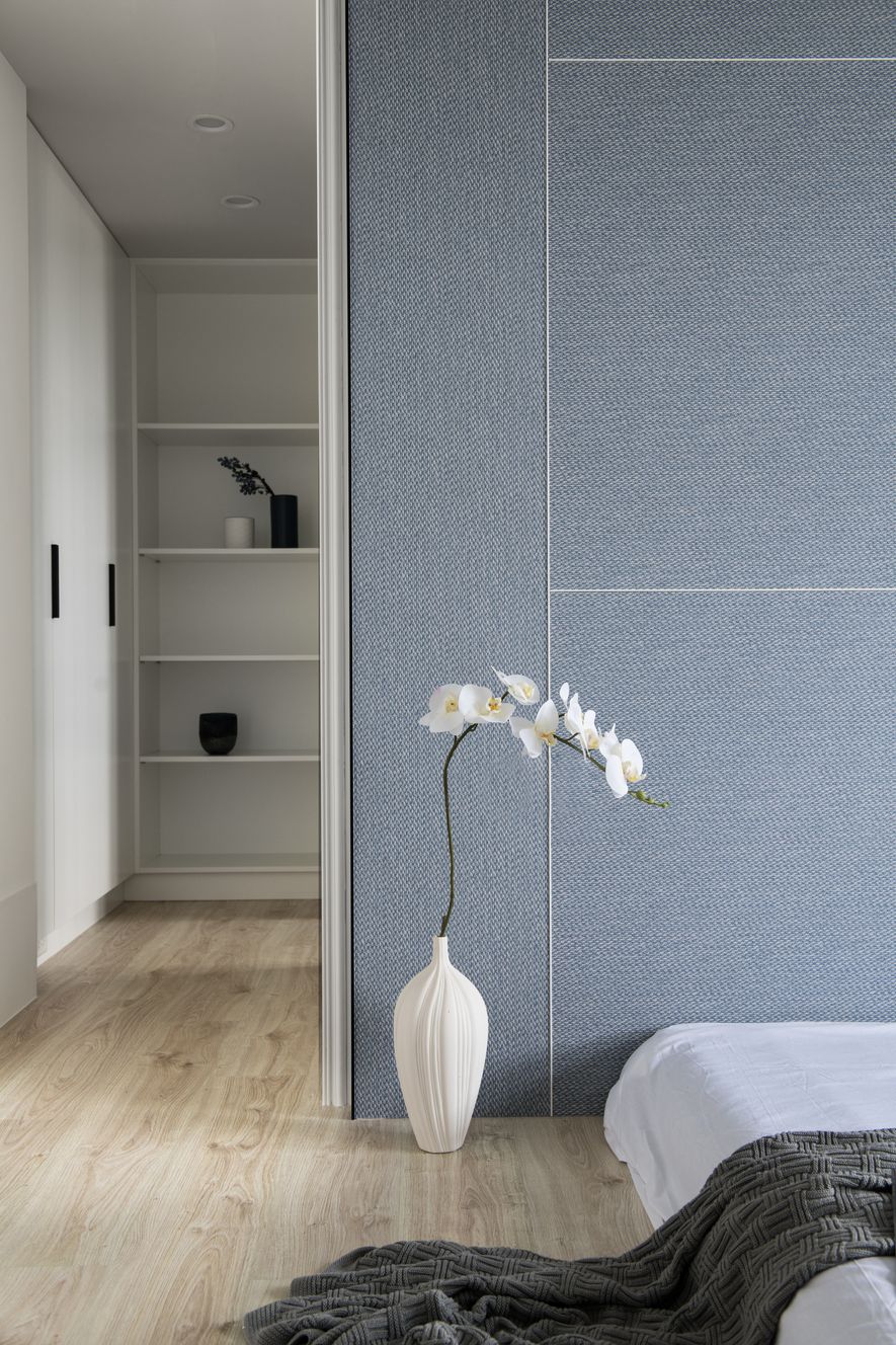 主臥藍色壁布與白色鐵件的精緻對比,感受床頭的細節