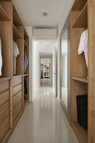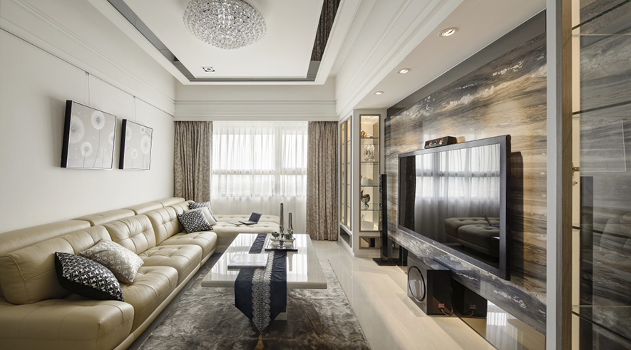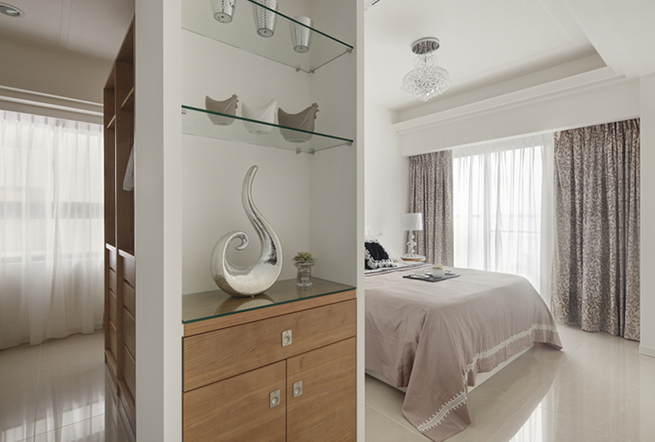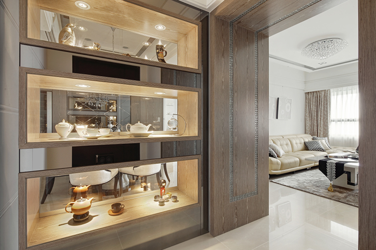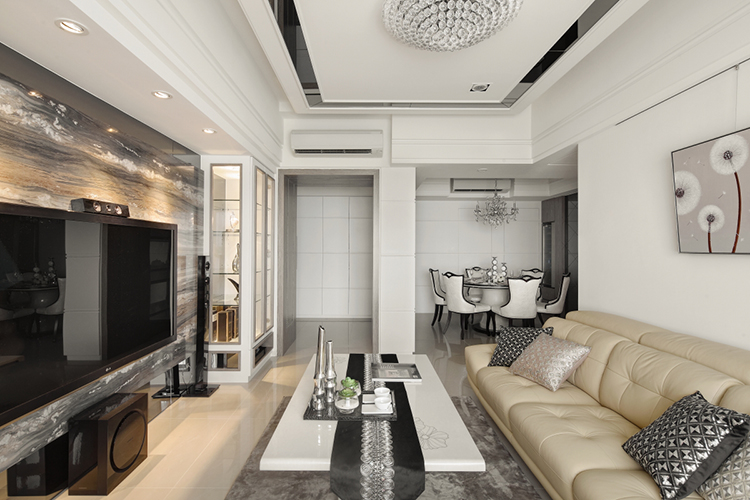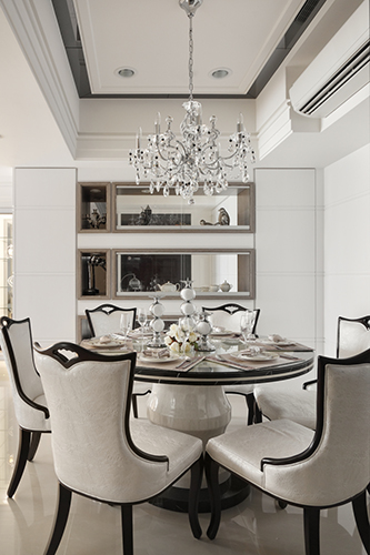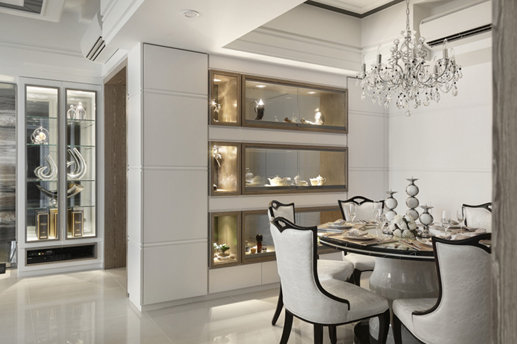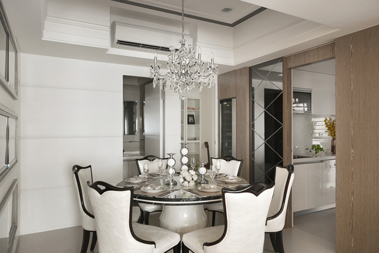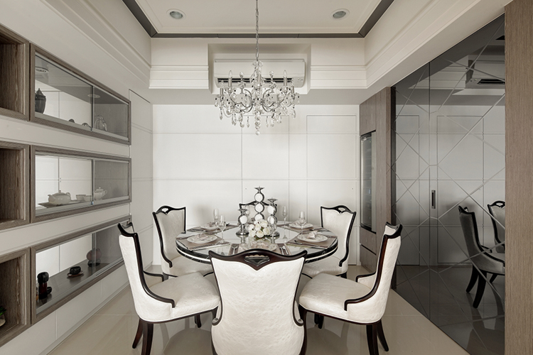 新新古典以夾板堆疊豐富了天花層次,更以45度角斜面取代了圓弧線板,簡化了新古典繁複的雕花,也改善了新古典多以線板為主而產生潮濕與烤漆龜裂的維護不容易,為整體空間注入純粹簡約的氣質風範。並運用灰鏡的反射效果延伸空間的視覺加上鑽雕的加工法讓此案30坪的小空間擁有低調奢華的生活美學。