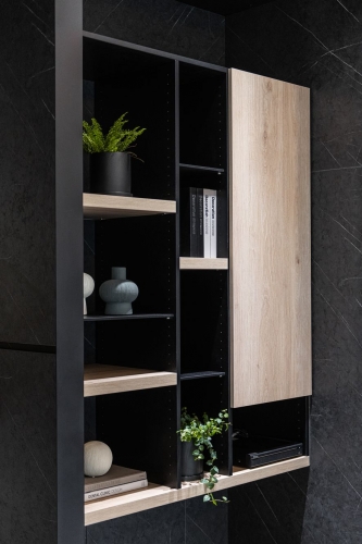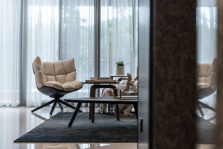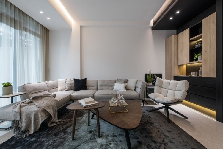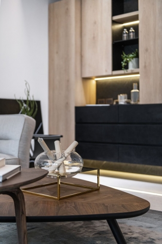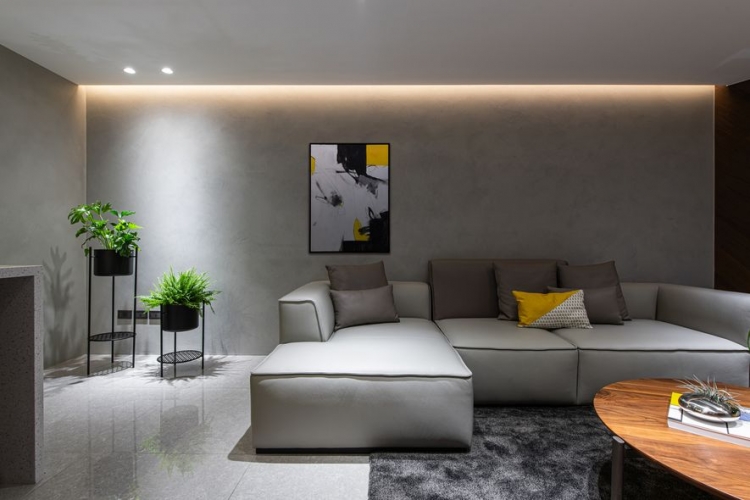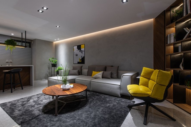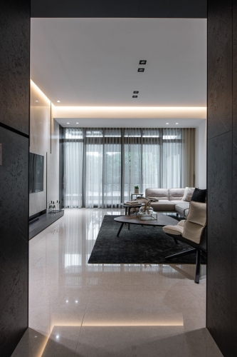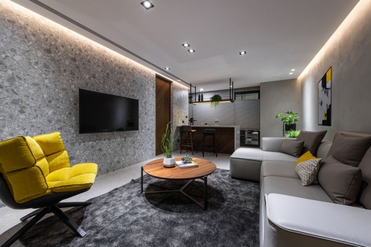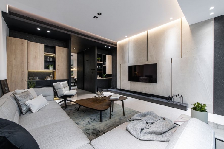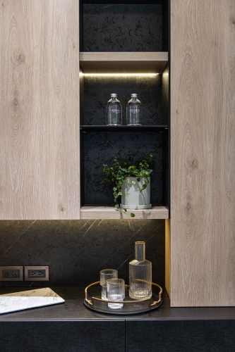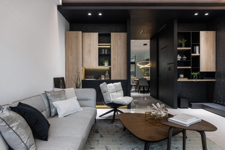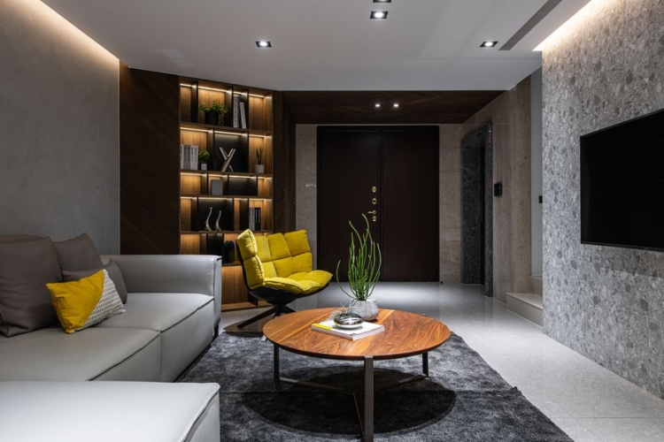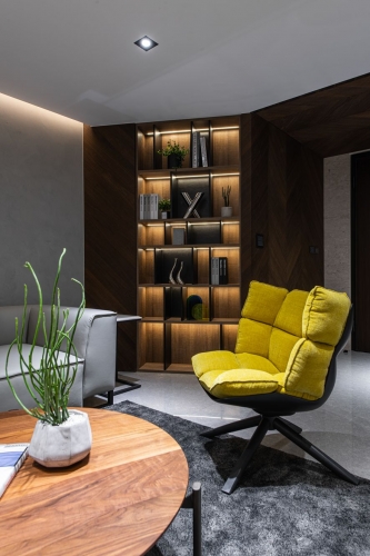 這是一個已經交屋的成屋,格局也是傳統的設計。但入主者是一對年輕的新婚夫妻,設計師希望在既定的格局下,透過設計和建材,讓整個空間年輕化、更有設計感。因此在一樓打造一個類似酒館中島的視聽室,回家一進門,可在此沉澱、轉換心情後再上樓,朋友來訪時也能在此舒適的聊天喝東西,是運用度很廣的一個空間。