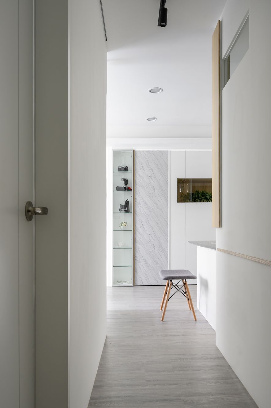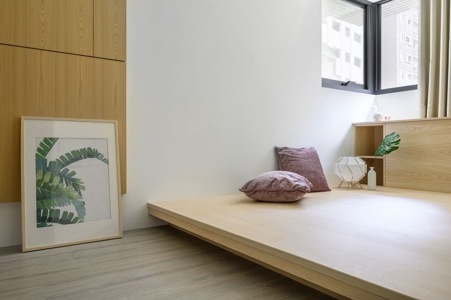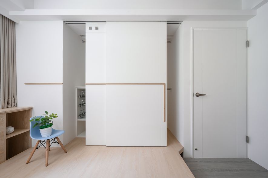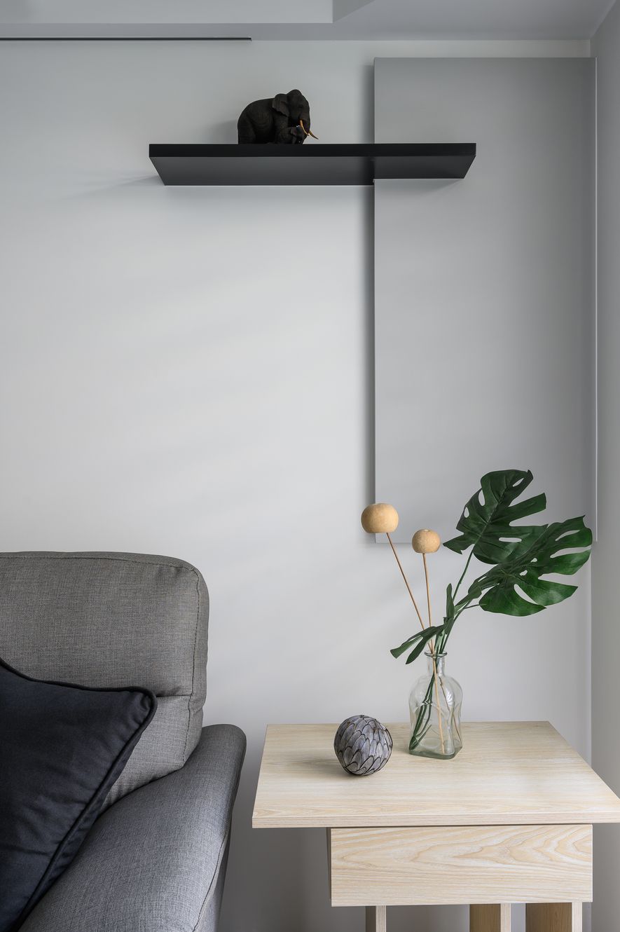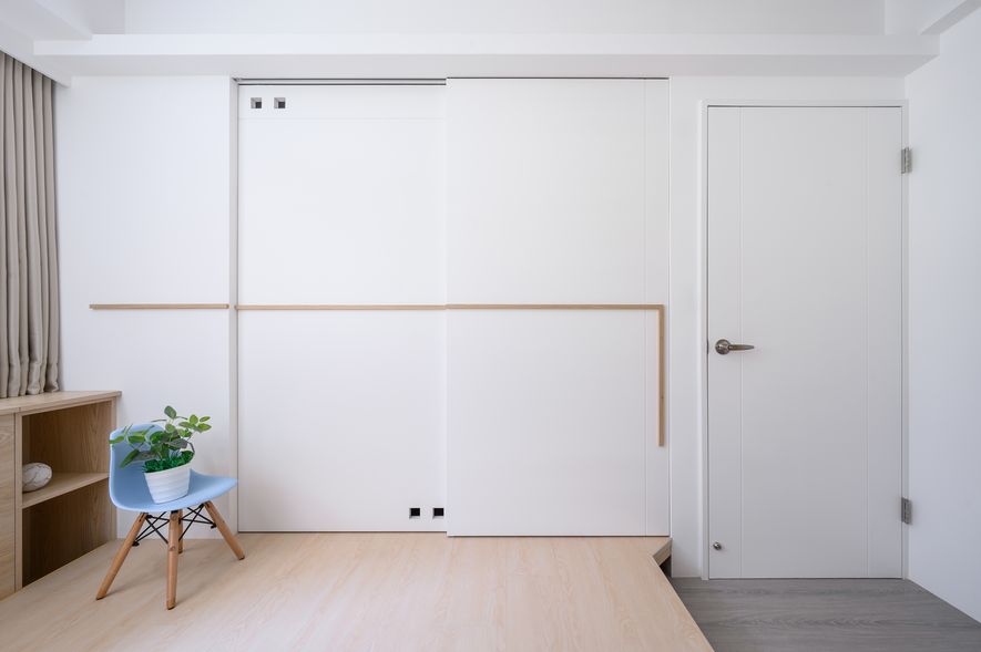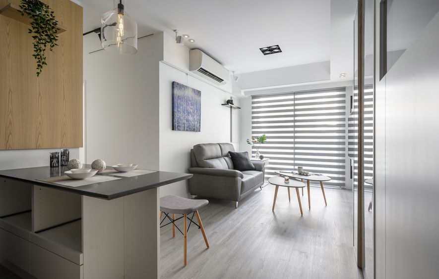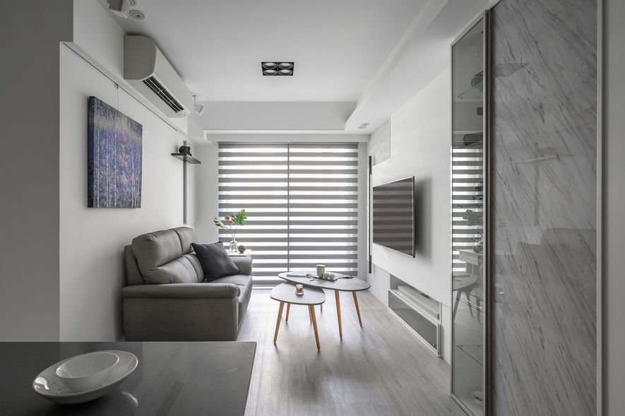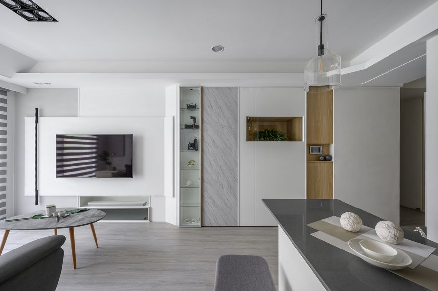 以純凈的白色調為基底,搭配溫潤的自然木質紋路地板鋪設整體空間,營造出寬敞明亮的居家氛圍。灰色沙發的沉穩調性與白色對比,增強視覺衝擊力。大面落地窗設計,擺設簡單的小家具,一旁再放置幾盆清新綠植,散發著自然氣息,亦能感受光的溫暖。室內坪數雖小,透過巧妙的動線規劃,以及簡約的設計風格,亦能創造出大坪效收納。