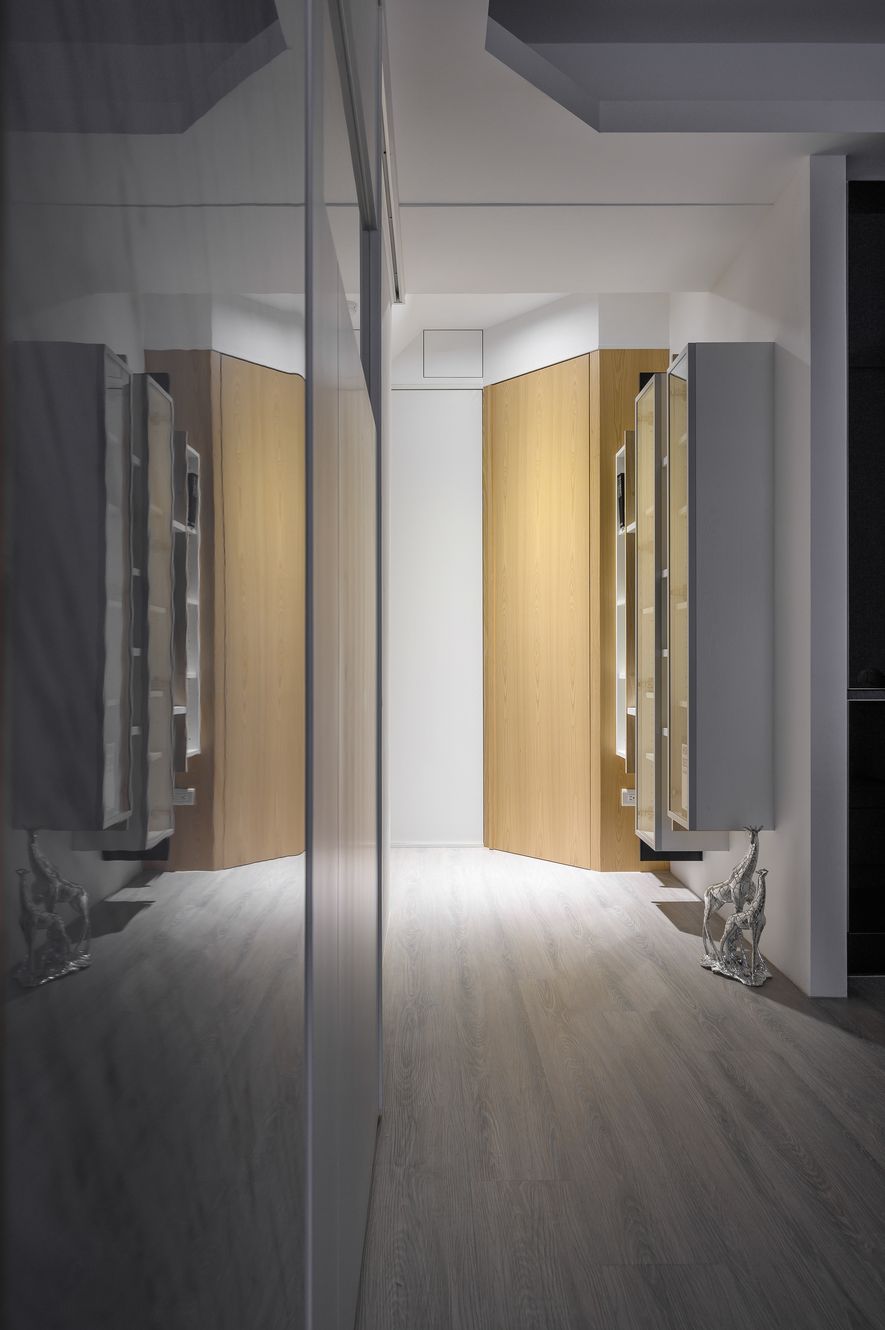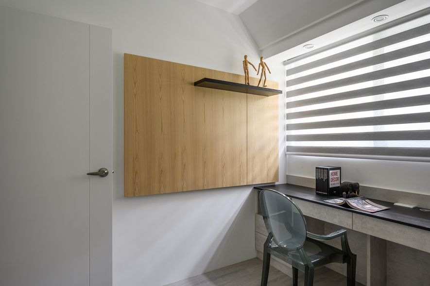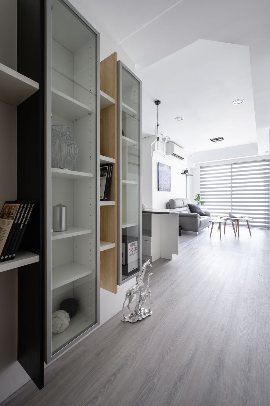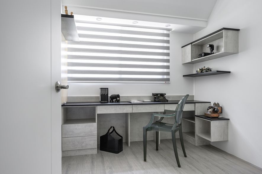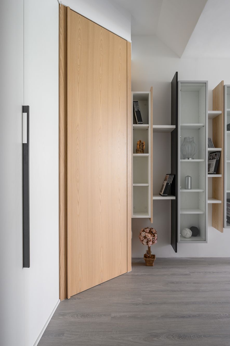 以純凈的白色調為基底,搭配溫潤的自然木質紋路地板鋪設整體空間,營造出寬敞明亮的居家氛圍。灰色沙發的沉穩調性與白色對比,增強視覺衝擊力。大面落地窗設計,擺設簡單的小家具,一旁再放置幾盆清新綠植,散發著自然氣息,亦能感受光的溫暖。室內坪數雖小,透過巧妙的動線規劃,以及簡約的設計風格,亦能創造出大坪效收納。